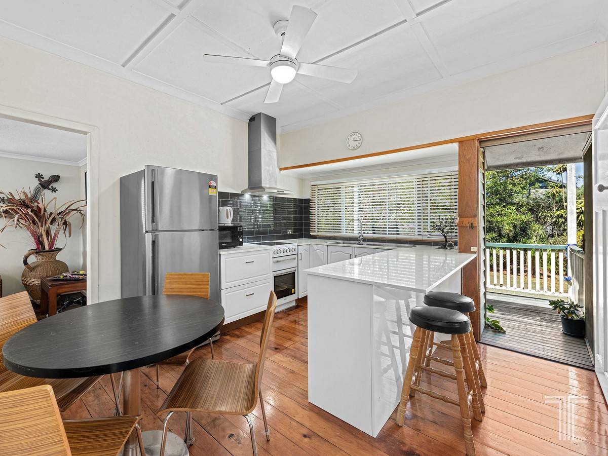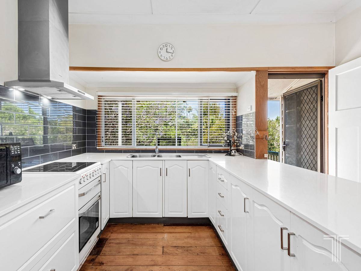 Entering from the front verandah, the interiors boast natural light, timber floors and leafy outlooks throughout. Featuring air-conditioning and high ceilings, the spacious lounge room leads into the kitchen and dining area showcasing a bright and airy design, wraparound stone benchtops, a freestanding oven and scenic outlooks across the backyard.