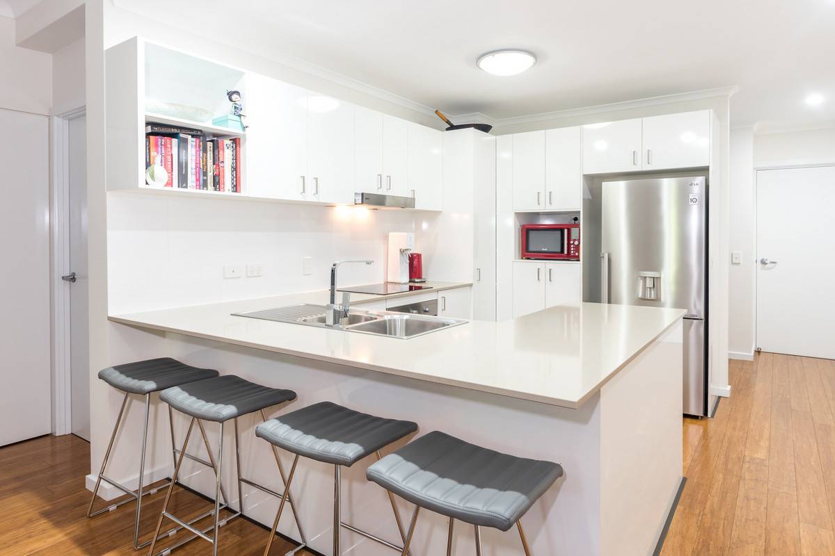 Adjoining the living space, the modern kitchen is appointed with wraparound stone benchtops, stainless steel appliances and a breakfast bar.