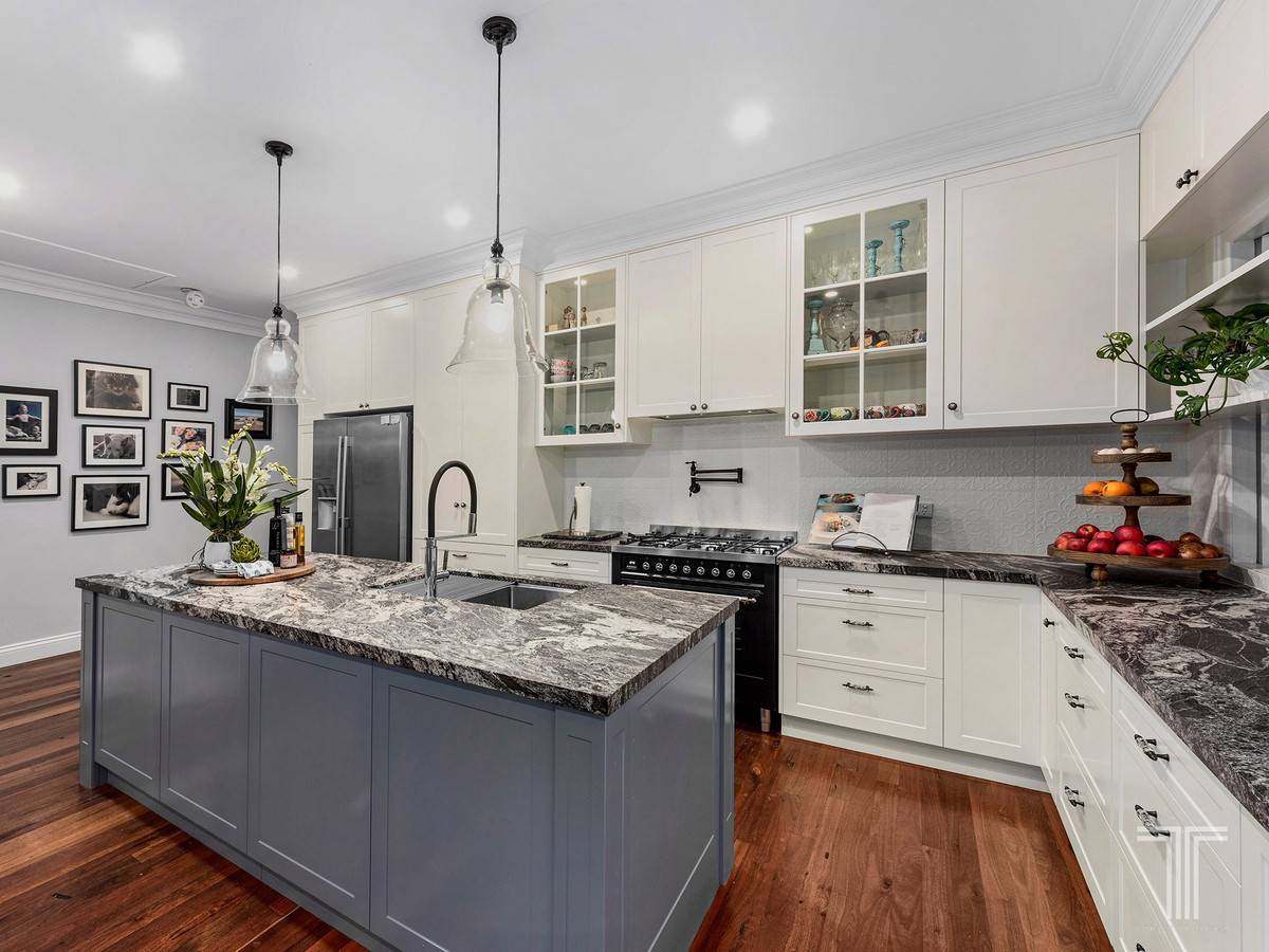 Downstairs features a self-contained retreat revealing a living area with access to the patio and pool, plus a stylish kitchenette with integrated laundry, black jaguar leather granite benchtops, and a 6-burner gas cooktop with hotplate. Hosting a fifth bedroom on this level with an ensuite, walk-in robe and French barn doors, this floor is perfect for teenagers and guests seeking their own space.