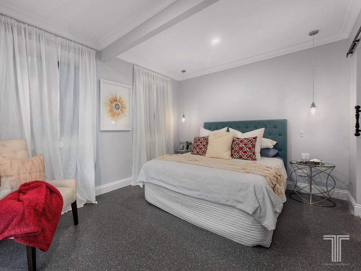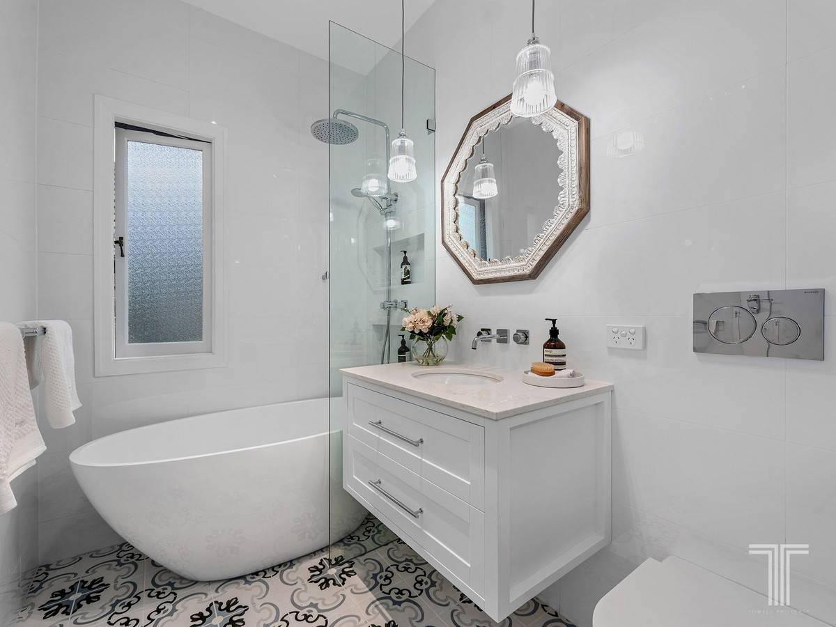 Finalising this stylish level are a master suite and three additional bedrooms with built-in robes. Elegantly designed, the master includes a walk-in robe, French barn doors, access to the balcony and an exquisite ensuite with beautifully patterned floor tiles, a rainfall shower, dual vanities and stone benchtops. Reflecting the same style as the master ensuite, the newly renovated family bathroom features a freestanding bath.