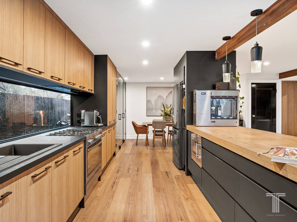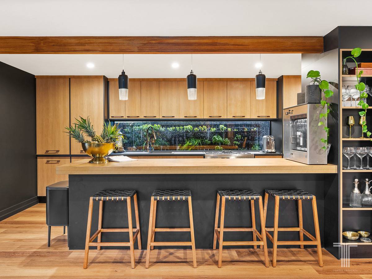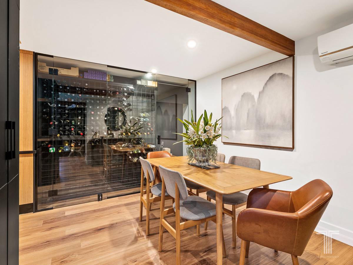 Unveiling a flowing layout across the ground floor, the living and dining area overlooks the glass-framed wine cellar and connects seamlessly with the spacious kitchen showcasing timber cabinetry, large benchtops, a breakfast bar and stainless steel appliances.