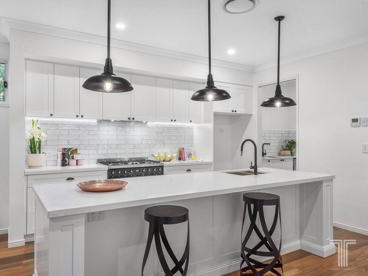 Centrally positioned, the Hamptons style kitchen has been flawlessly appointed. Boasting an oversized island bench, stainless steel appliances, matte black finishes and butler's pantry, no detail has been overlooked.