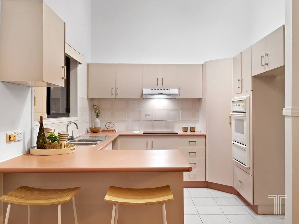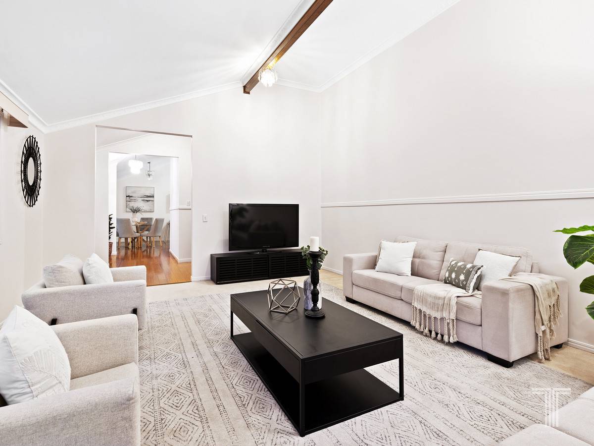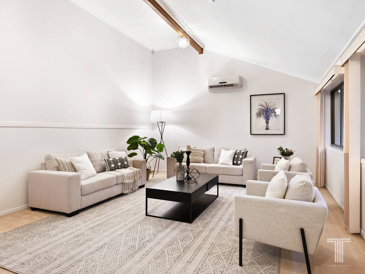 The lounge room offers a spacious and comfortable living zone with soaring ceilings and air-conditioning. Positioned across the entryway, the light-filled dining area adjoins a neat and functional kitchen with a breakfast bar and abundant cabinetry.