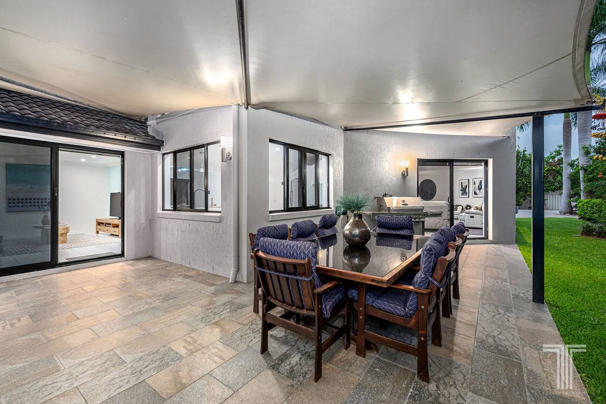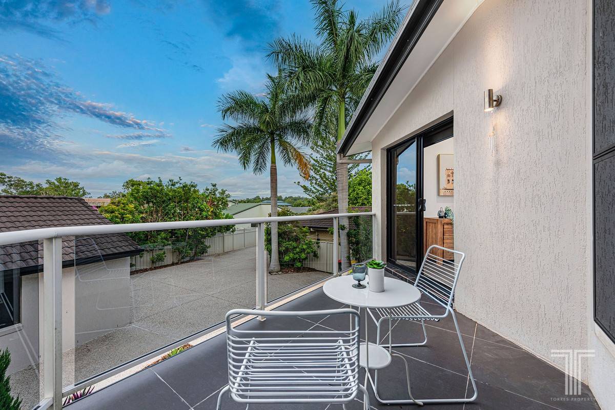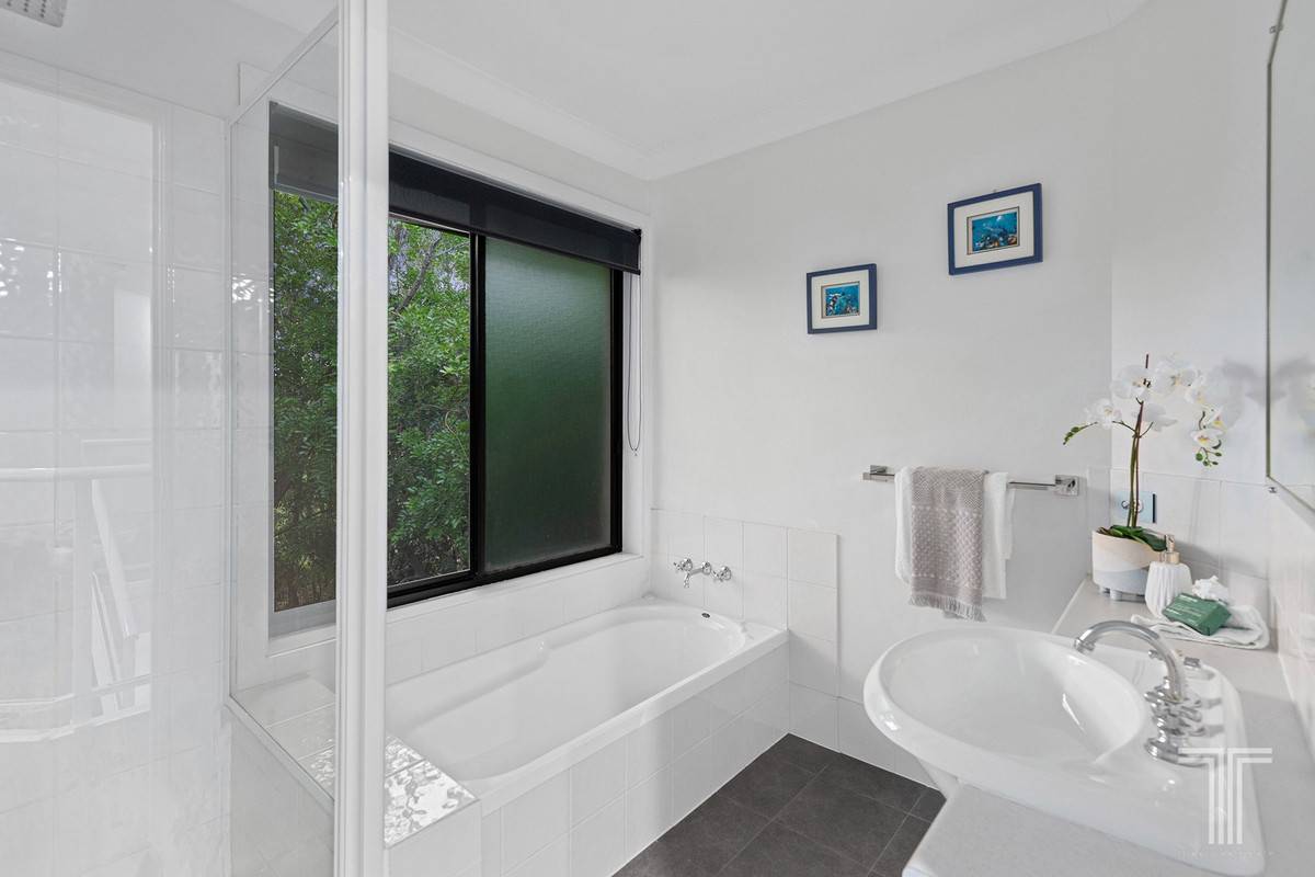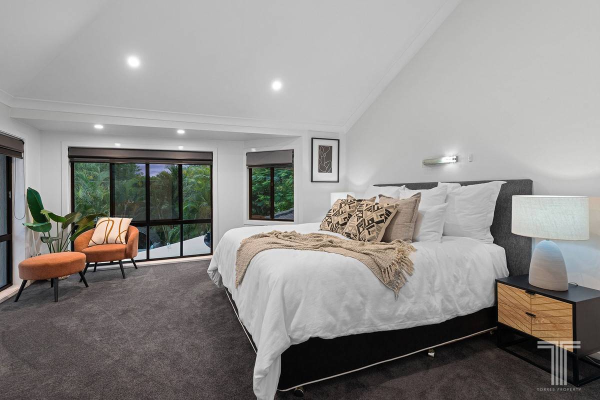 Five generous bedrooms are serviced by three bathrooms. Four bedrooms are positioned upstairs and draw in leafy vistas, creating a sense of peace and privacy. The master boasts air-conditioning, a walk-in robe and an ensuite with a large shower and spa bath. Two bedrooms open to a shared balcony overlooking the palm trees.