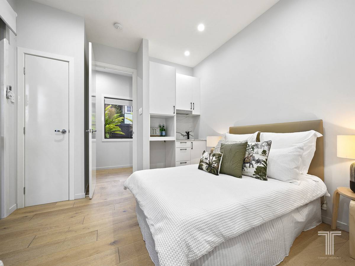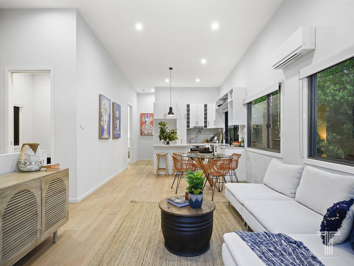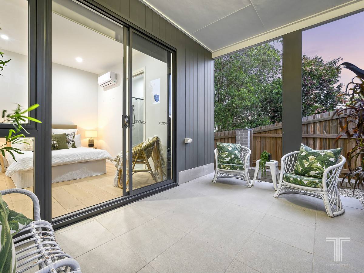Presenting flexibility and separation, a third bedroom/studio downstairs offers private living with a kitchenette, ensuite and sliding glass doors opening to the terrace and courtyard. Complete with a double garage, laundry and air-conditioning, every detail of this townhouse has been meticulously designed.