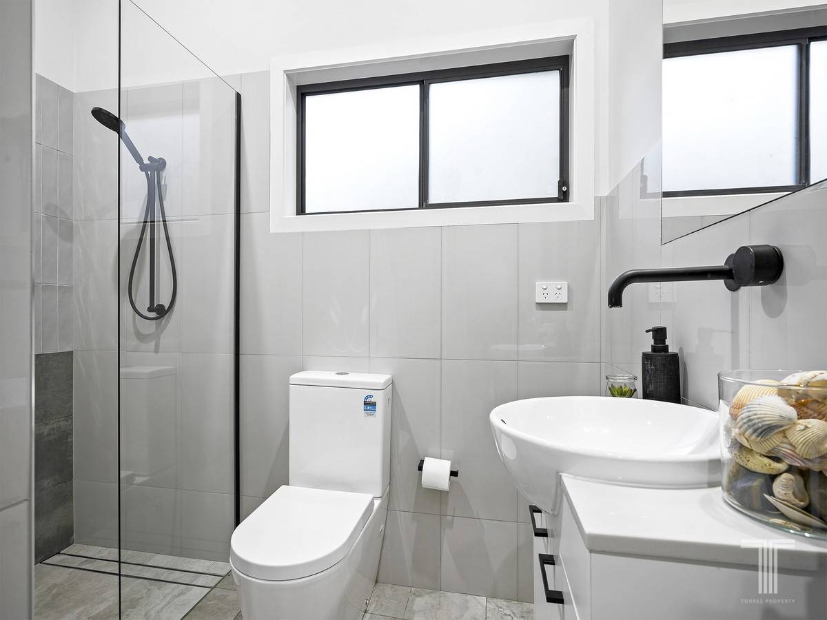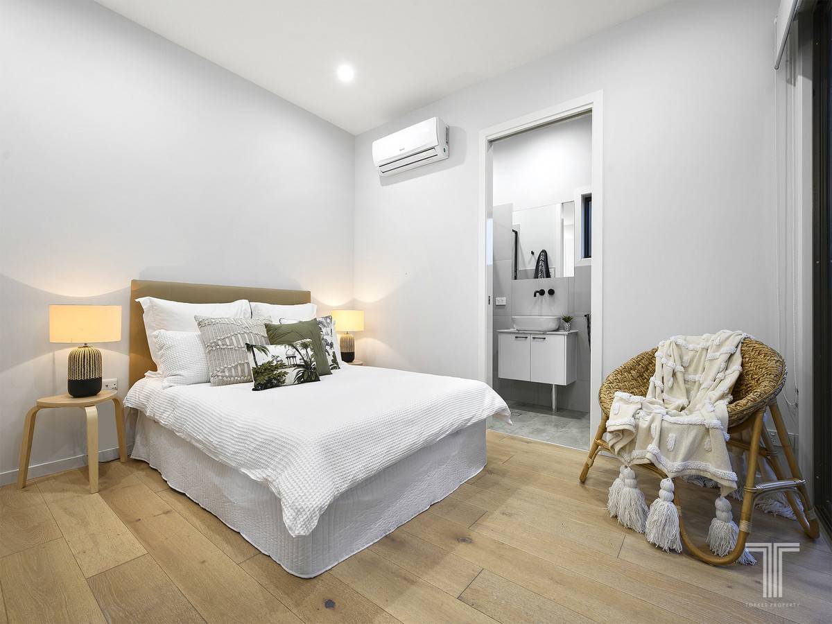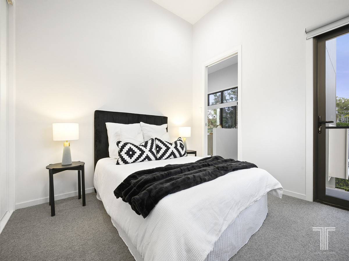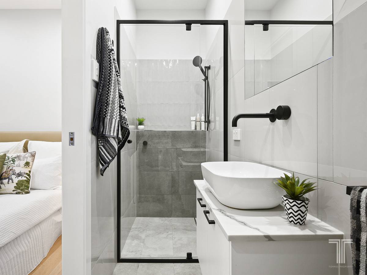 Two bedrooms with built-in robes and two stylish bathrooms with matte black fixtures are also positioned on this floor. The master reveals an exclusive ensuite, while the second bedroom extends to a private balcony.