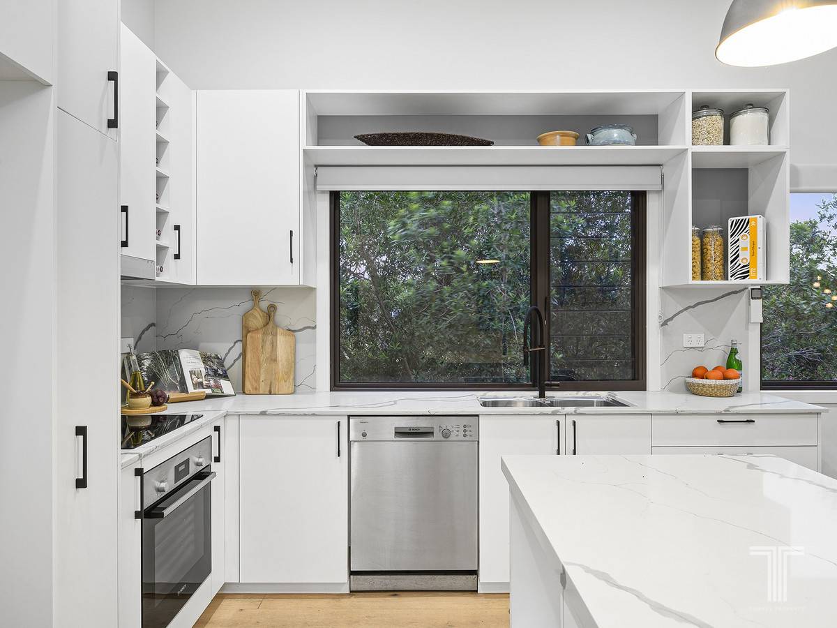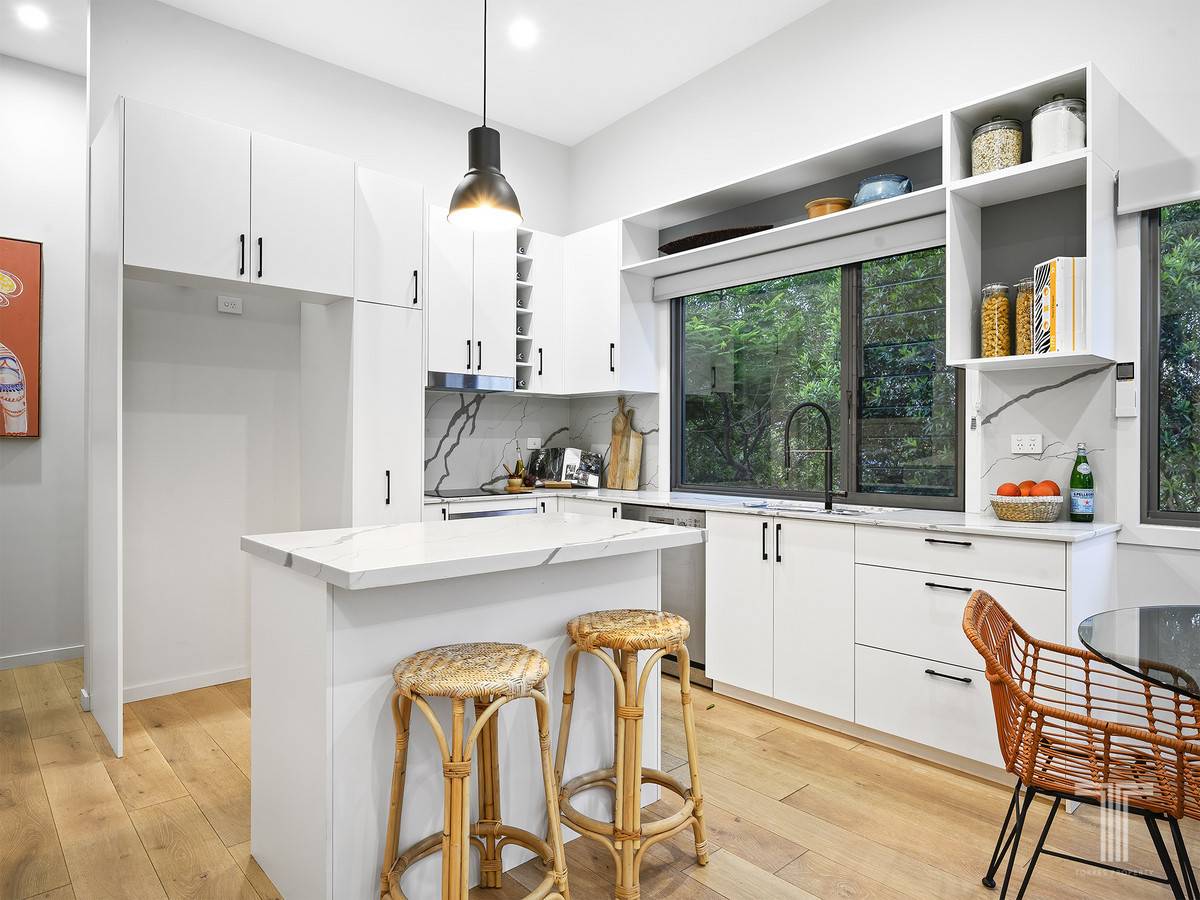 Impeccably appointed, the modern kitchen connects with the living space and features an island bench, abundant cabinetry and a suite of Bosch appliances.
