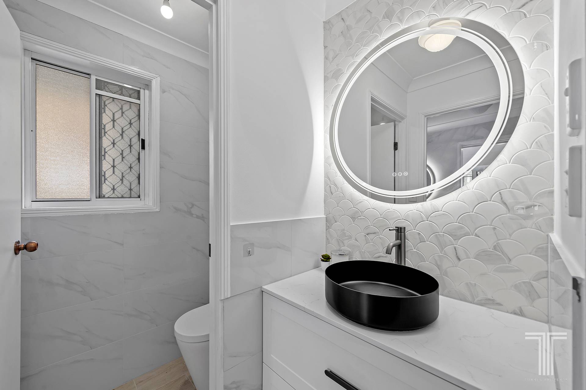 All three bedrooms include built-in robes and access to a renovated bathroom and powder room. The bathroom features two-way access, providing an ensuite off the master bedroom, and displays modern LED mirrors, floating vanities and floor-to-ceiling tiles.