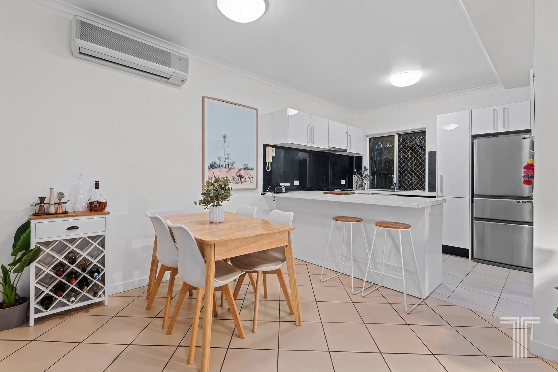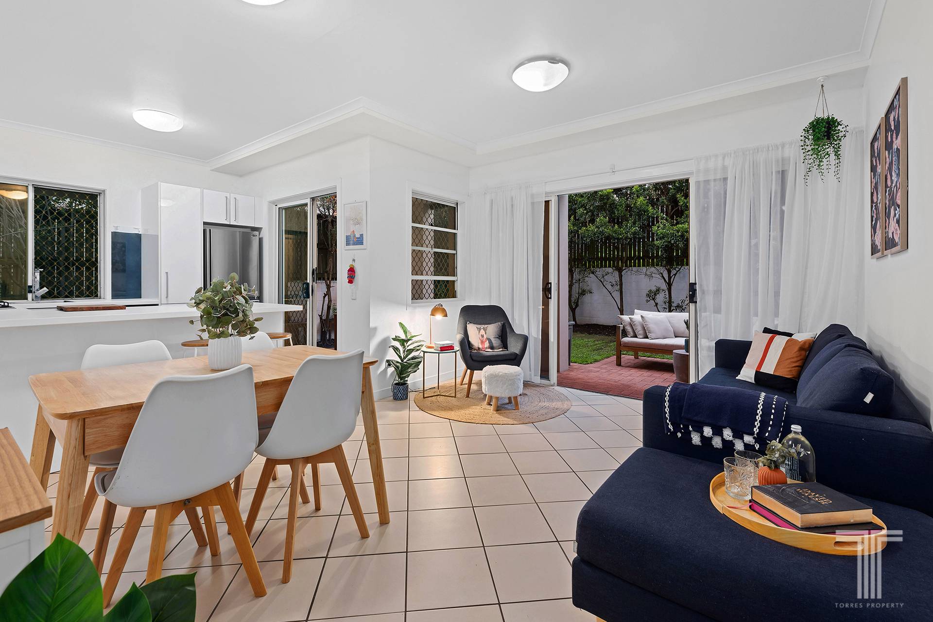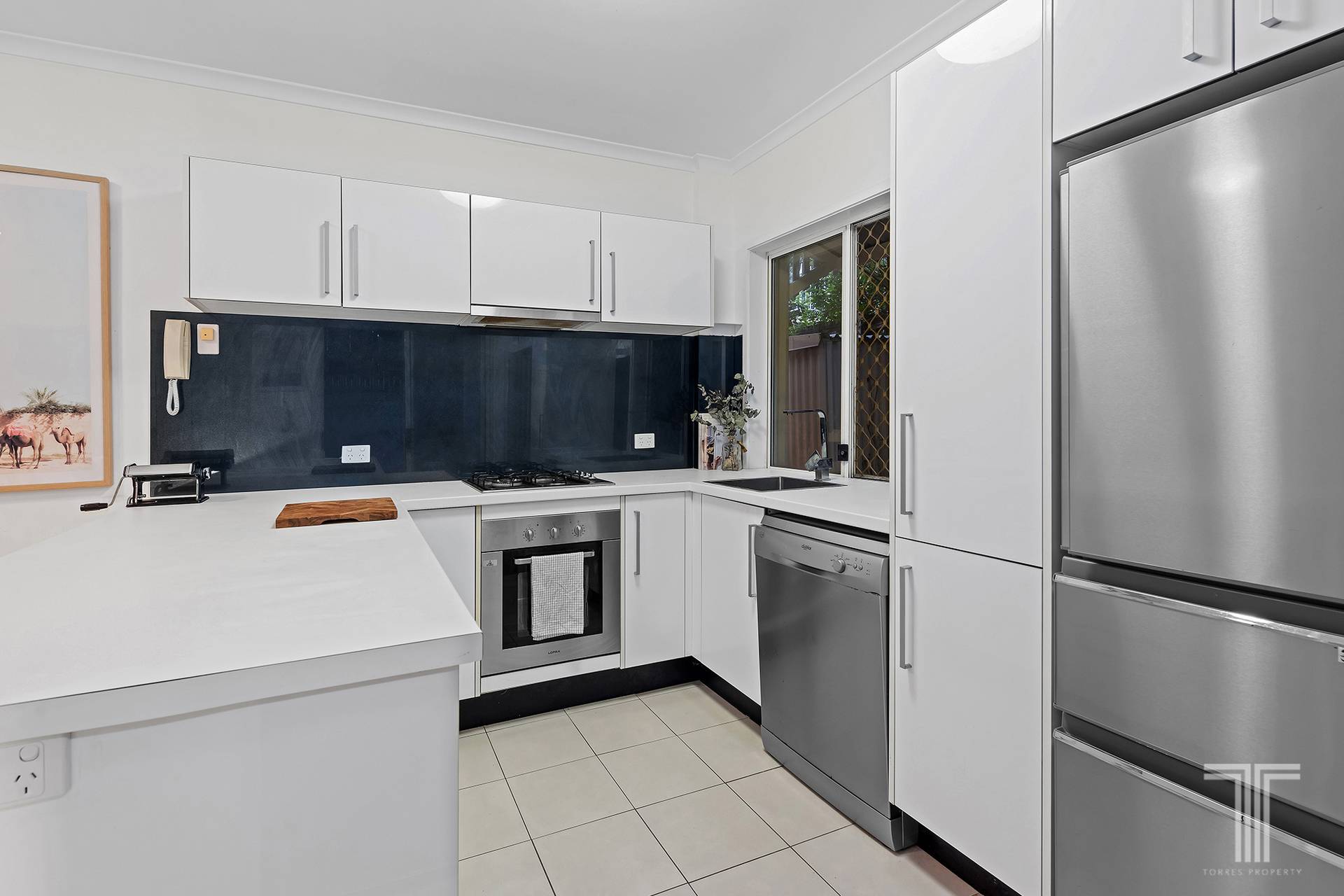 Inside, the open plan living and dining space accompanies a large modern kitchen, finished with tiled floors and neutral interiors. The spacious kitchen offers ample storage capabilities and is well equipped with ample preparation space and a suite of stainless steel appliances.