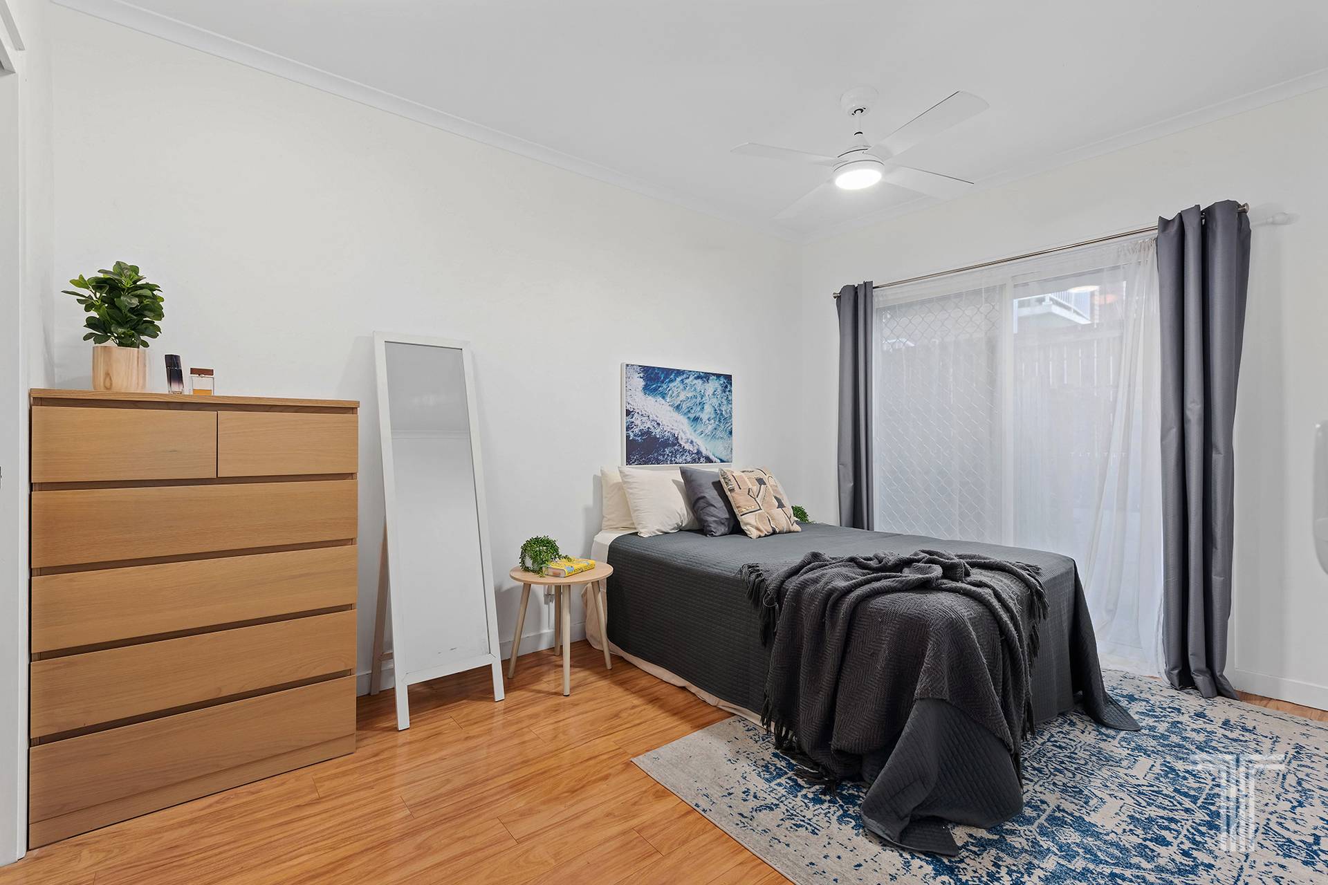 Two generously sized bedrooms and two bathrooms are featured throughout this apartment. Fitted with timber-styled floors, air conditioning and ceiling fans, each bedroom has access to the outside providing light and air flow.