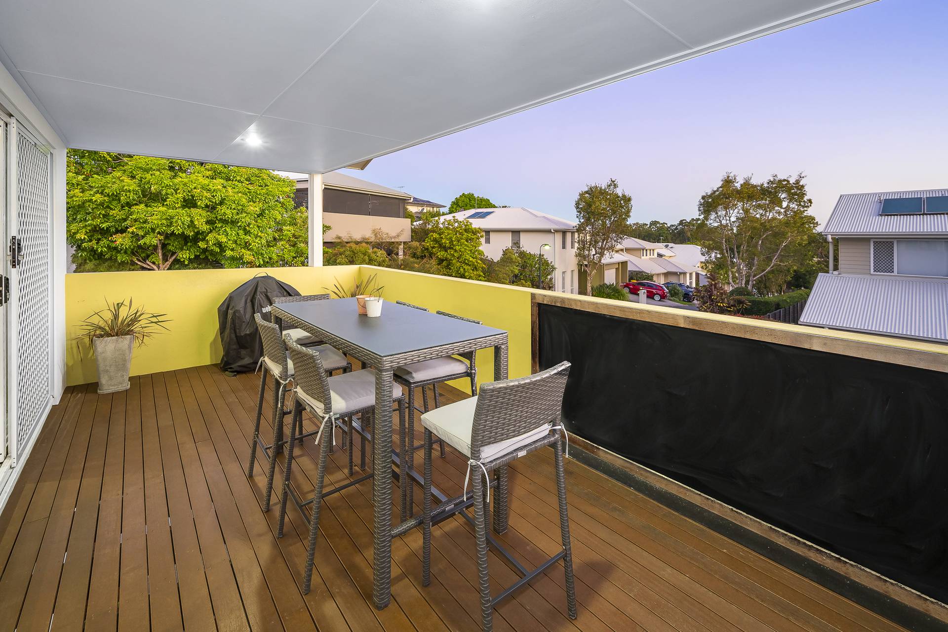 The upper level houses two bathrooms and three bedrooms, all with built-in robes. The master includes an ensuite and an elevated balcony overlooking the yard and gardens below.