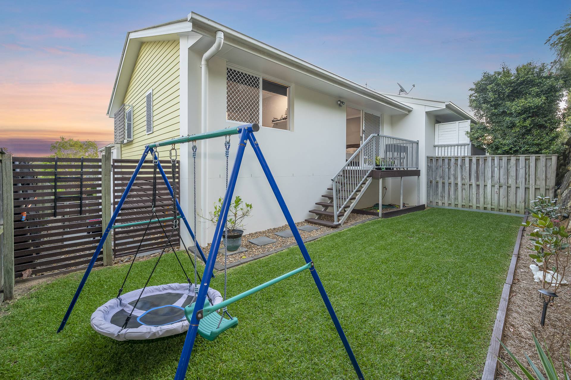 Rear stairs lead to the fully fenced, grassed backyard, perfect for kids to play. A feature rock wall and terraced gardens add greenery and privacy, and a side gate allows for easy access to the yard.