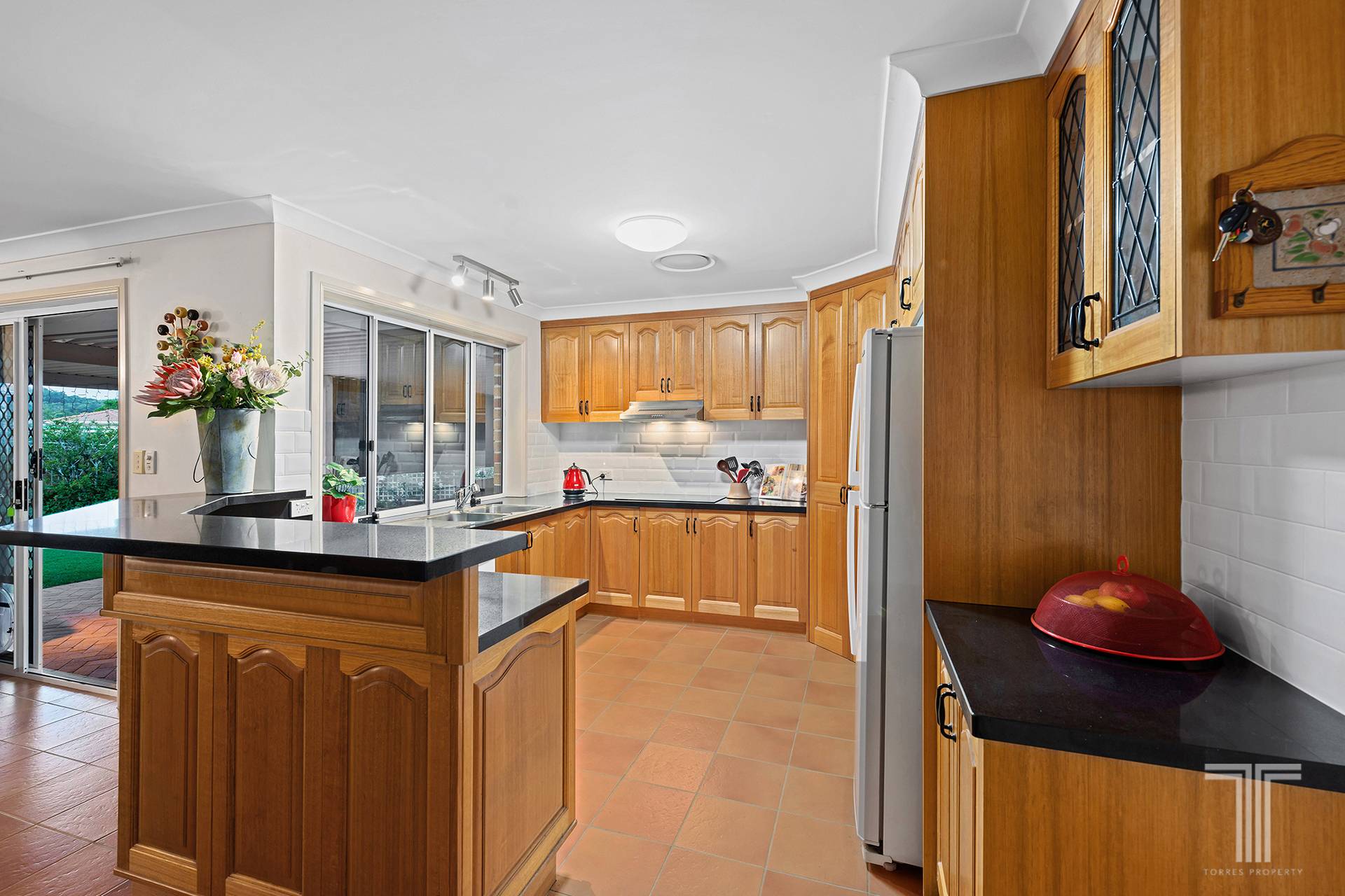 Featuring an open design, the living and dining area connects seamlessly with the kitchen and outdoor entertaining space. Upgraded five years ago, the central kitchen is well-appointed with black Caesarstone benchtops, updated wooden cabinetry and quality appliances, including a Bosch dishwasher and Blanco stove.