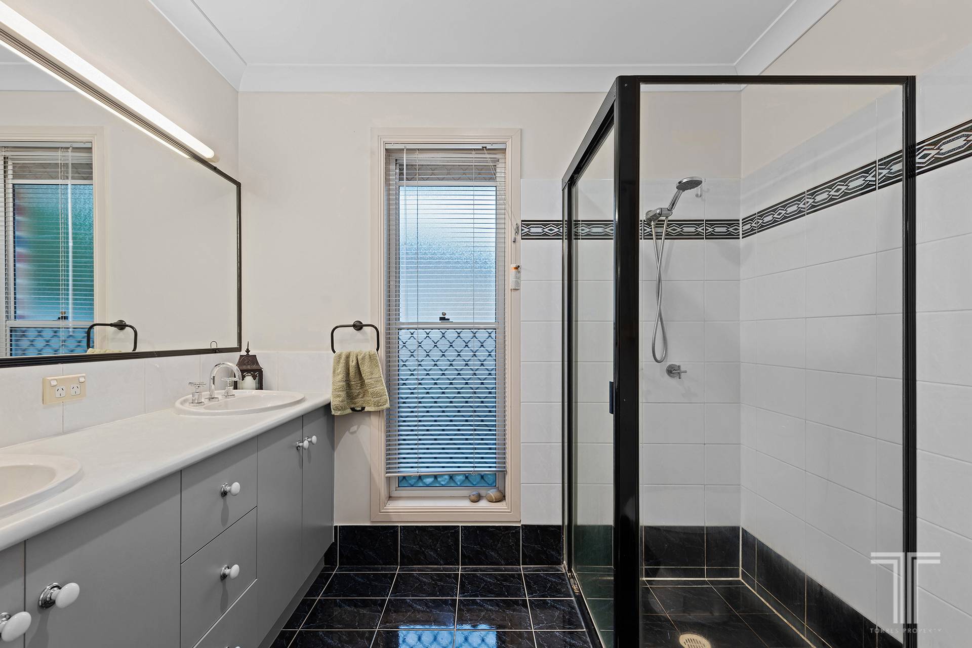 A study and five bedrooms provide separation across the low set layout. The master opens to the outdoor area and features a walk-in robe and ensuite with dual vanities and black accents. The additional bedrooms include built-in robes and access to the family bathroom.