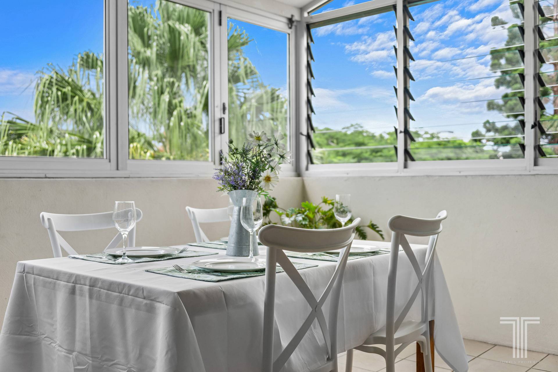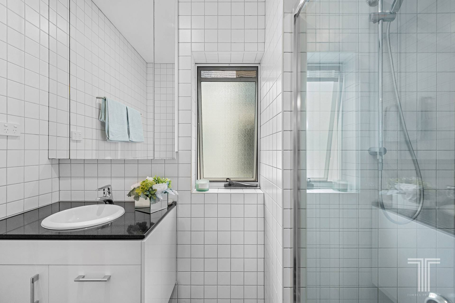 The generous layout is filled with amazing natural light and sweeping aspects to the east, south and west. Moving seamlessly between indoors and out, the living and dining area features floor-to-ceiling glass doors opening to the spacious balcony. An enviable oasis framed by rows of bi-fold windows and louvres that invite breezes and leafy views, this alfresco setting presents the perfect all-weather retreat for outdoor dining and entertaining.