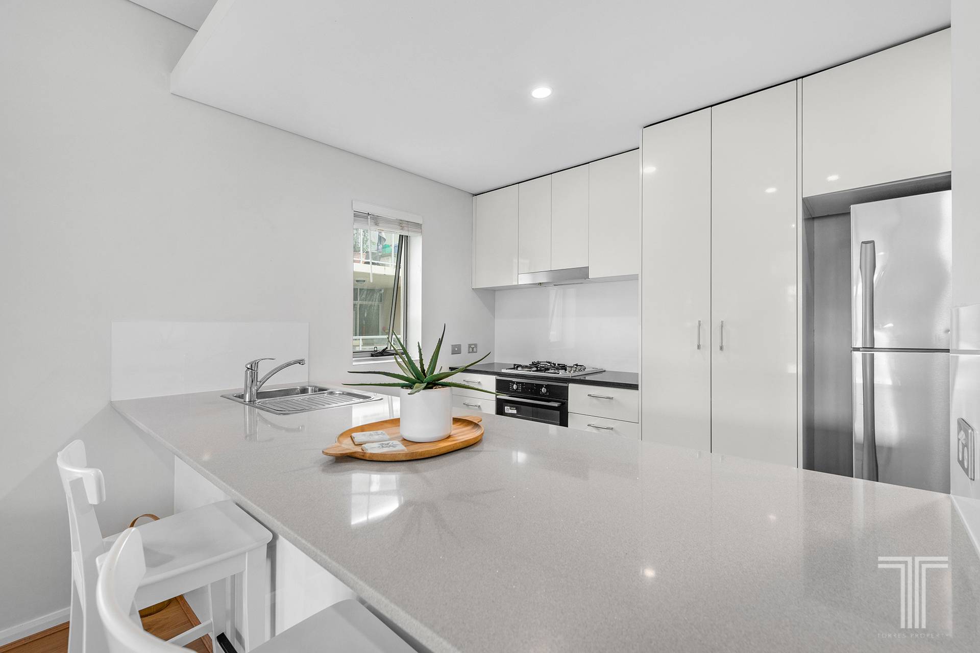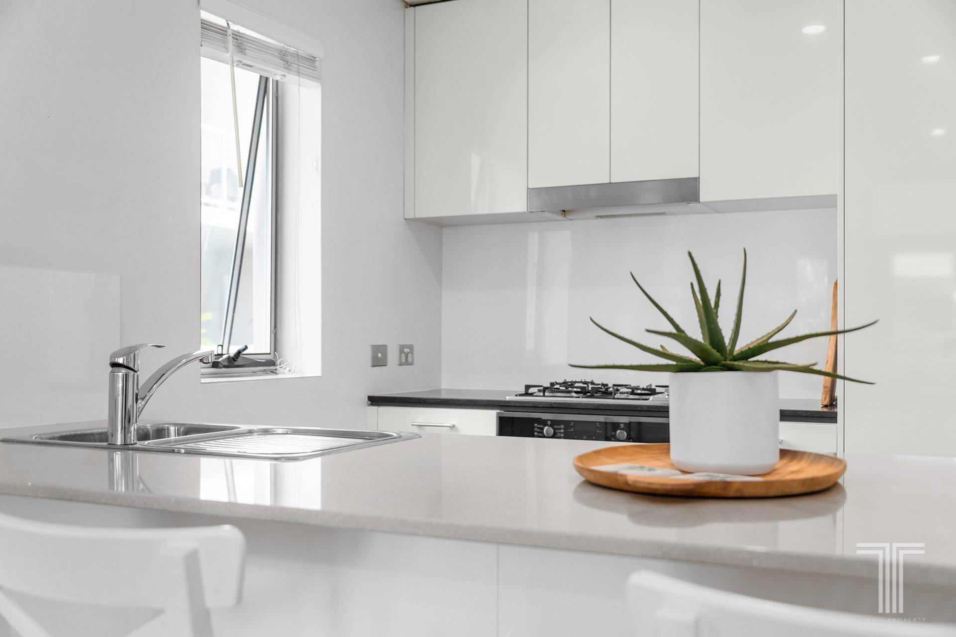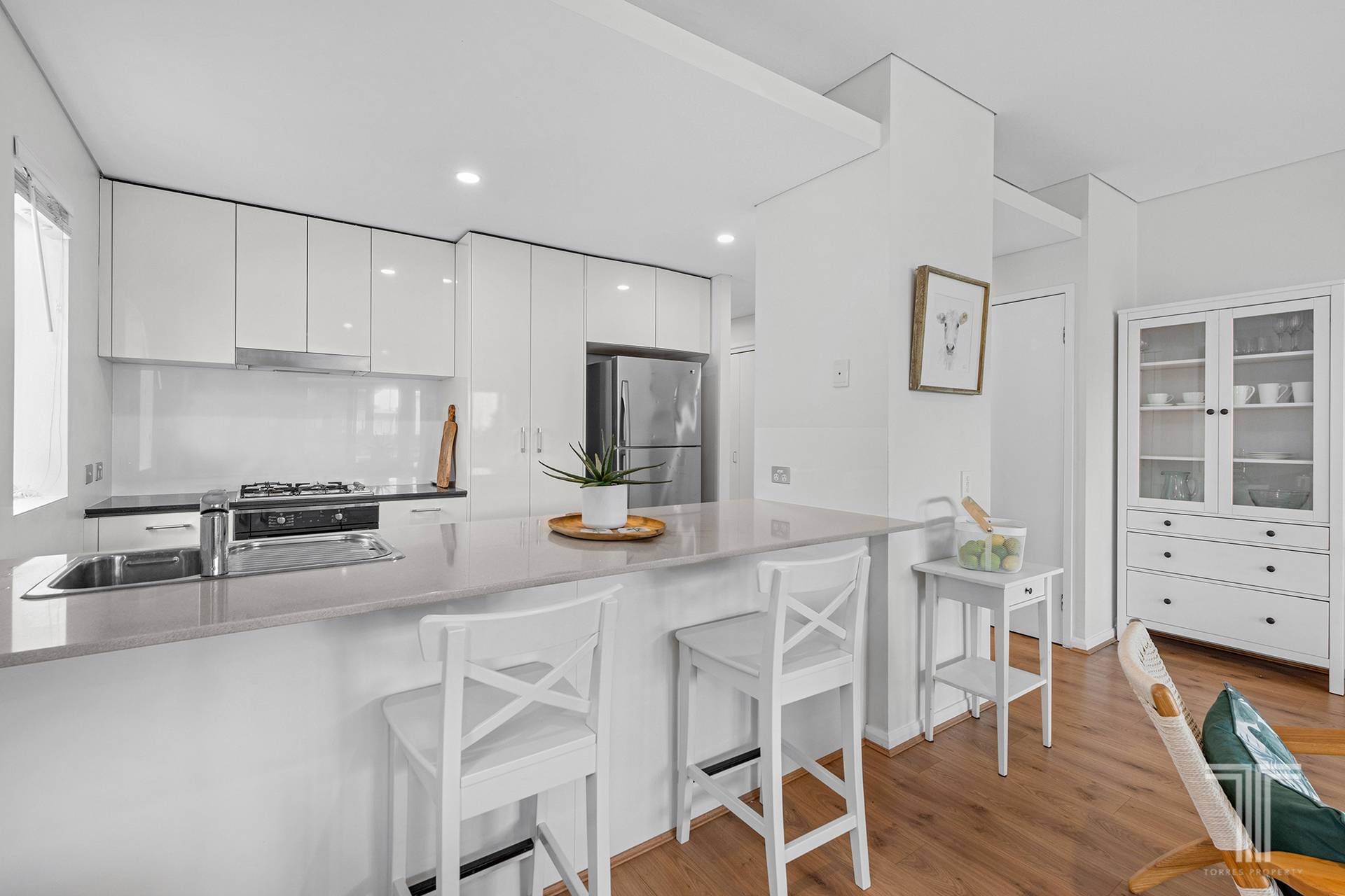 Servicing the living and entertaining zones, the stylish kitchen has been fully renovated with stone benchtops, a breakfast bar, glossy cabinetry and a gas cooktop.