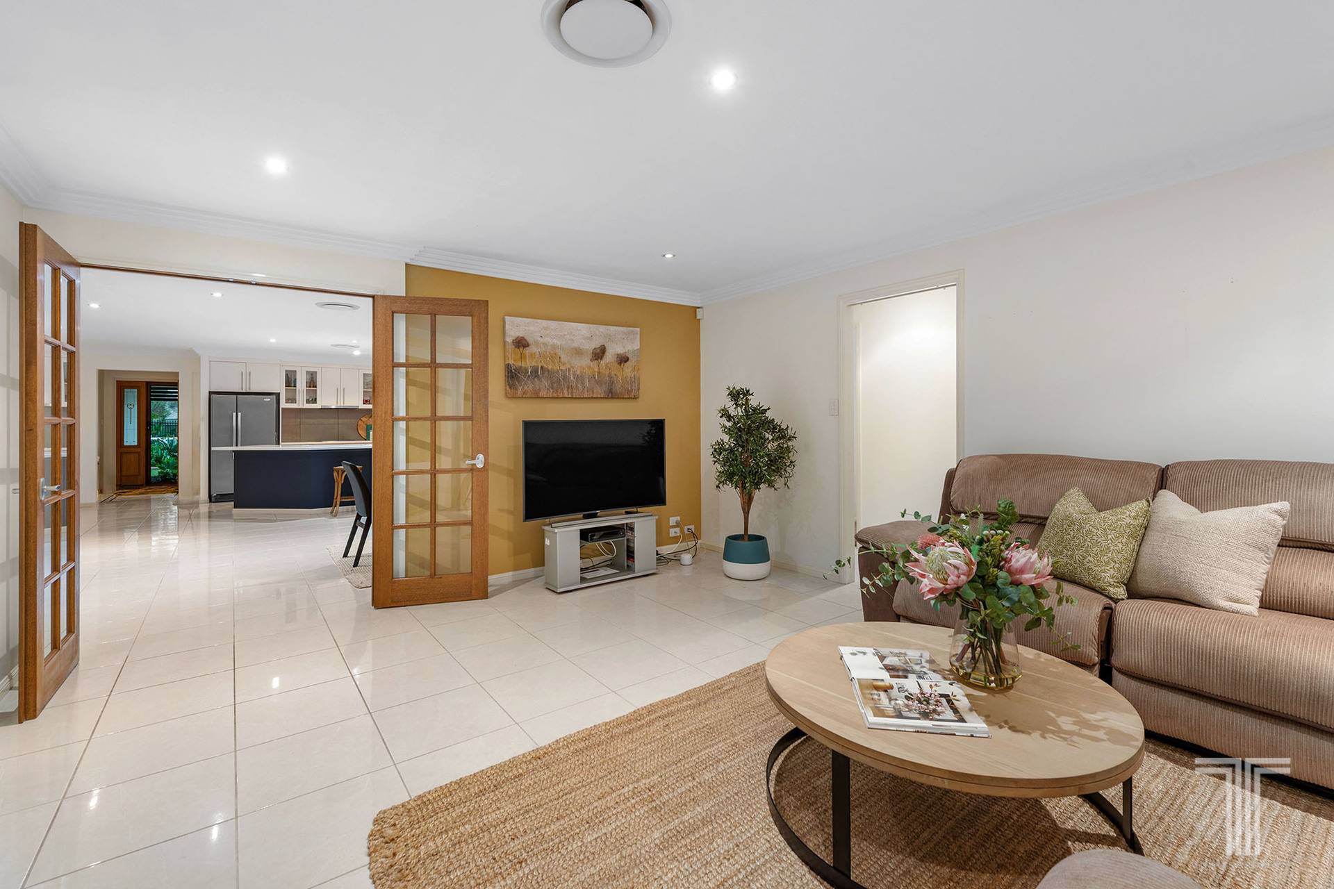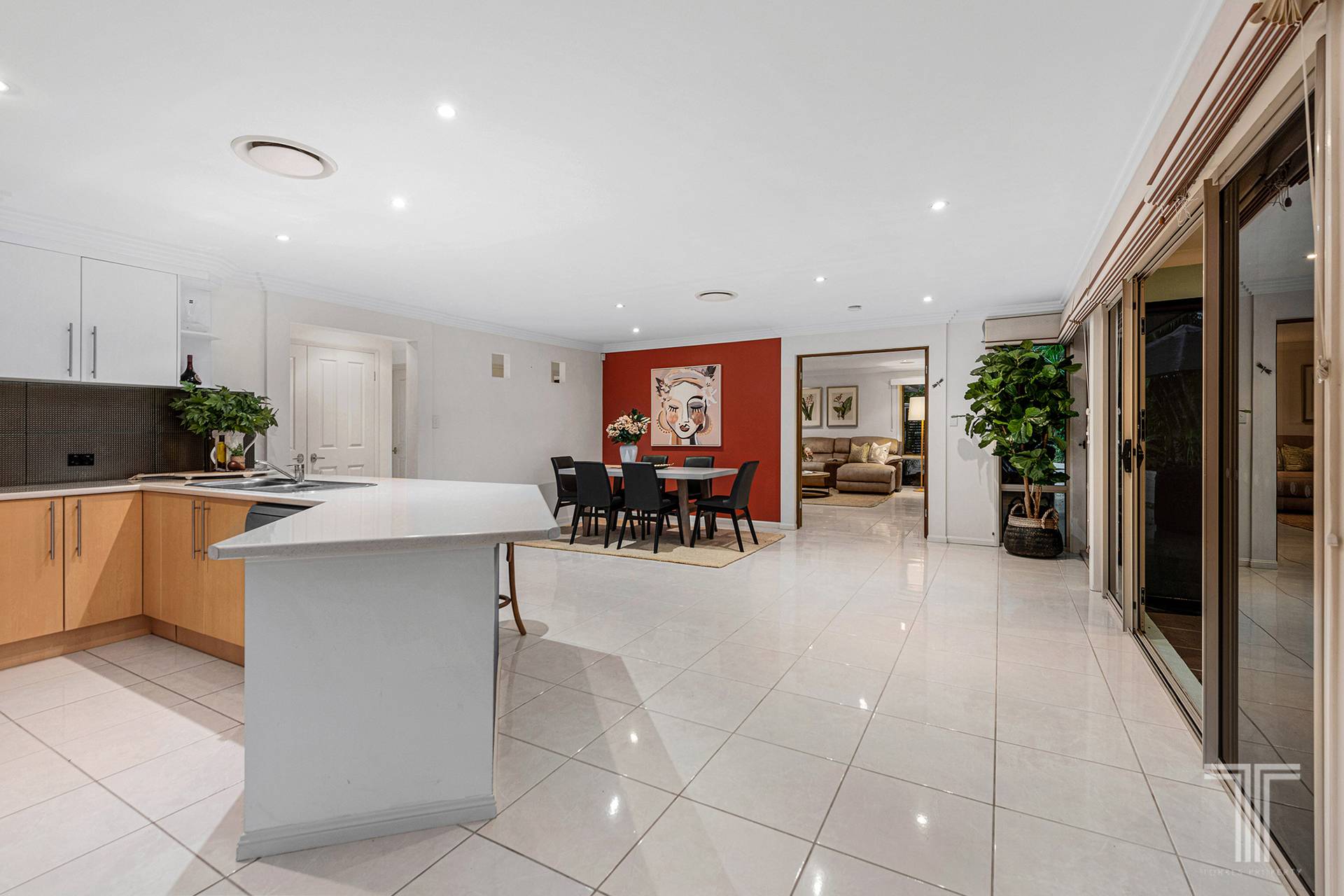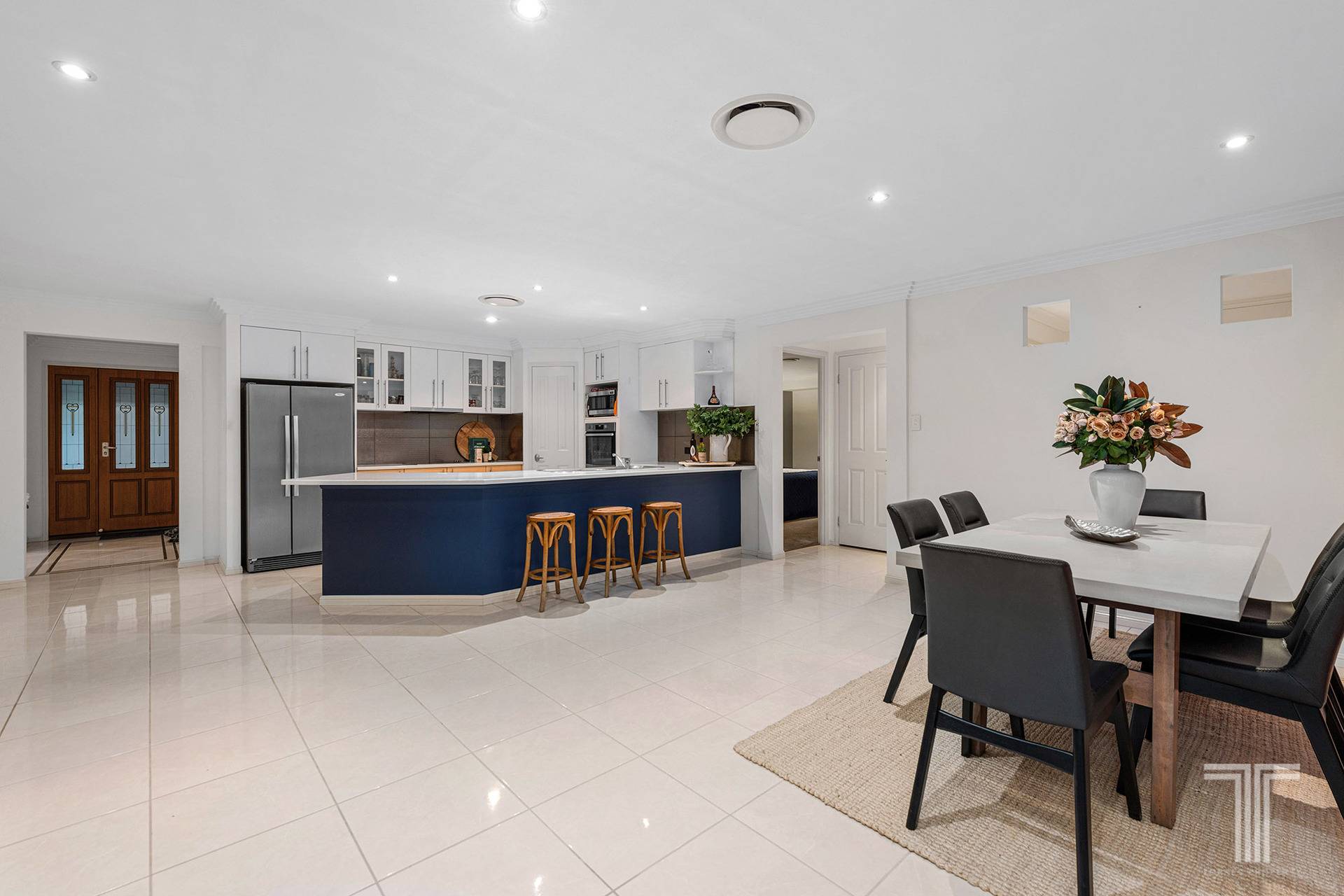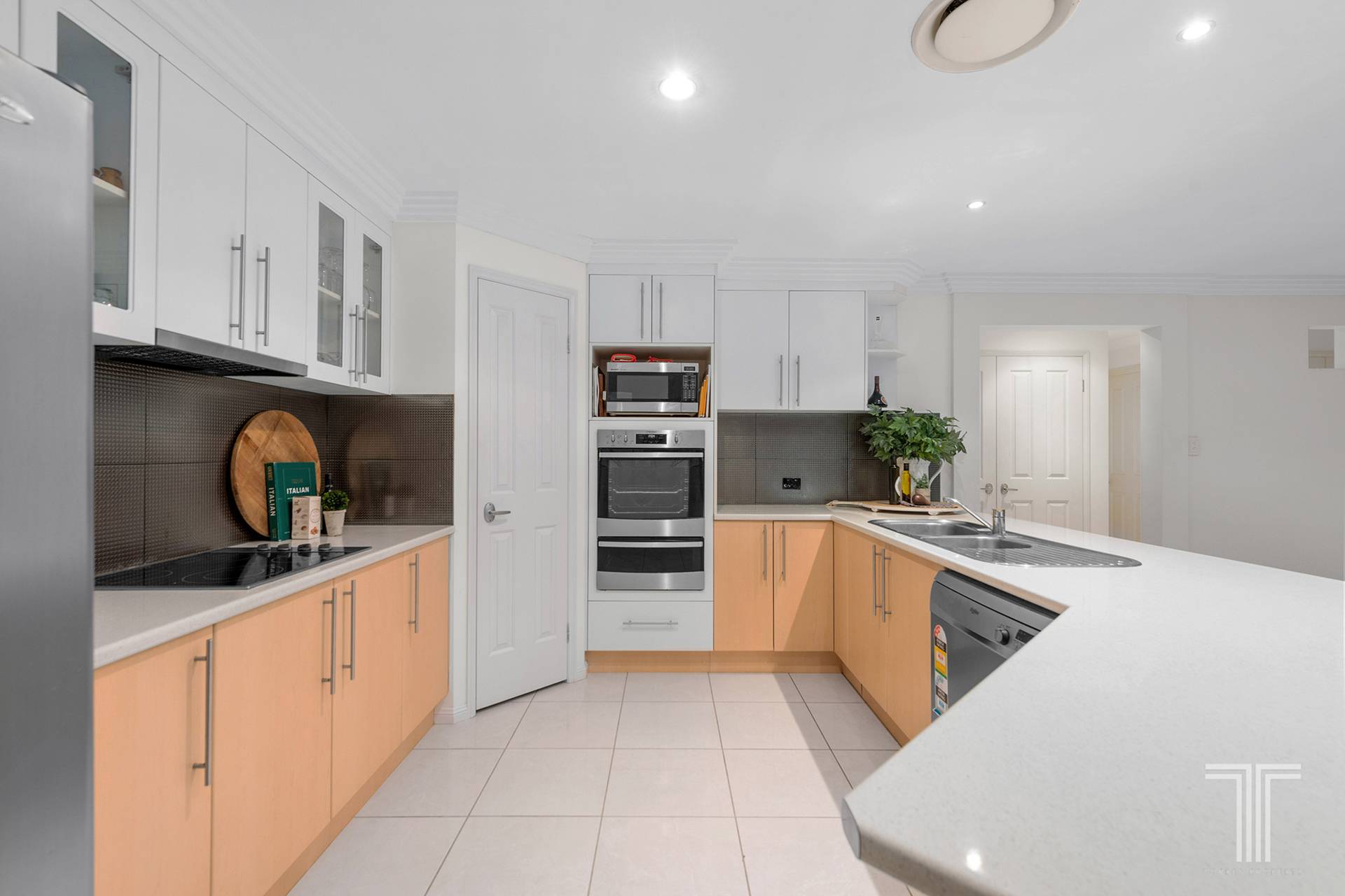 Positioned off the entryway is a spacious lounge room providing a formal space for indoor entertaining with tranquil garden views. Open in design, the central kitchen and dining area adjoins a second lounge that can be closed off for separation or opened to form interconnected family living. The kitchen is well-equipped with large benchtops, a breakfast bar and stainless steel appliances, including a Westinghouse oven and stove.