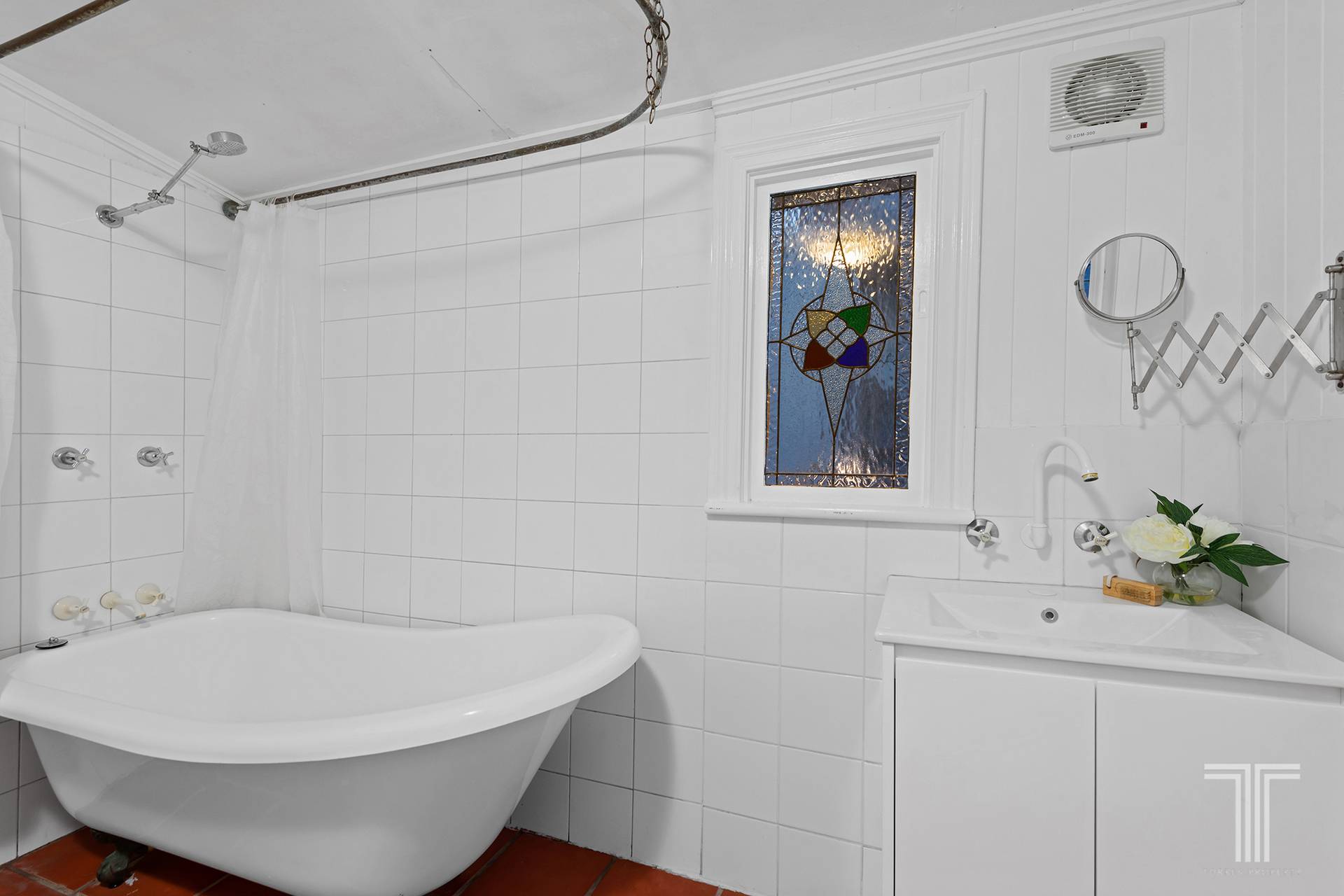 Three bedrooms are located upstairs, including one with an old fireplace recess. Servicing this floor is a character-filled bathroom boasting a stained glass window and a clawfoot bath.