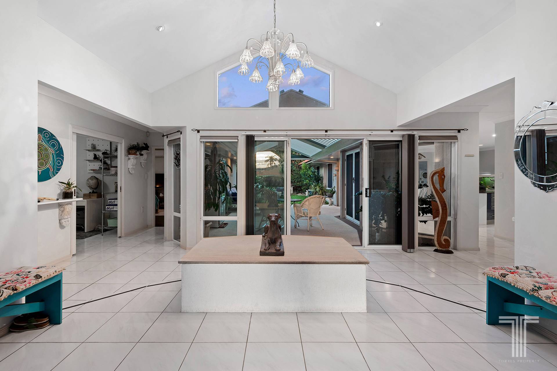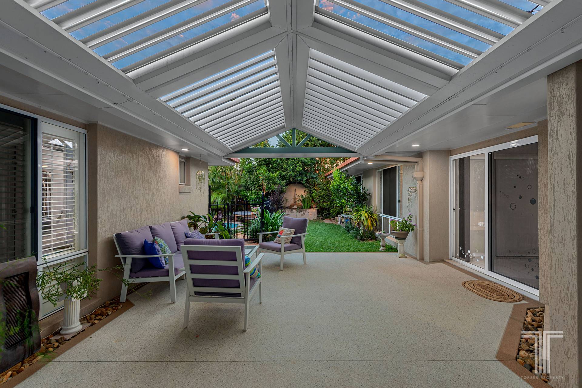 An exquisite centrepiece, the undercover patio with an automatic Vergola roof system forms the heart of the home. Shaded by large palm trees, this tropical retreat gazes over the water feature, gardens and the heated saltwater pool.