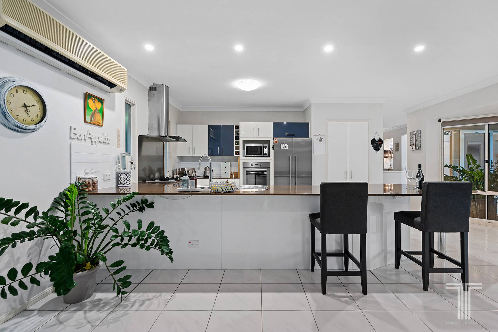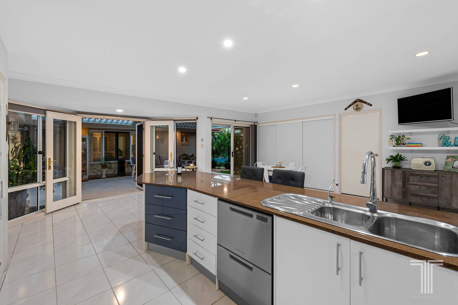 The air-conditioned dining area extends seamlessly to the well-appointed kitchen with large stone benchtops, a filtered water tap, walk-in pantry and a suite of Fisher & Paykel, DeLonghi and Asko appliances including a double drawer dishwasher.