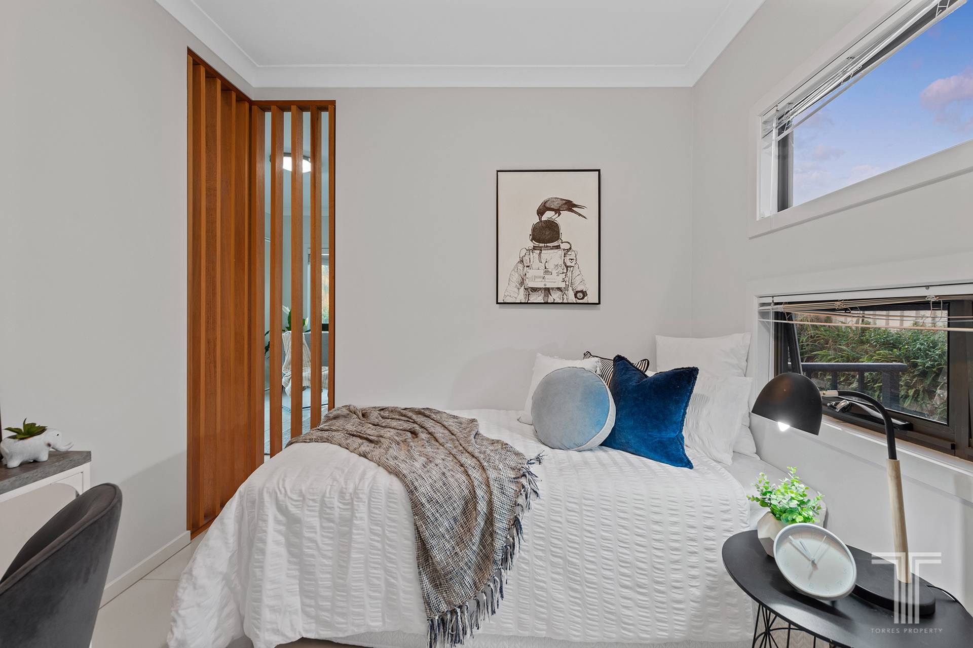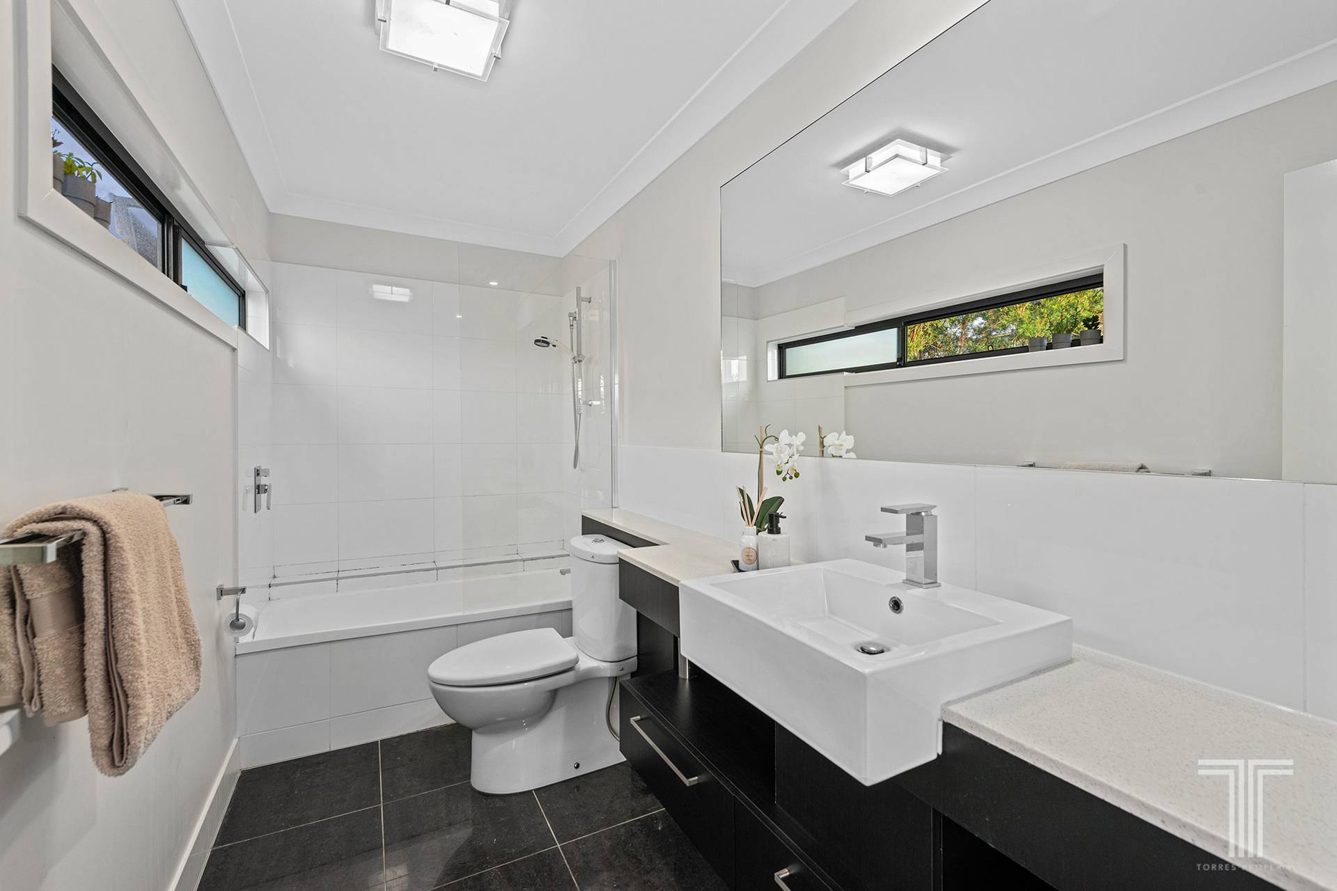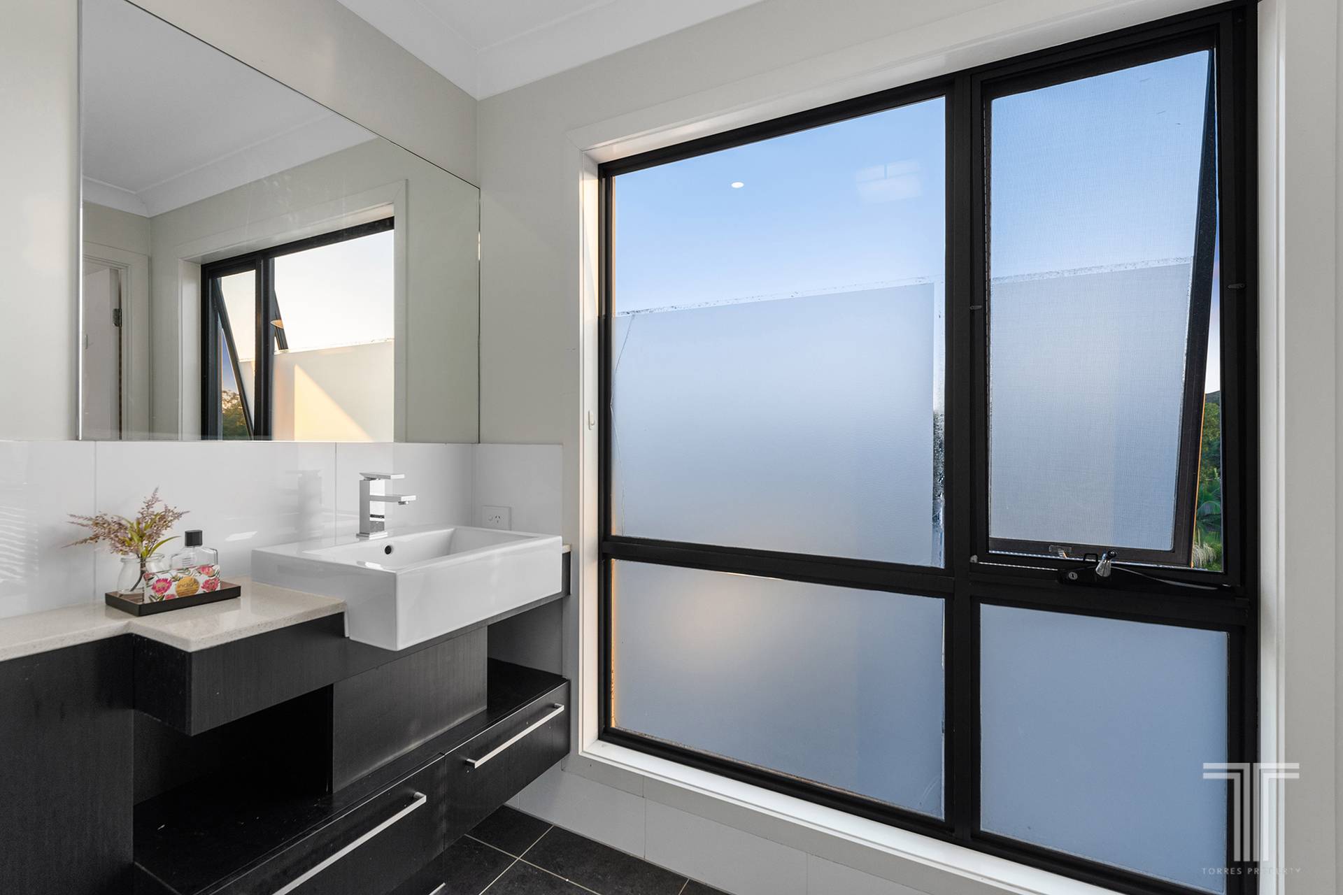 Finalising the first floor is a well-sized bedroom with a built-in robe. Two additional bedrooms are elevated on the upper floor and feature leafy vistas, built-in robes, air-conditioning and ensuites. The ground floor houses a third modern bathroom, laundry and double garage.