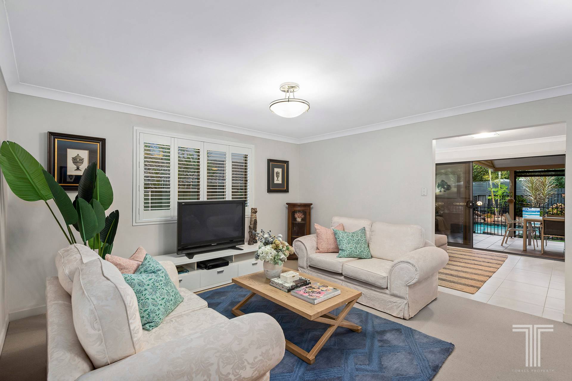 The adjacent double garage features planation shutters that open to this outdoor oasis, providing additional entertaining room for parties and gatherings.