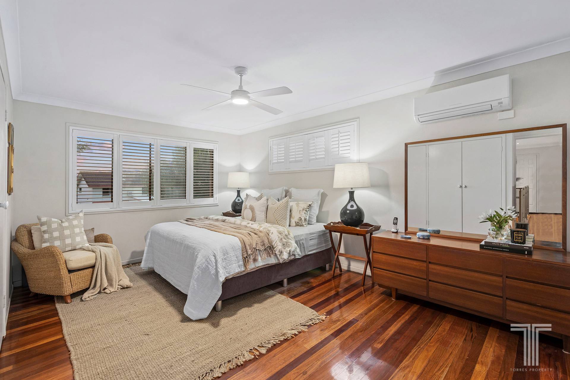 Four massive bedrooms with built-in robes and timber floors are found upstairs. Two feature air-conditioning, including the spacious master with an ensuite boasting floor-to-ceiling tiles and dual vanities.