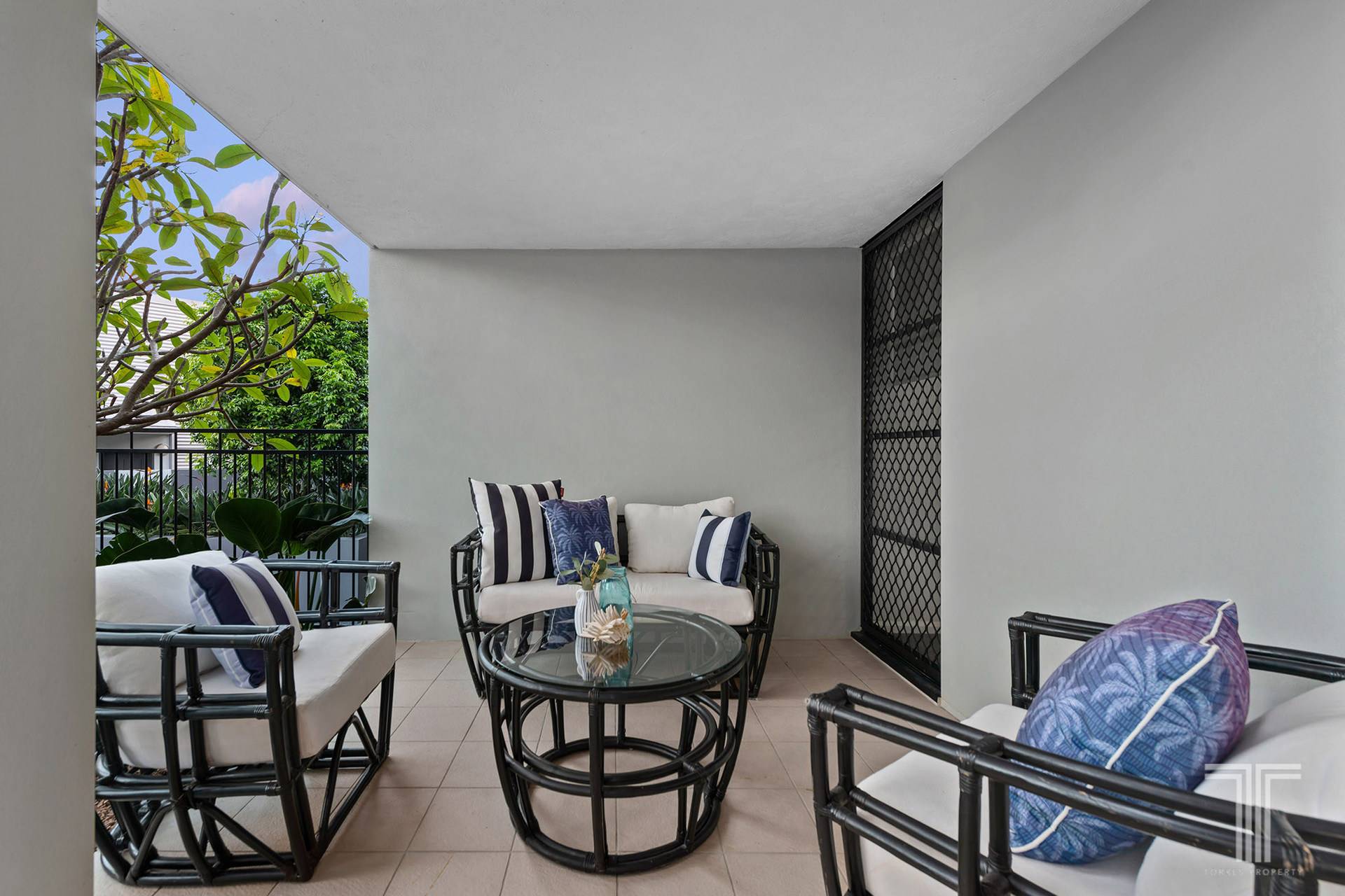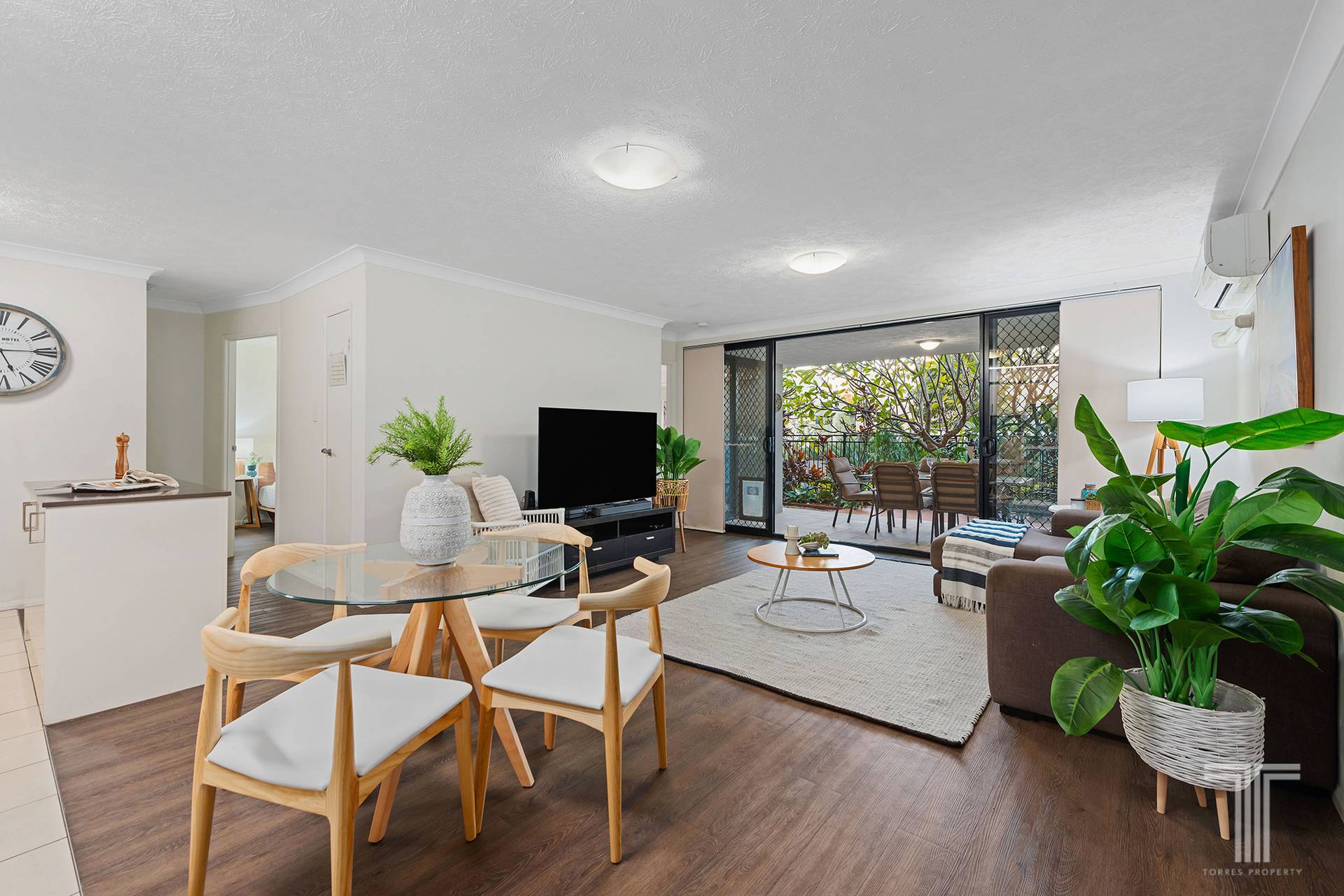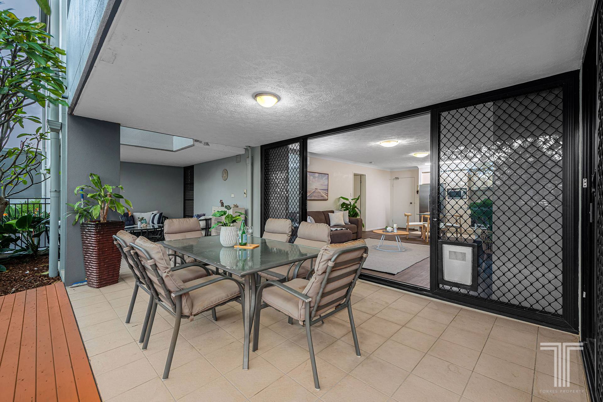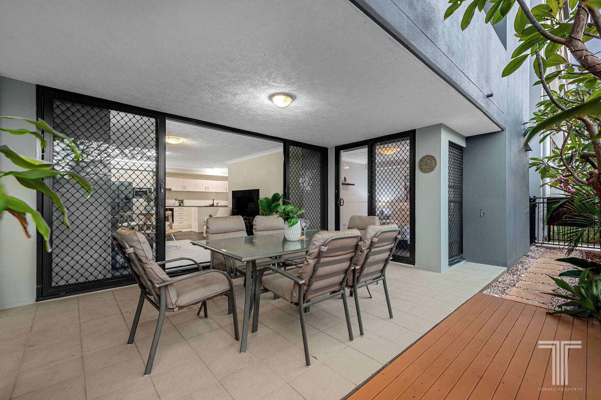 The living and dining area unveils a contemporary design with stylish floors, air-conditioning and floor-to-ceiling glass doors that open to your private entertaining area. Comprising an undercover patio and a sunlit deck overlooking frangipani trees that create shade and privacy, you will simply love this outdoor retreat.