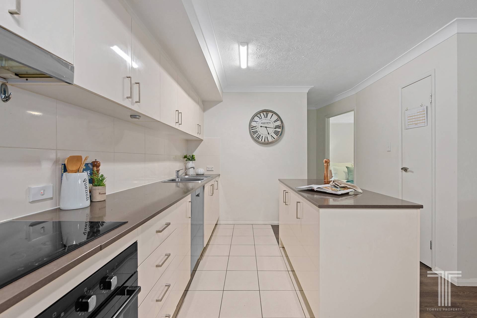 Connecting seamlessly with the living space, the galley-style kitchen is well-appointed with stone benchtops, rows of cabinetry and stainless steel appliances.