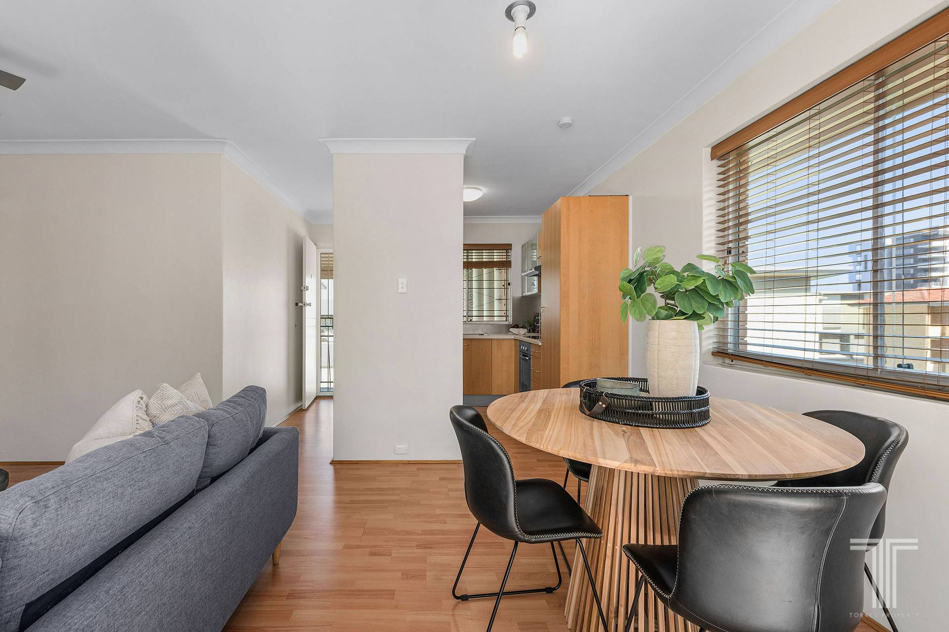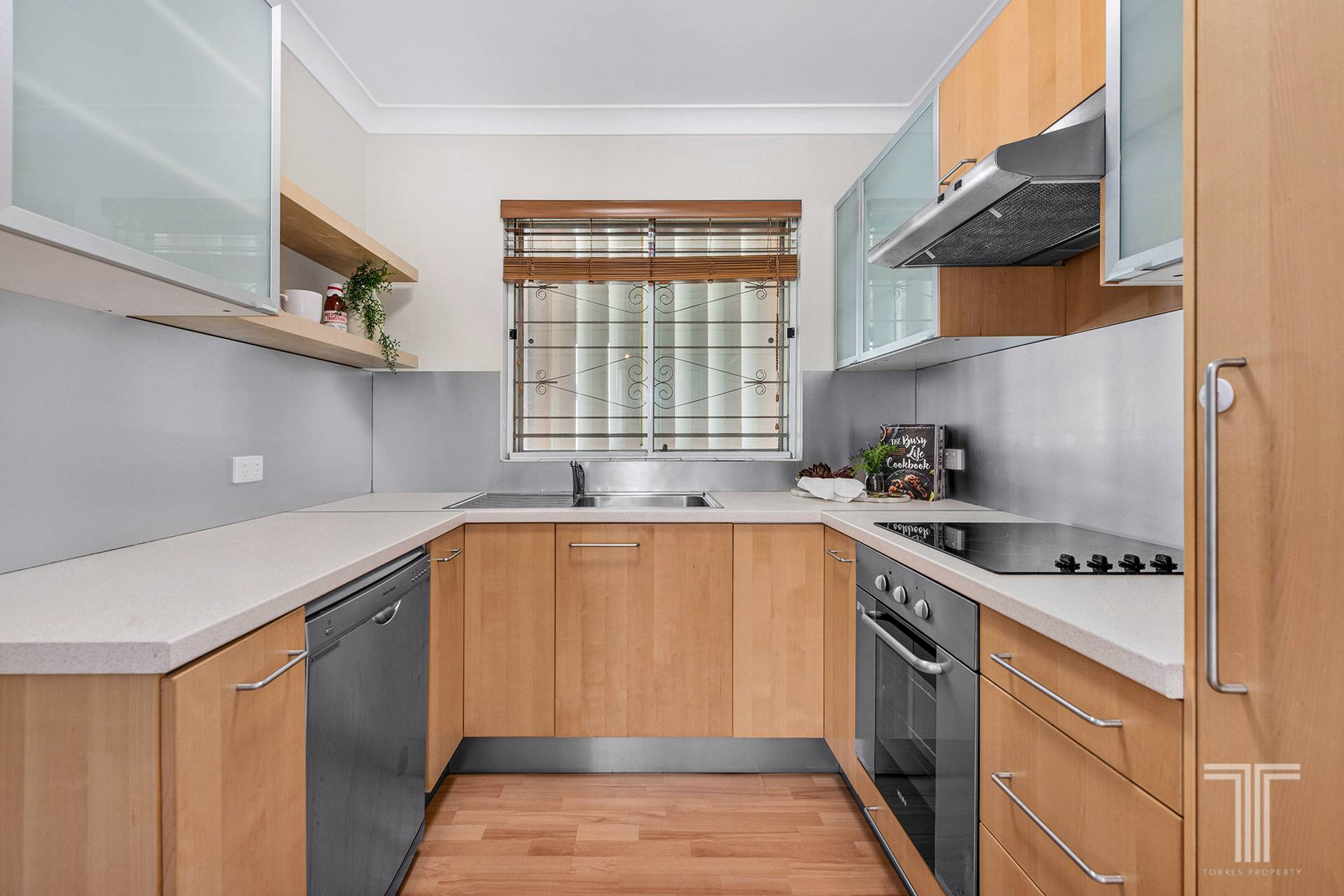 The updated kitchen adjoins this living space and features sleek benchtops, stainless steel appliances and abundant cabinetry.