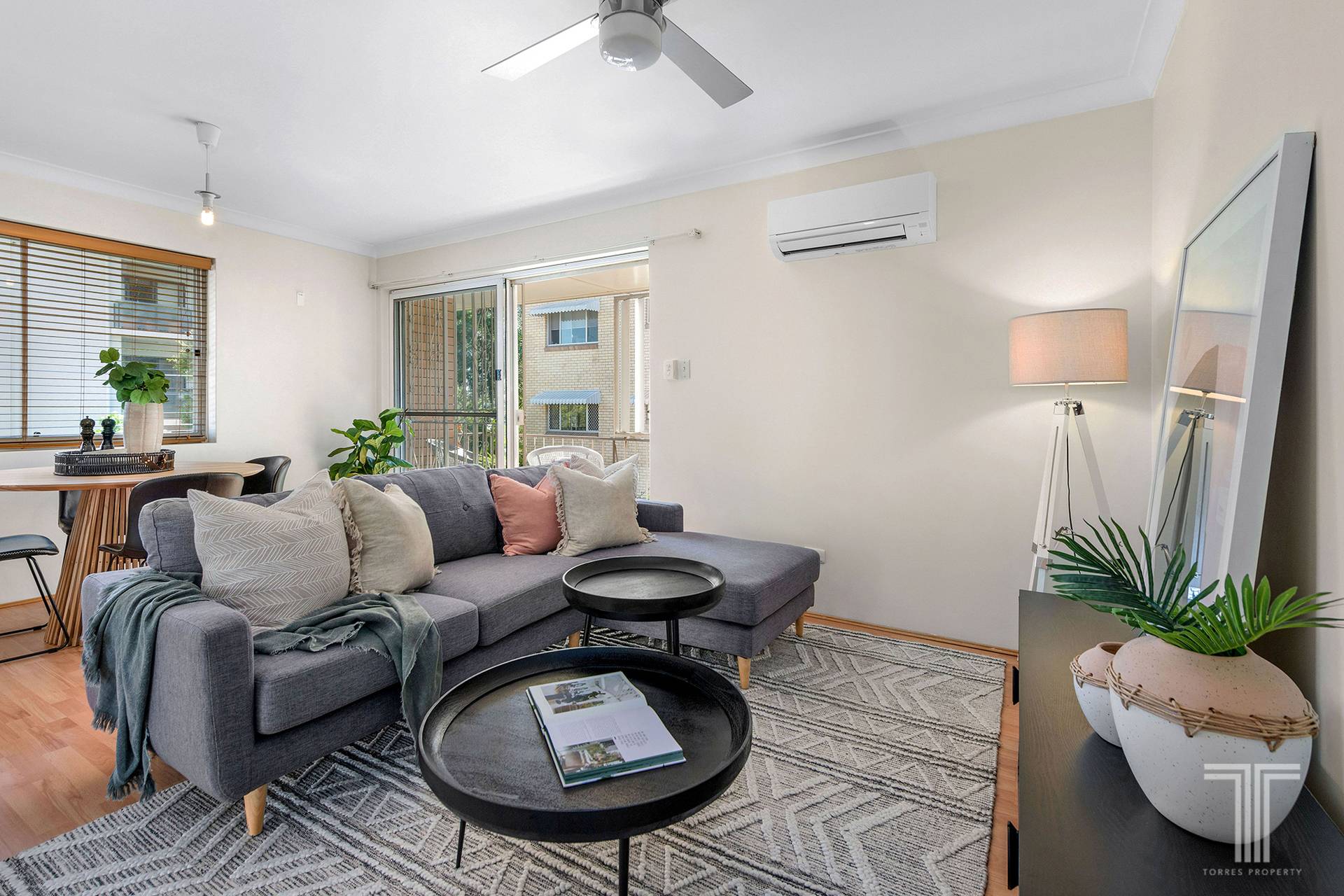 Open and airy, the living and dining area boasts stylish floorboards, air-conditioning and access to the balcony where you can enjoy your morning coffee and soak up the sunshine.