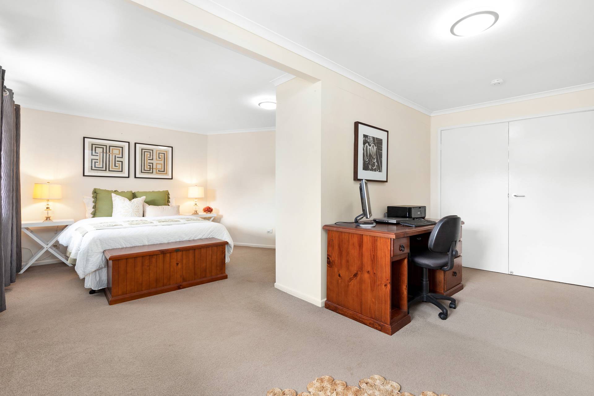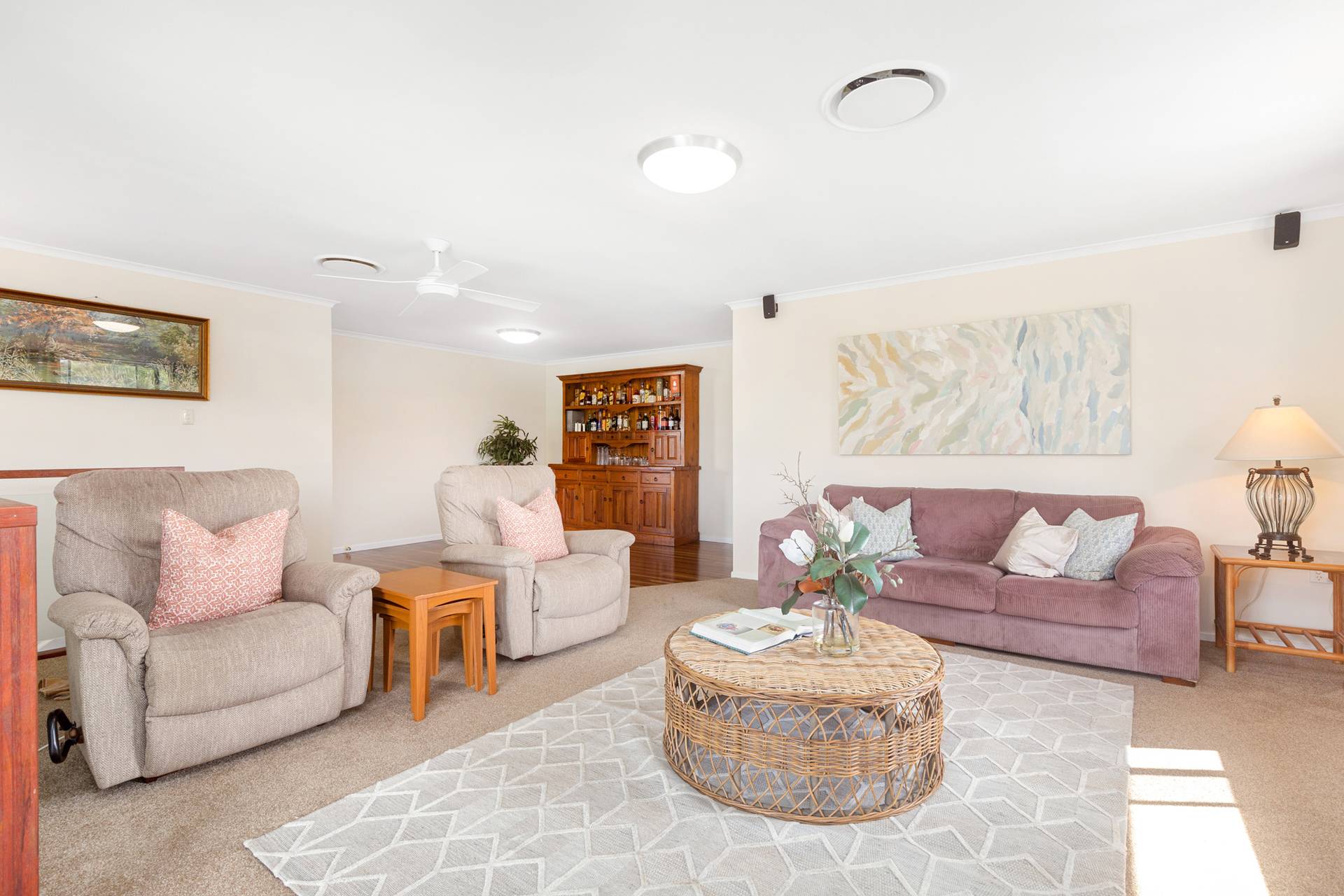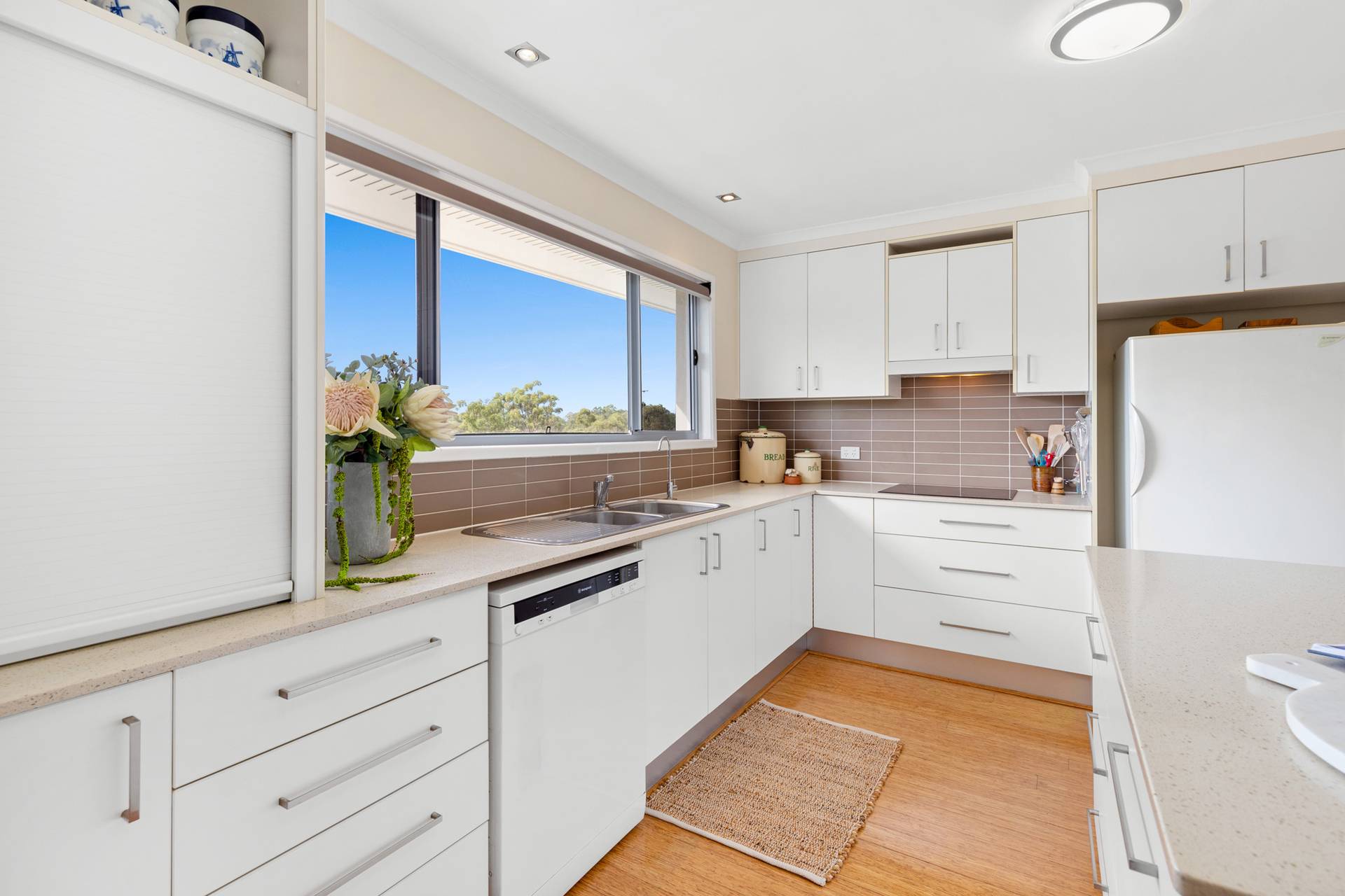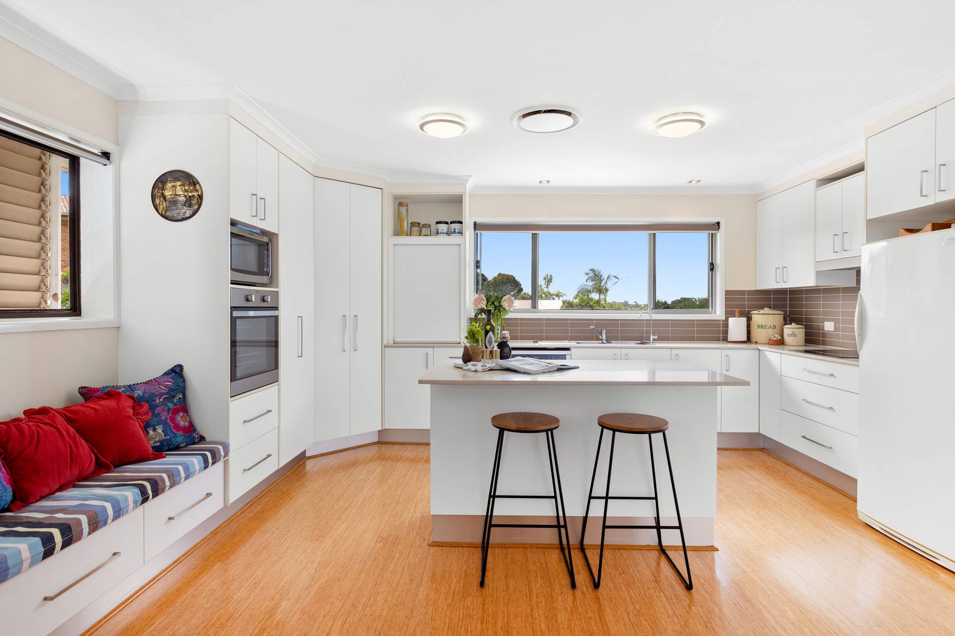 The upper level reveals a blend of carpet, genuine timber and floating timber floors adorning the living space and dining area. The open plan kitchen centres around an island bench and includes built-in seating and a breakfast bar.