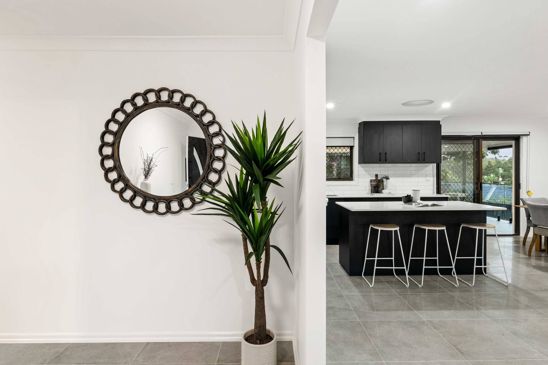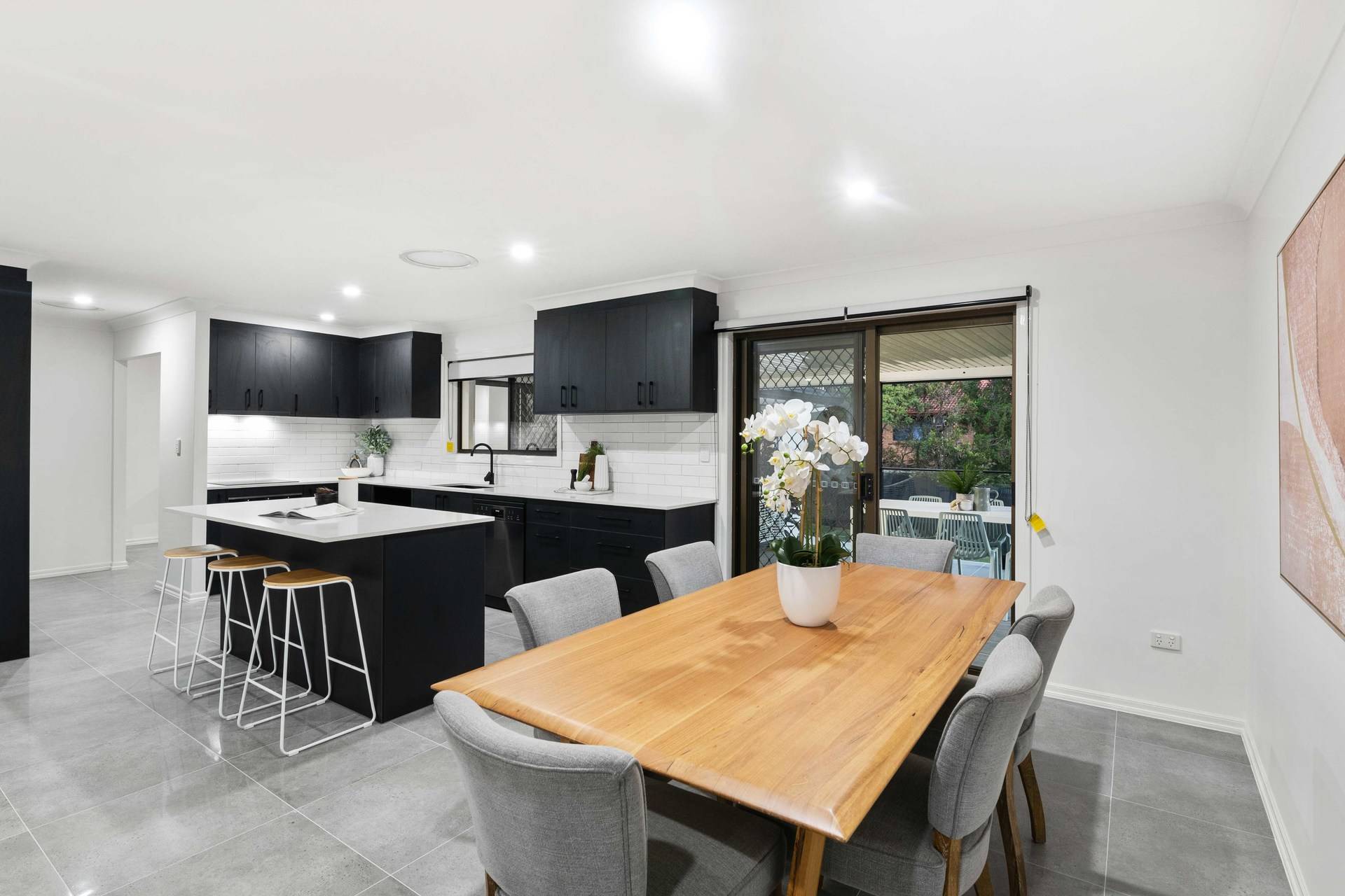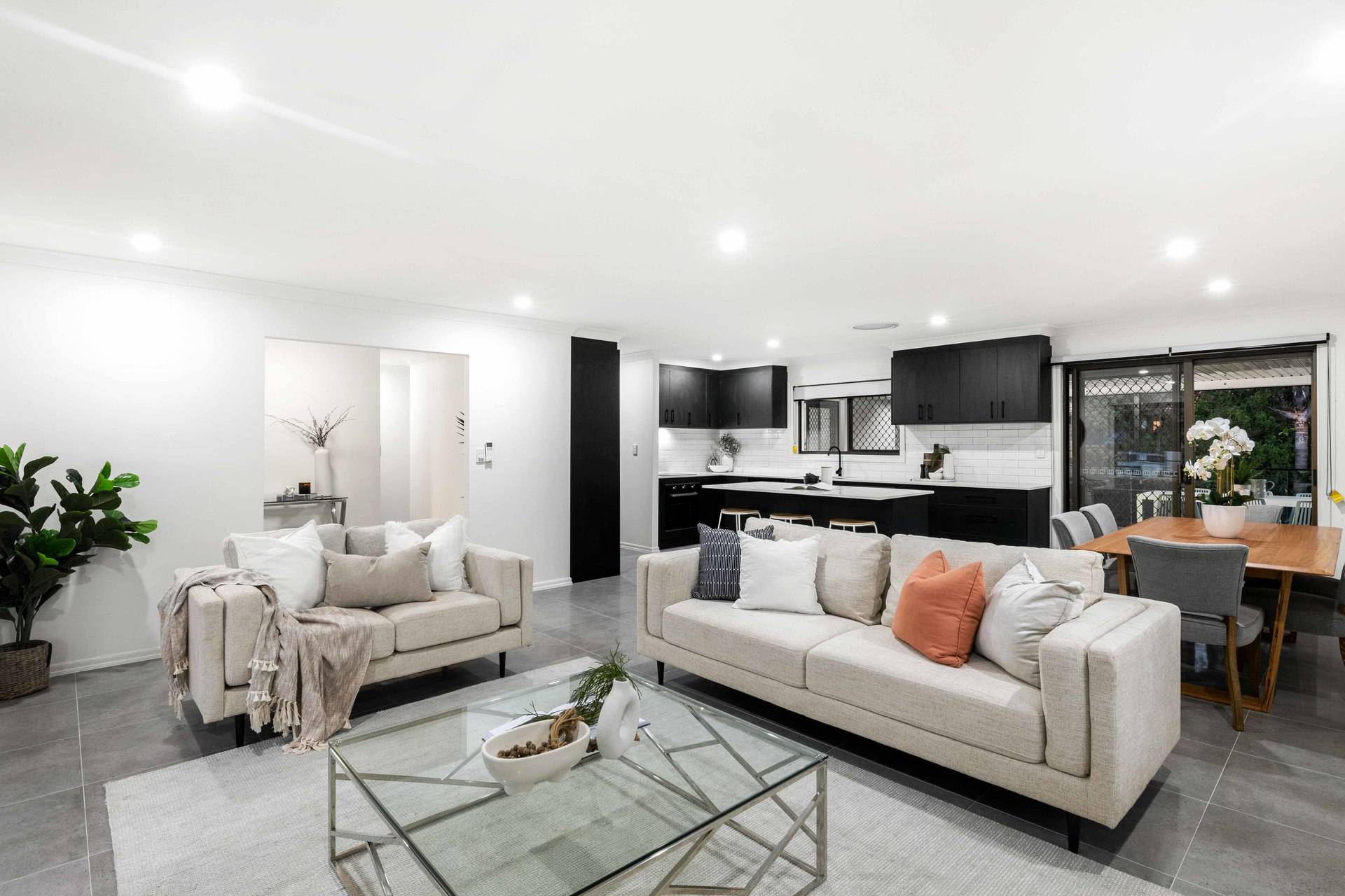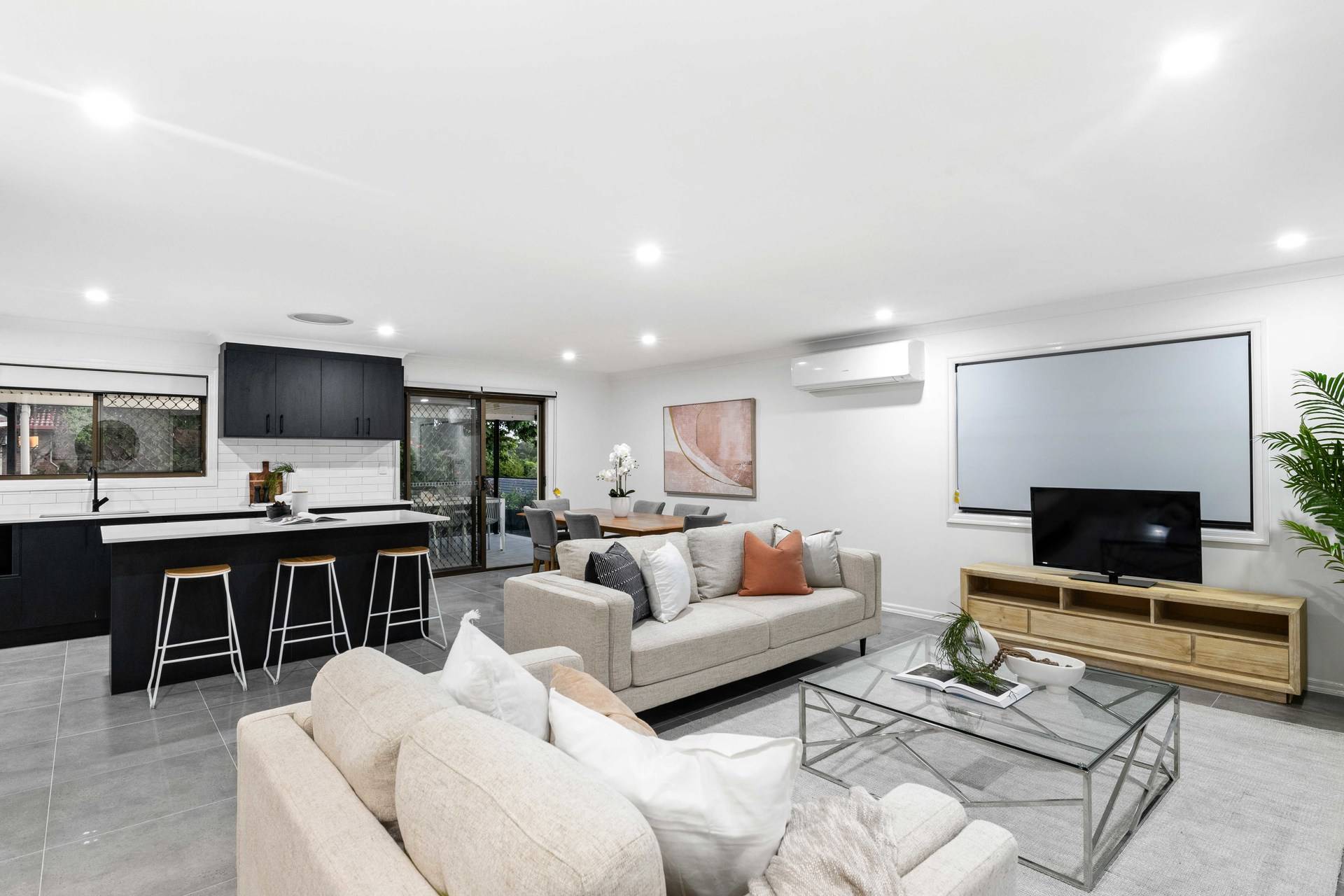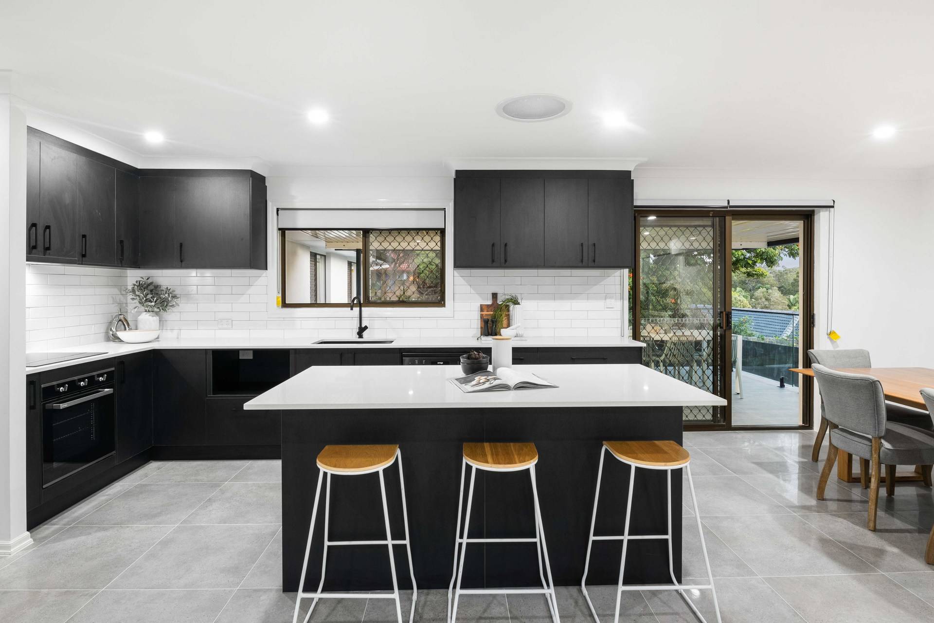Revealing stylish contemporary interiors, the open plan design hosts a spacious lounge and dining area adorned with stunning tiles, downlights and air-conditioning. The crisp white walls are contrasted by the kitchen's modern black cabinetry, appliances and island bench.