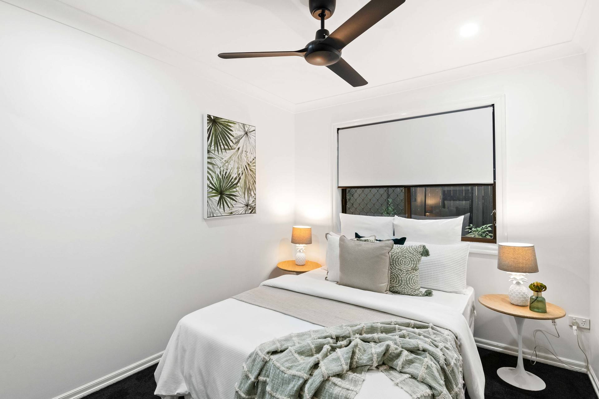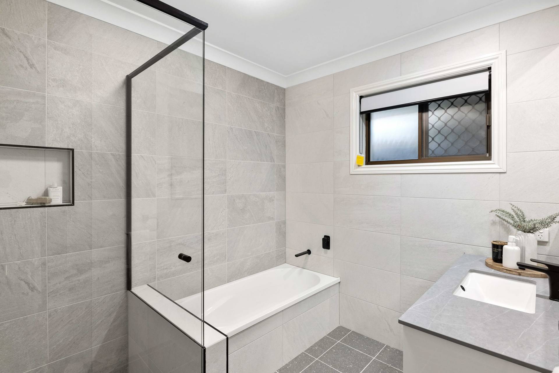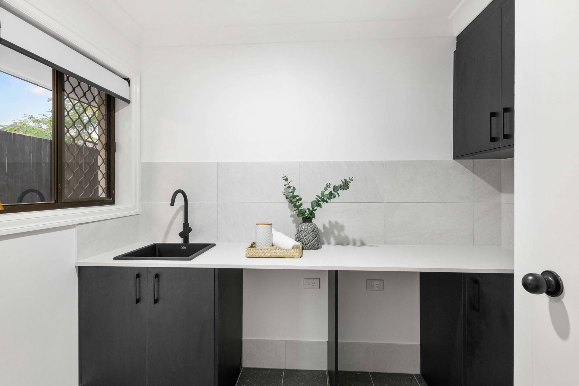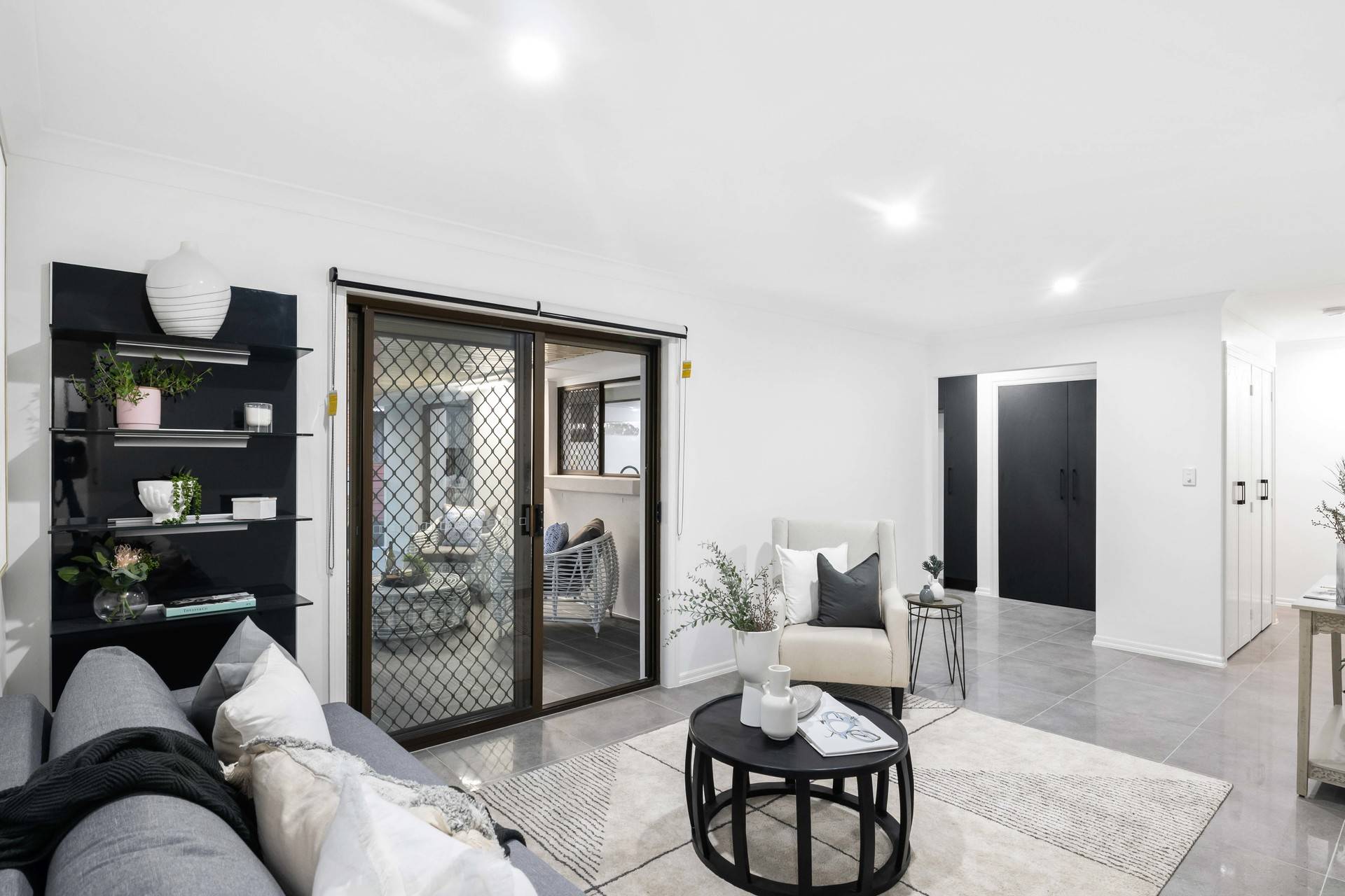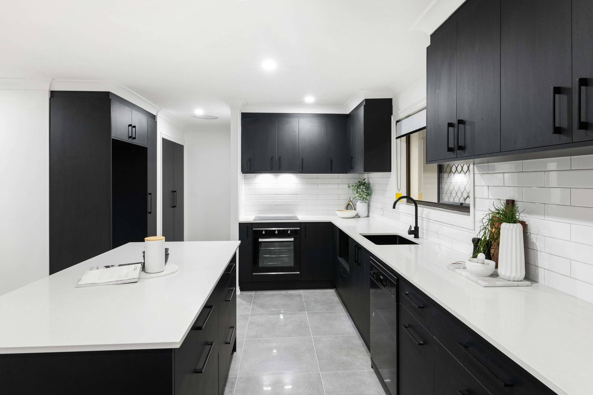 Revealing stylish contemporary interiors, the open plan design hosts a spacious lounge and dining area adorned with stunning tiles, downlights and air-conditioning. The crisp white walls are contrasted by the kitchen's modern black cabinetry, appliances and island bench.