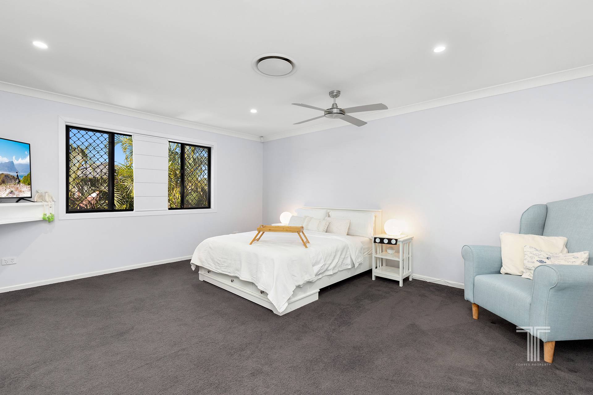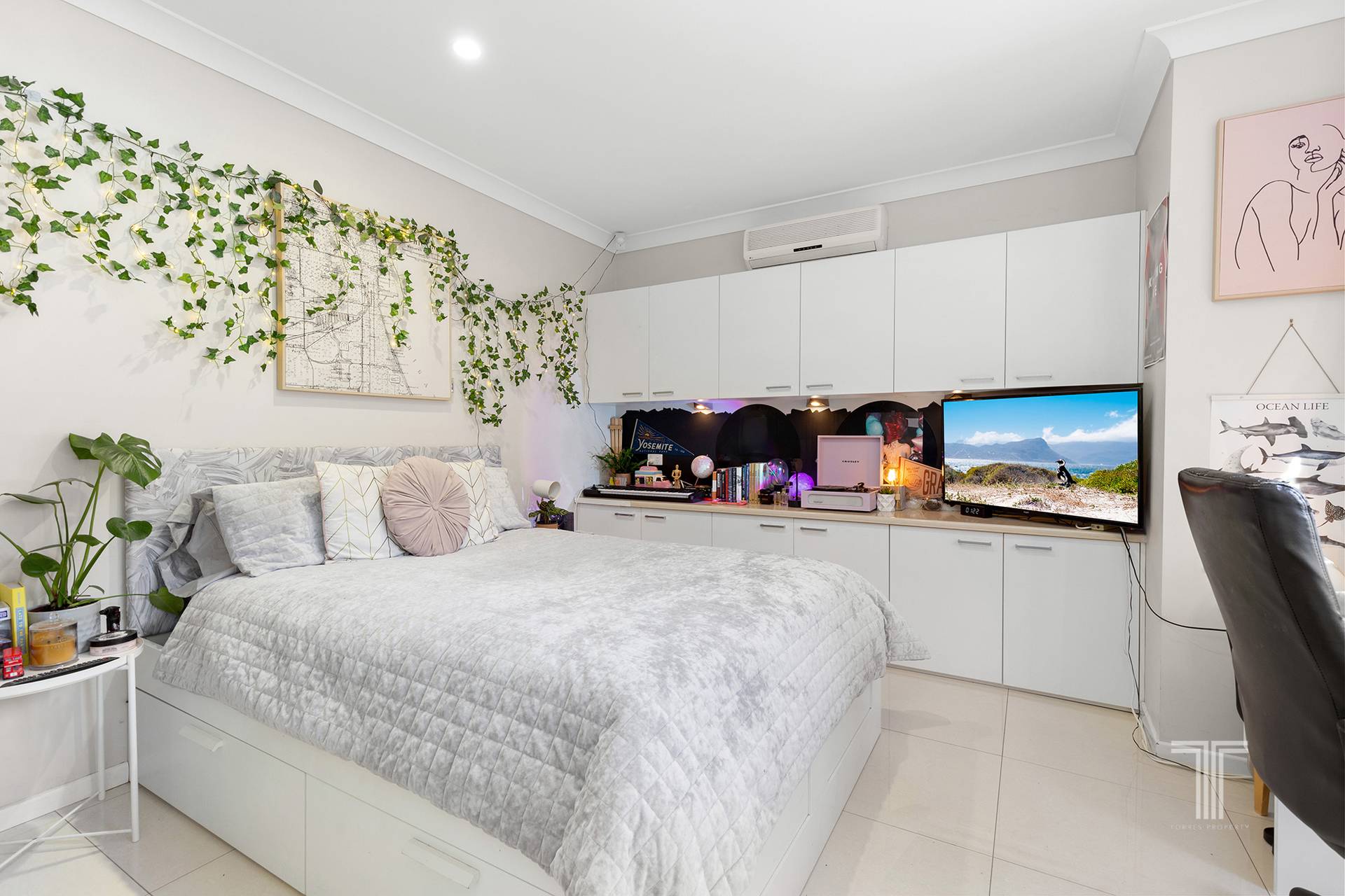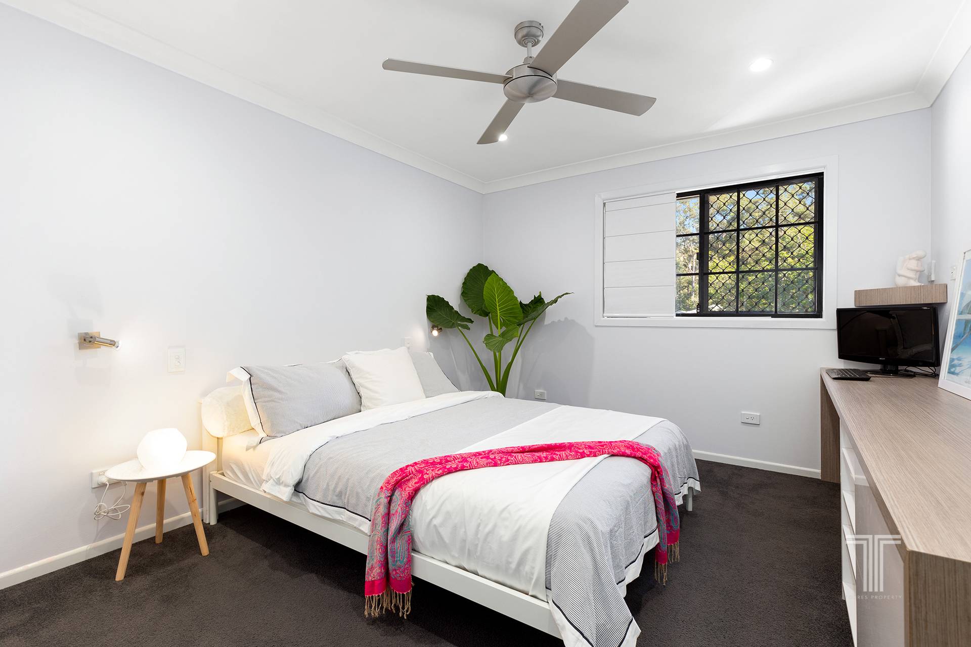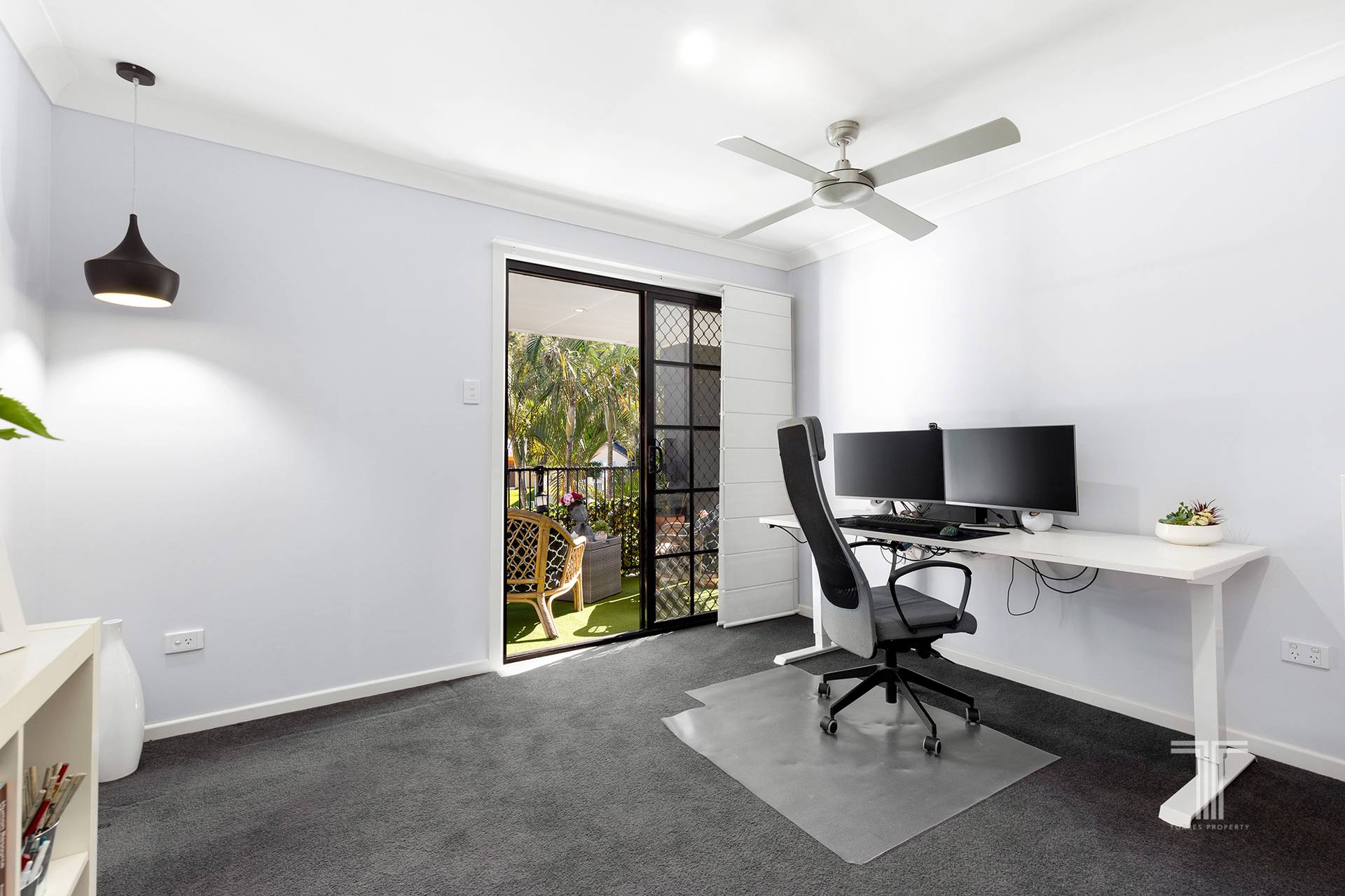Featuring four expansive bedrooms across the upper level, including the master with private ensuite and walk-in robe, second large bedroom with walk-in robe and two additional bedrooms with built-ins, all serviced by the contemporary bathroom and separate toilet. The upstairs bedrooms are all connected by the common living space currently used as a work from home office, which opens onto the private balcony overlooking the designer pool.