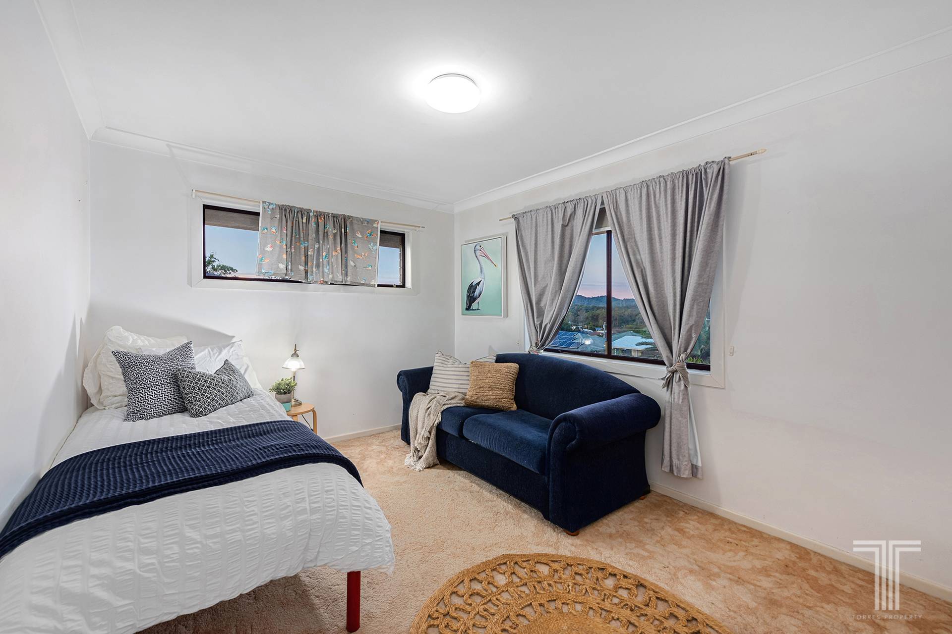Capturing elevated views, the upper level houses an open plan living and dining and a functional family kitchen. Flowing out to the front balcony delighting in leafy outlooks, and extending to the rear deck gazing over the neighbouring hillside, backyard and swimming pool below, there is plenty of space to unwind and entertain.