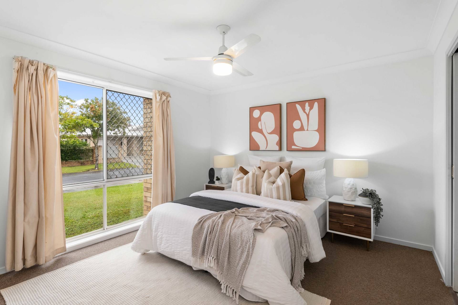 The house comprises four bedrooms and two bathrooms, including a master with an ensuite and outlooks across the front yard. Featuring security screens, ceiling fans, an air-conditioner, and a double lock-up garage, the property presents a low-maintenance design and ease of living.
