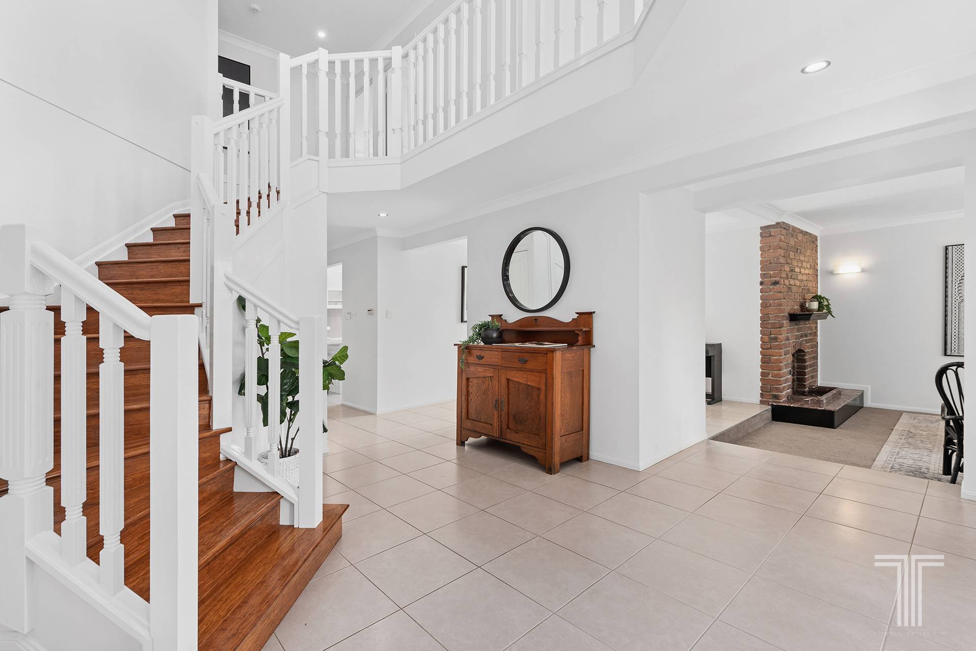 The grand entryway sets the tone for spacious living with a soaring void and timber staircase. The remarkable northern aspect and high ceilings invite sunshine and breezes throughout the interiors, where multiple living and entertaining zones await.