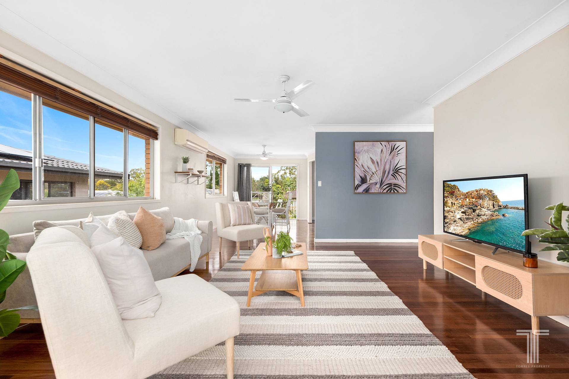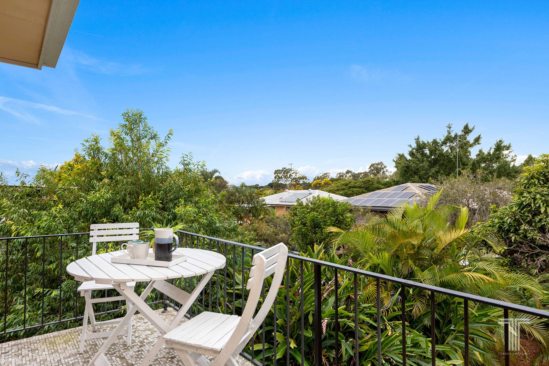 The upper level unveils an open design with an air-conditioned sunroom, lounge and dining area. Flowing to the rear balcony capturing beautiful breezes and leafy views, you can relax inside or out in the sunshine with your morning coffee. A spacious kitchen adjoins the living zone and features a functional layout with sleek cabinetry and a stainless steel oven.