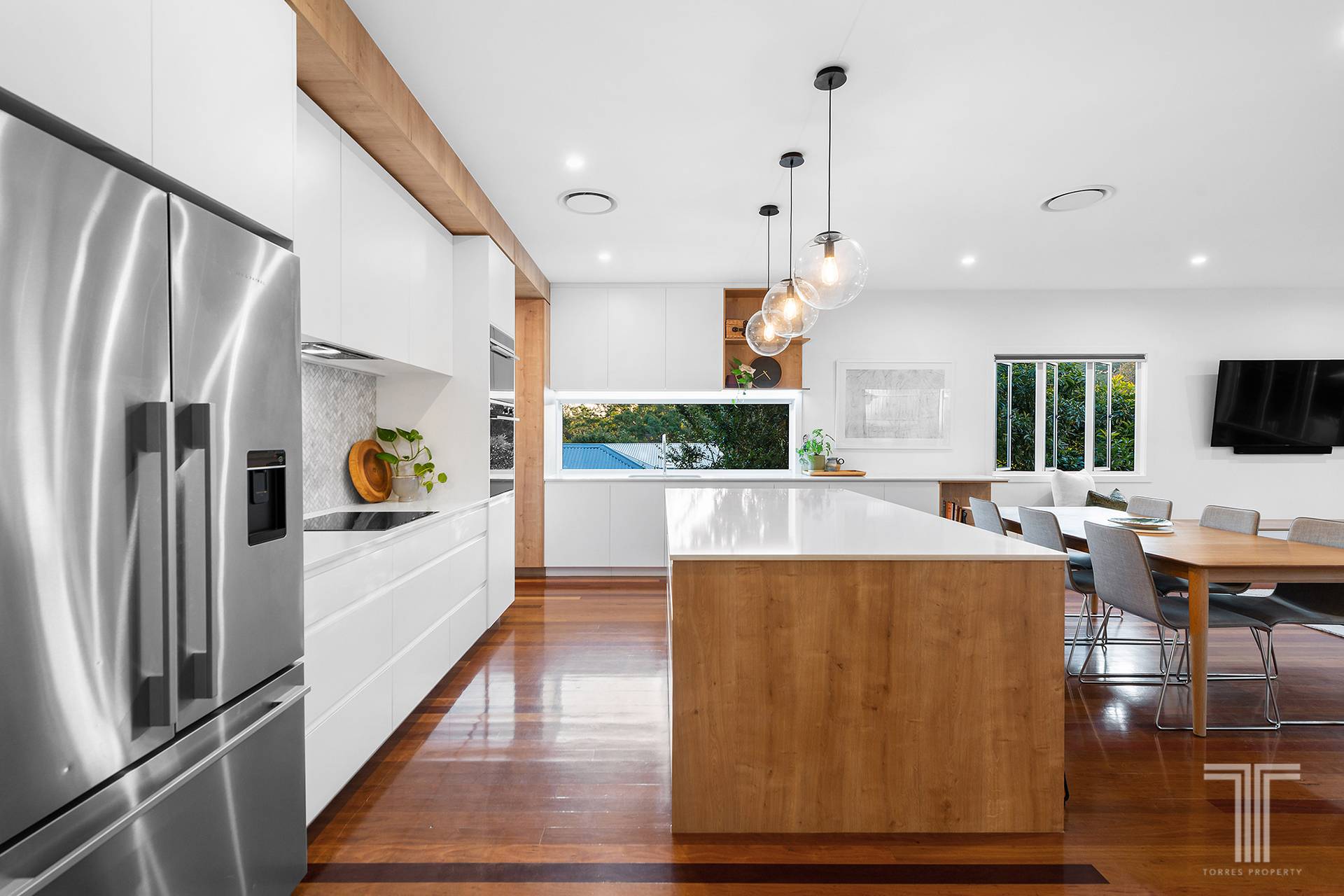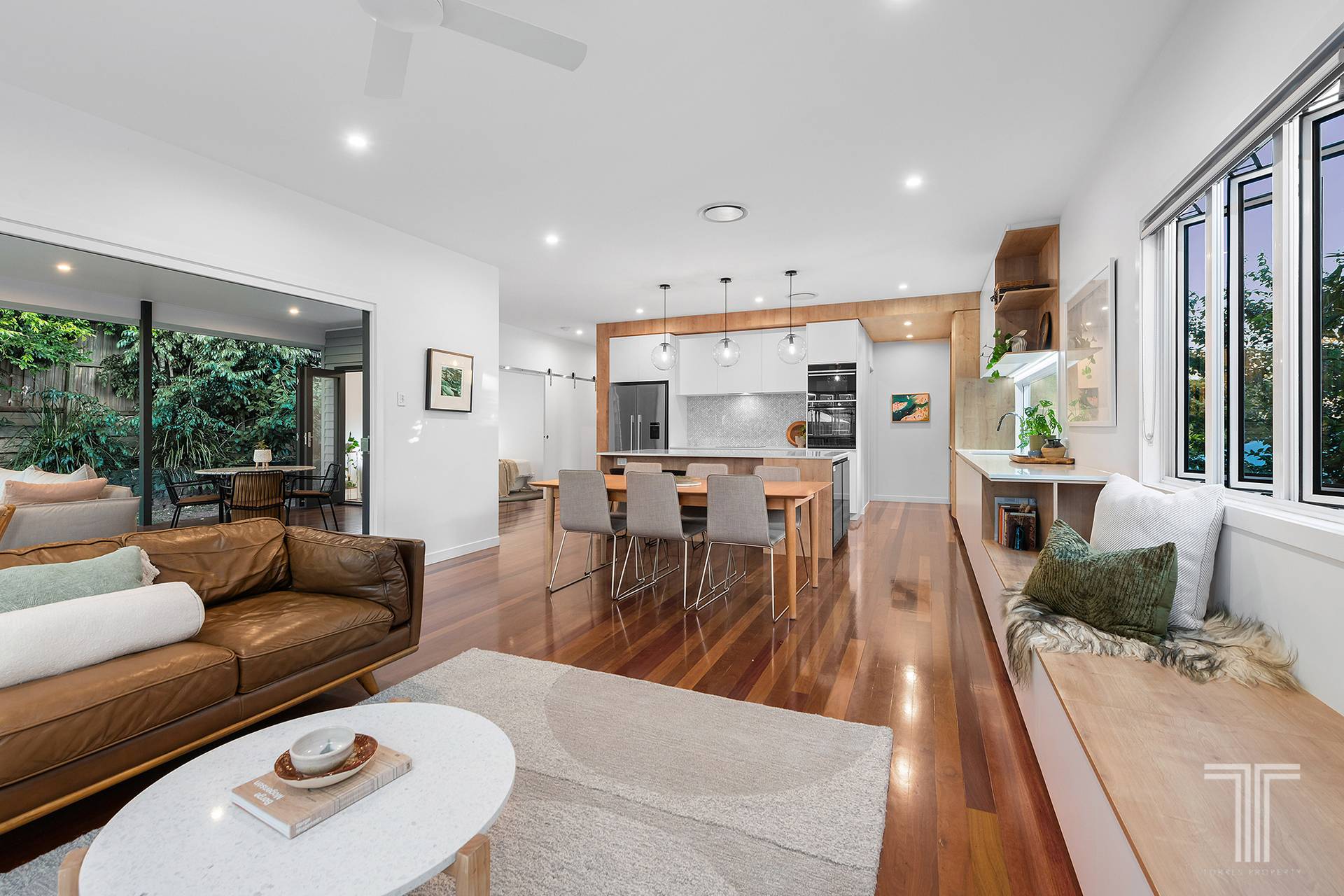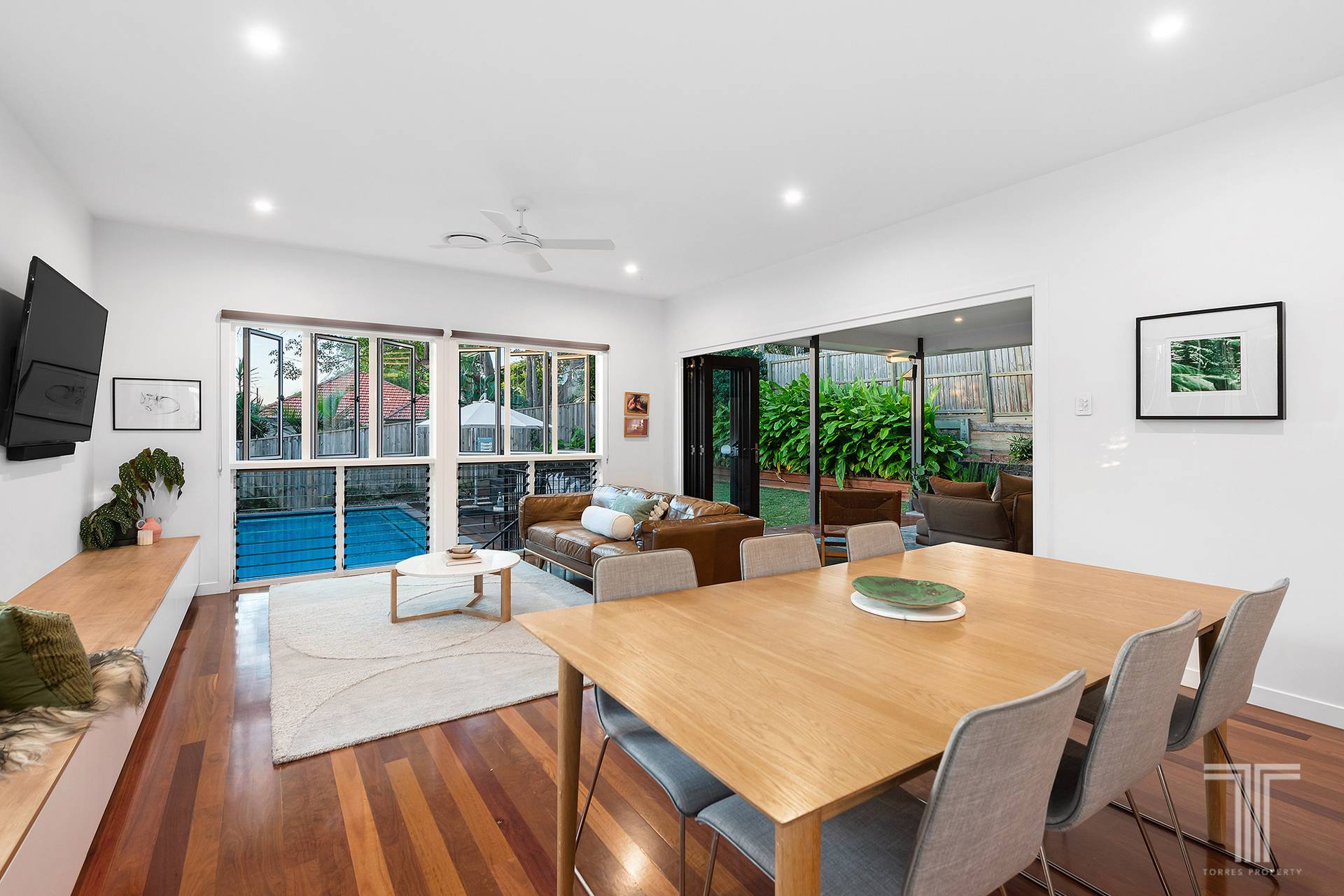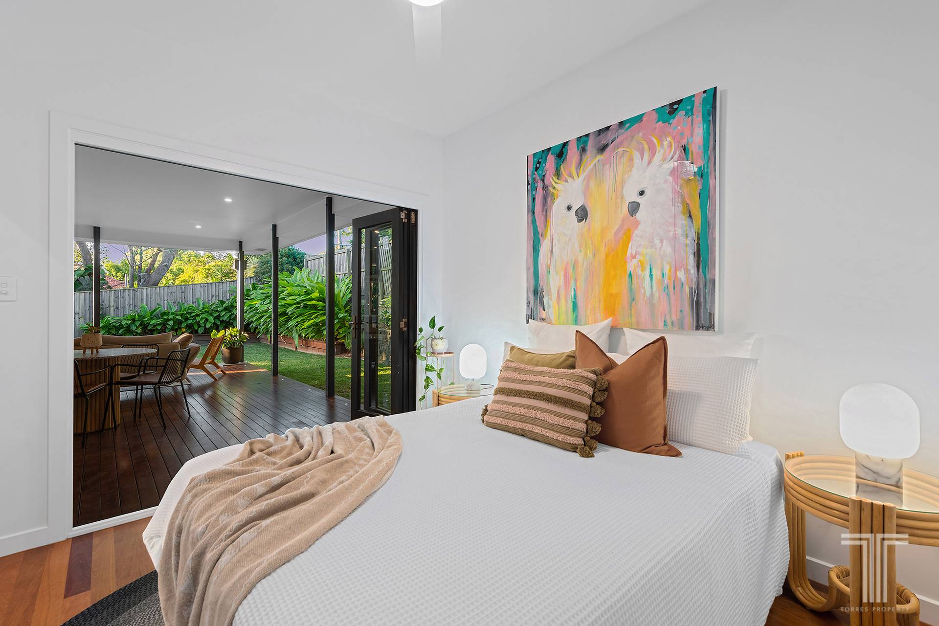 Spanning a single living level, the layout is centred around the spacious lounge and dining area adorned with clean lines, timber floors, built-in joinery and crisp white walls. Rows of windows, louvres and bi-fold doors form a seamless connection to the poolside entertaining area and invite lovely breezes and leafy views that balance the sleek modern design.
