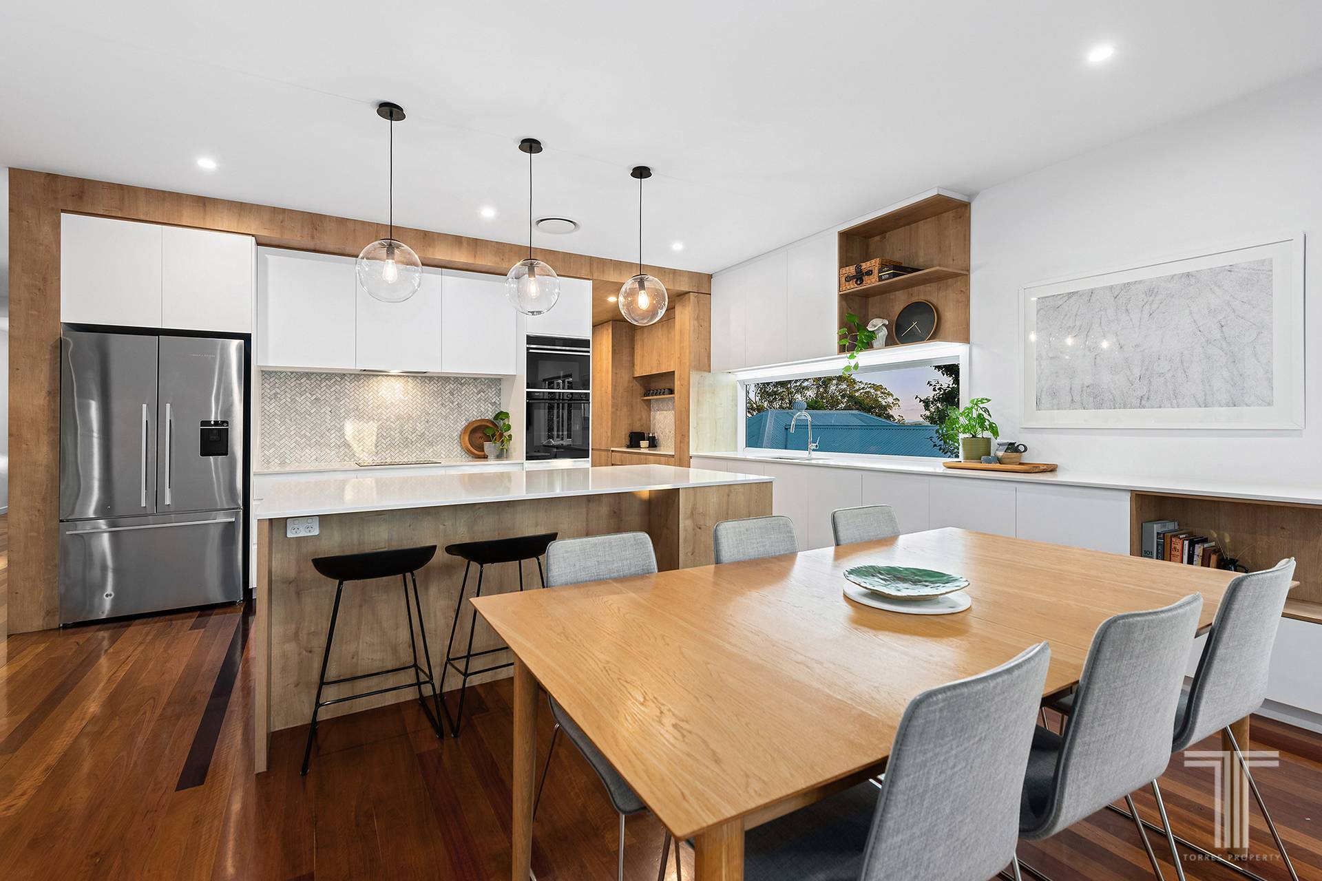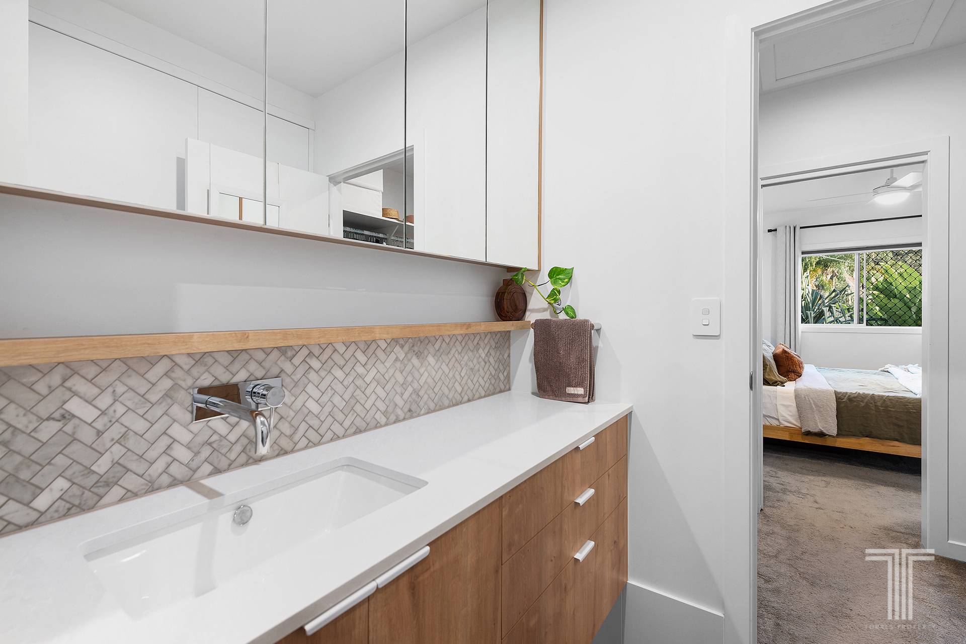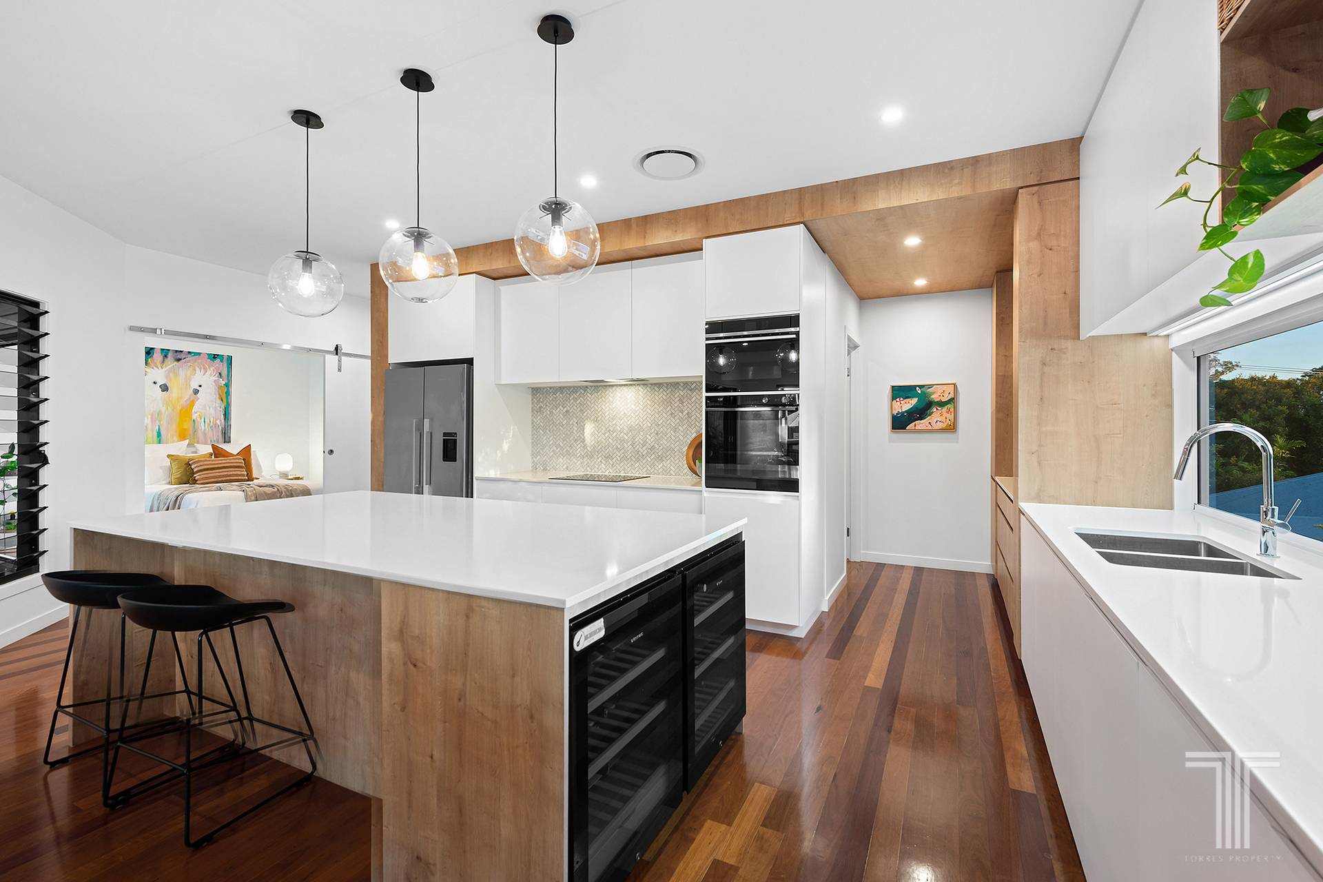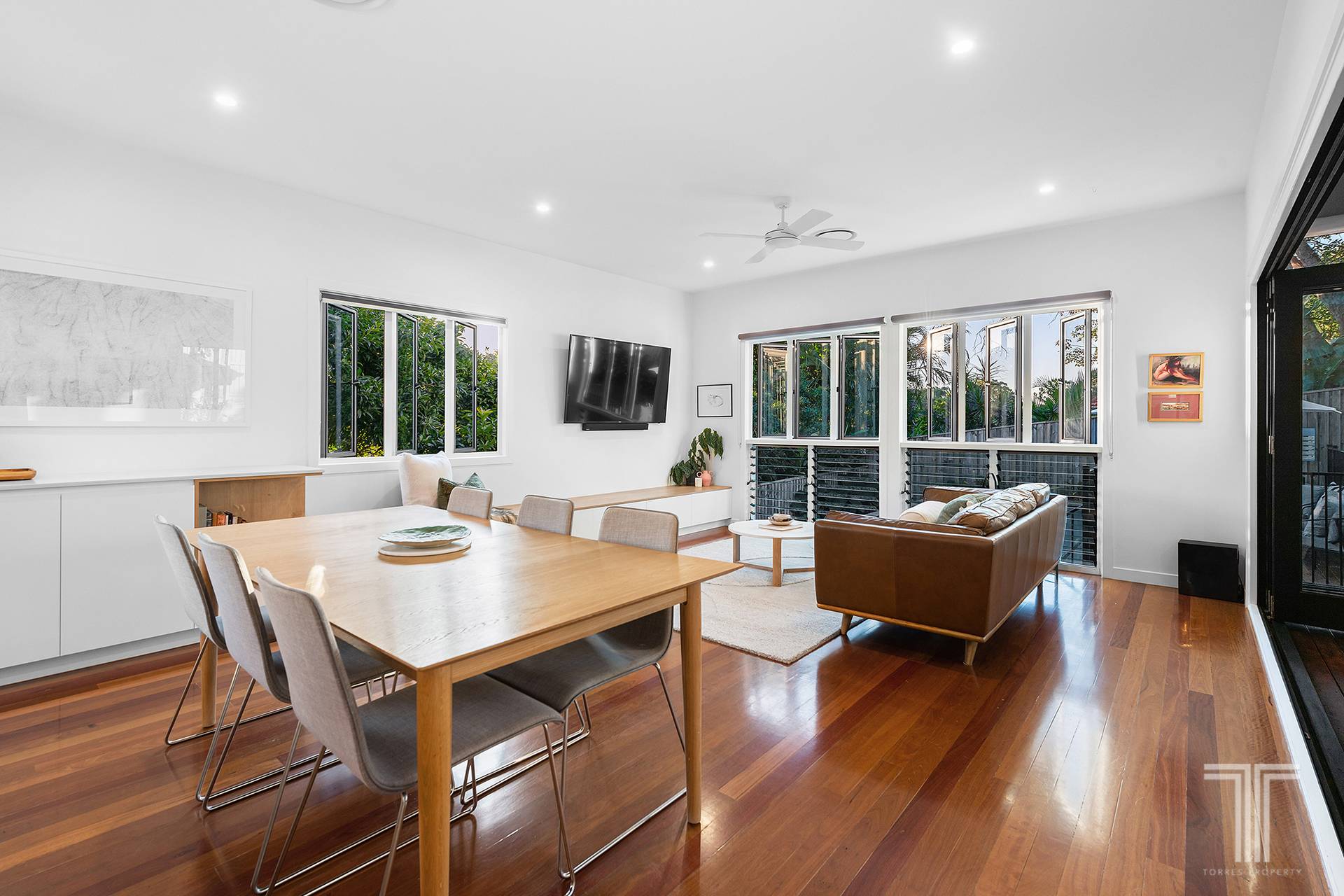 Spanning a single living level, the layout is centred around the spacious lounge and dining area adorned with clean lines, timber floors, built-in joinery and crisp white walls. Rows of windows, louvres and bi-fold doors form a seamless connection to the poolside entertaining area and invite lovely breezes and leafy views that balance the sleek modern design.