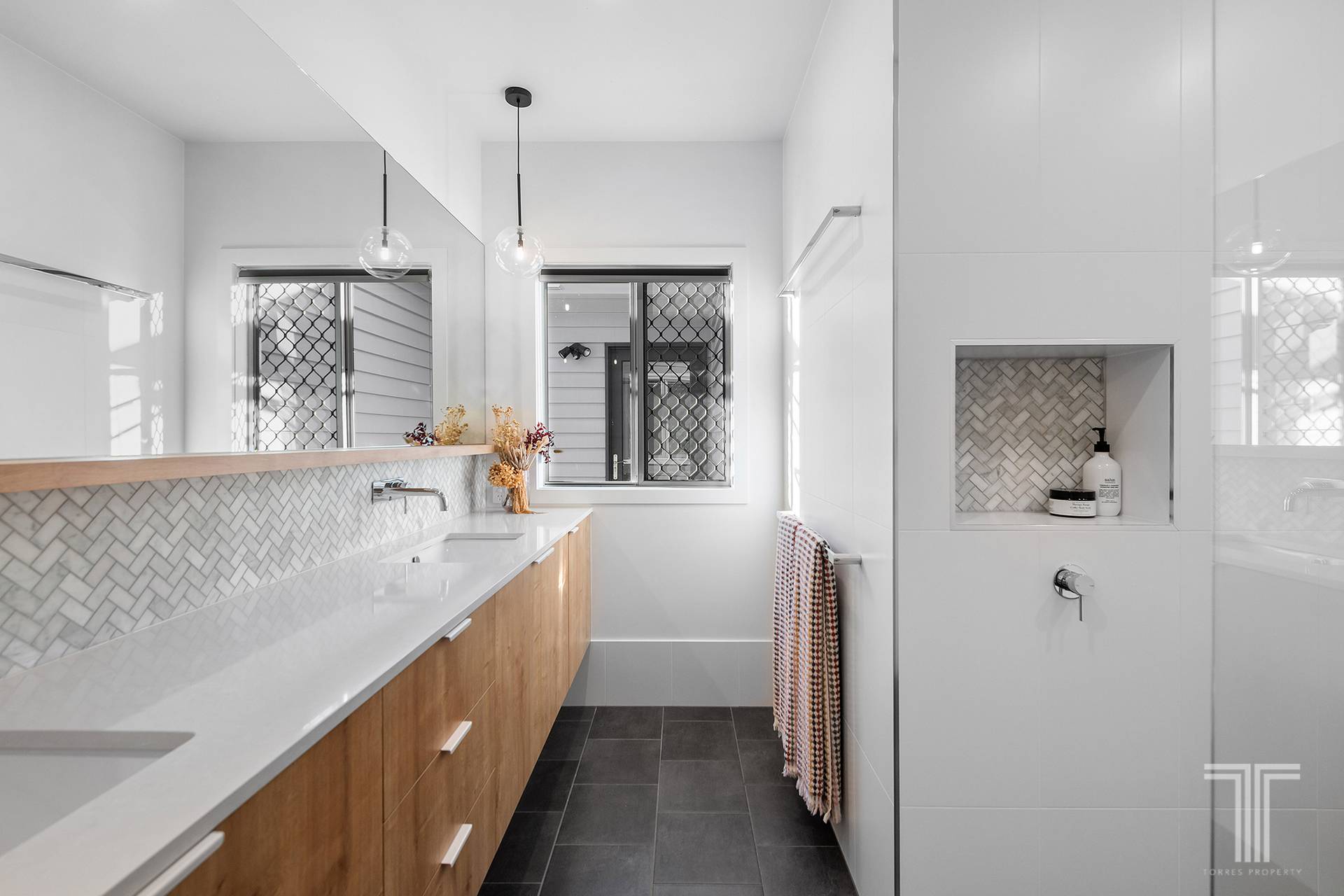 Five bedrooms and two modern bathrooms are located off the central living zone. The gorgeous master suite reveals a walk-in robe and an ensuite adorned with stylish herringbone tiles and a large vanity. The main bathroom boasts a similar design with dual basins and a separate powder room.