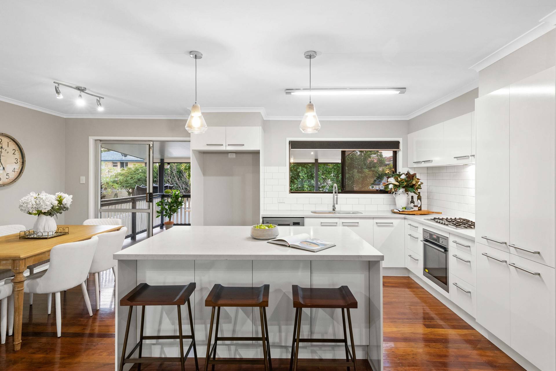Creating spectacular indoor/outdoor flow, the interiors spill out to the front balcony and the north-facing rear deck, which offers a peaceful setting to entertain guests and a staircase leading down to the pet-friendly backyard.