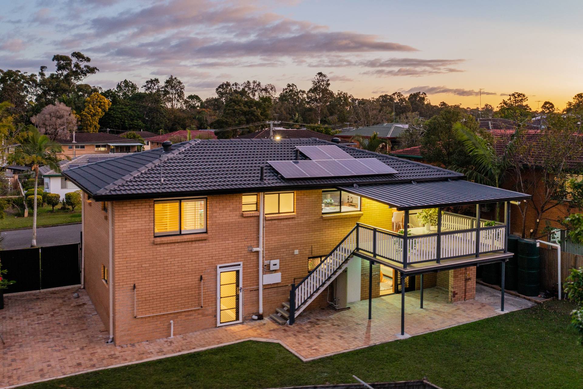 - 5,000L water tank; 7-panel solar; rear garden shed