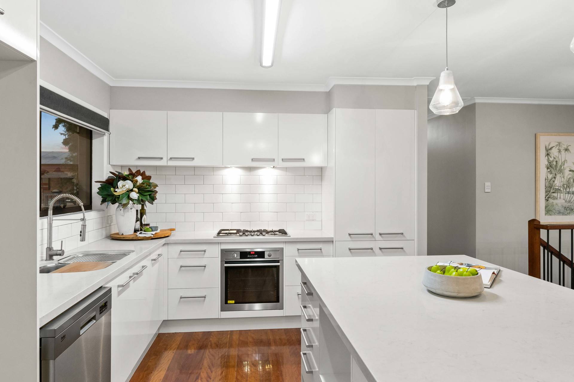 The upstairs lounge and dining area unveils a flowing design adorned with timber floors, air-conditioning, feature lights and lovely cross breezes. The central kitchen integrates seamlessly with this family zone and boasts sleek cabinetry, stainless steel appliances and a large island bench, great for casual dining and entertaining.
