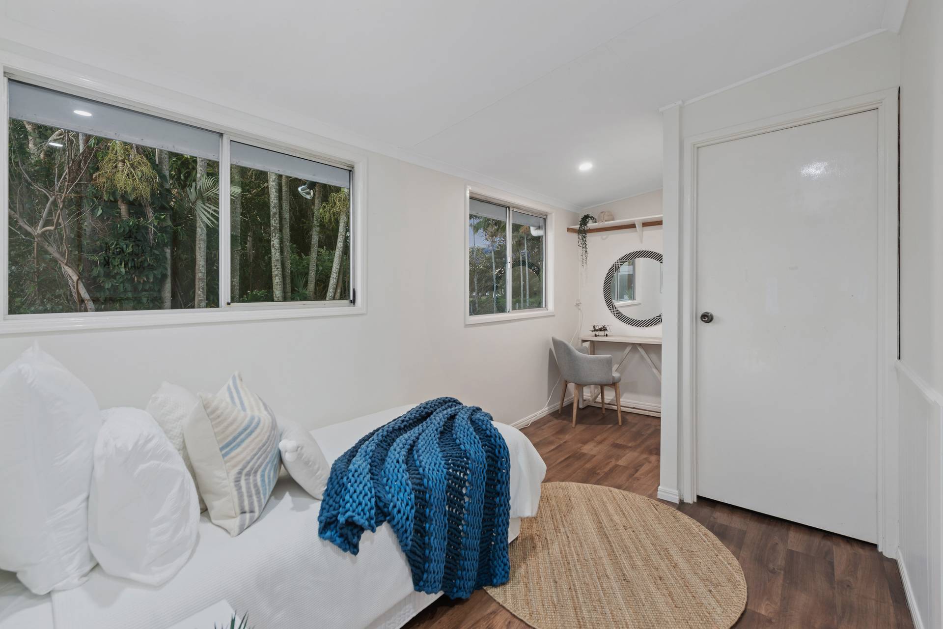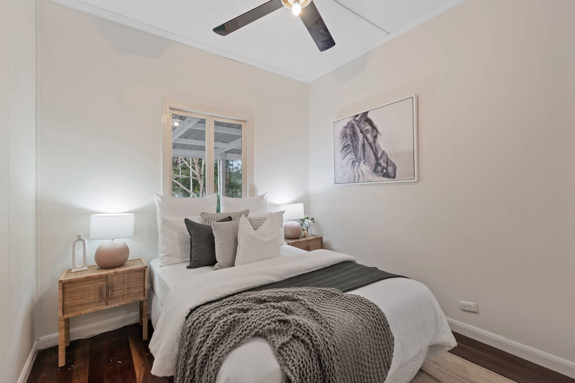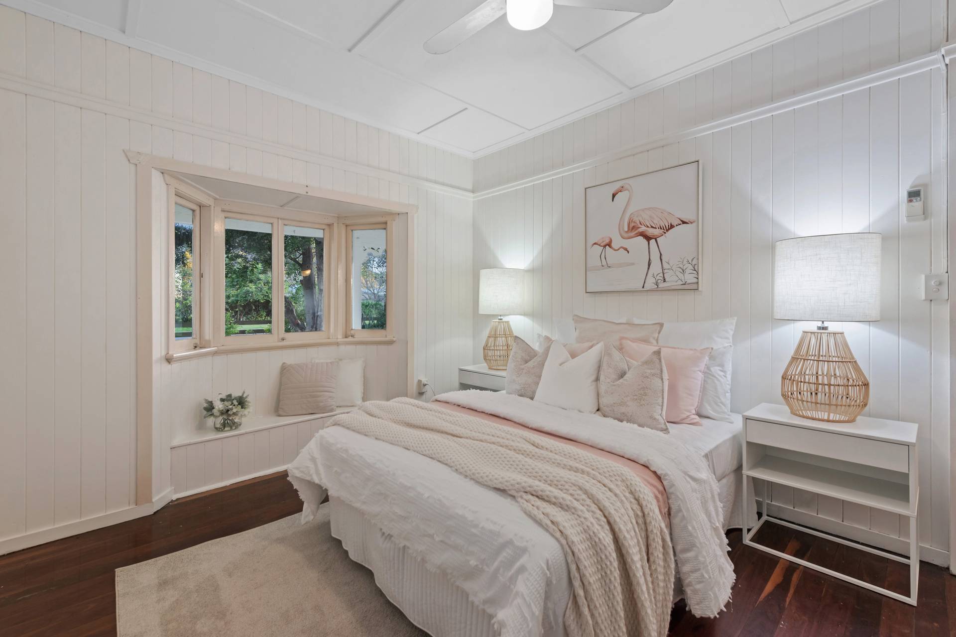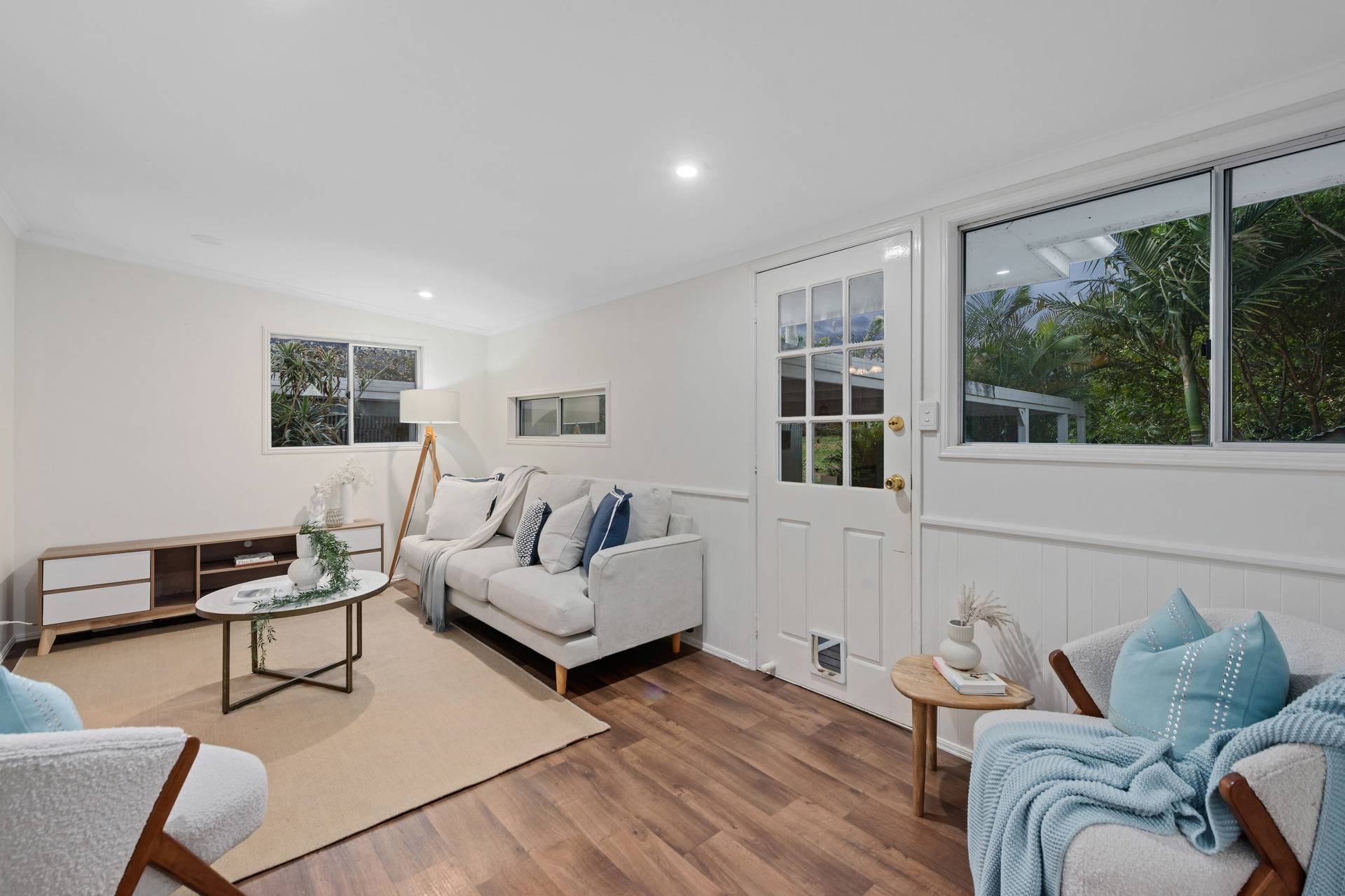 The main residence boasts a family bathroom and four bedrooms, including three with built-in robes. The master features a bay window seat, and the fourth room includes a private toilet. A separate fifth bedroom with a built-in robe and study nook is accessed off the rear patio and provides a private retreat for guests, teenagers or a home office space.