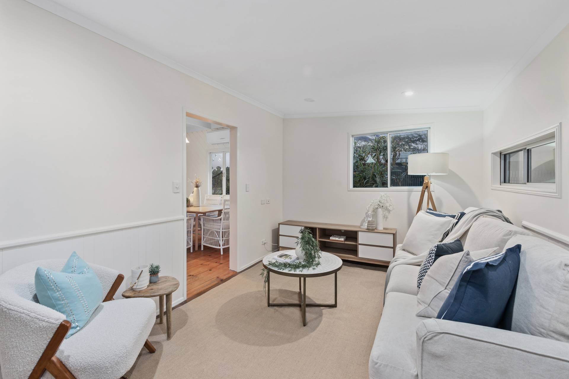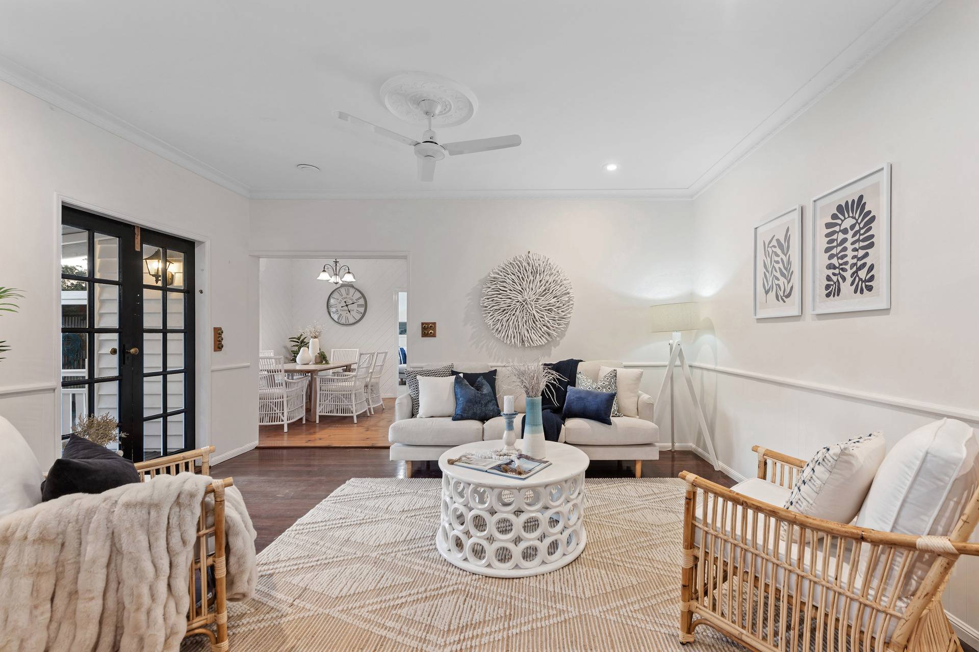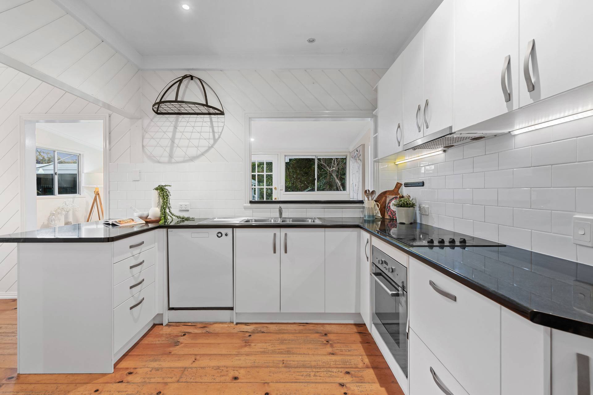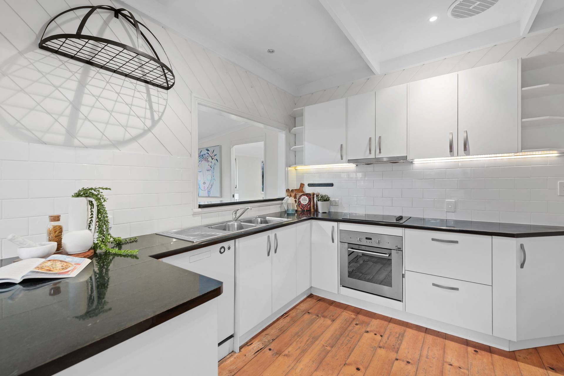 Brimming with charm and period fretwork, the wraparound deck provides entry and a range of entertaining options. Stepping inside, flow from the stylish living area to the dining and family rooms. Well-appointed, the central kitchen reveals a black and white design with a breakfast bar and dishwasher.