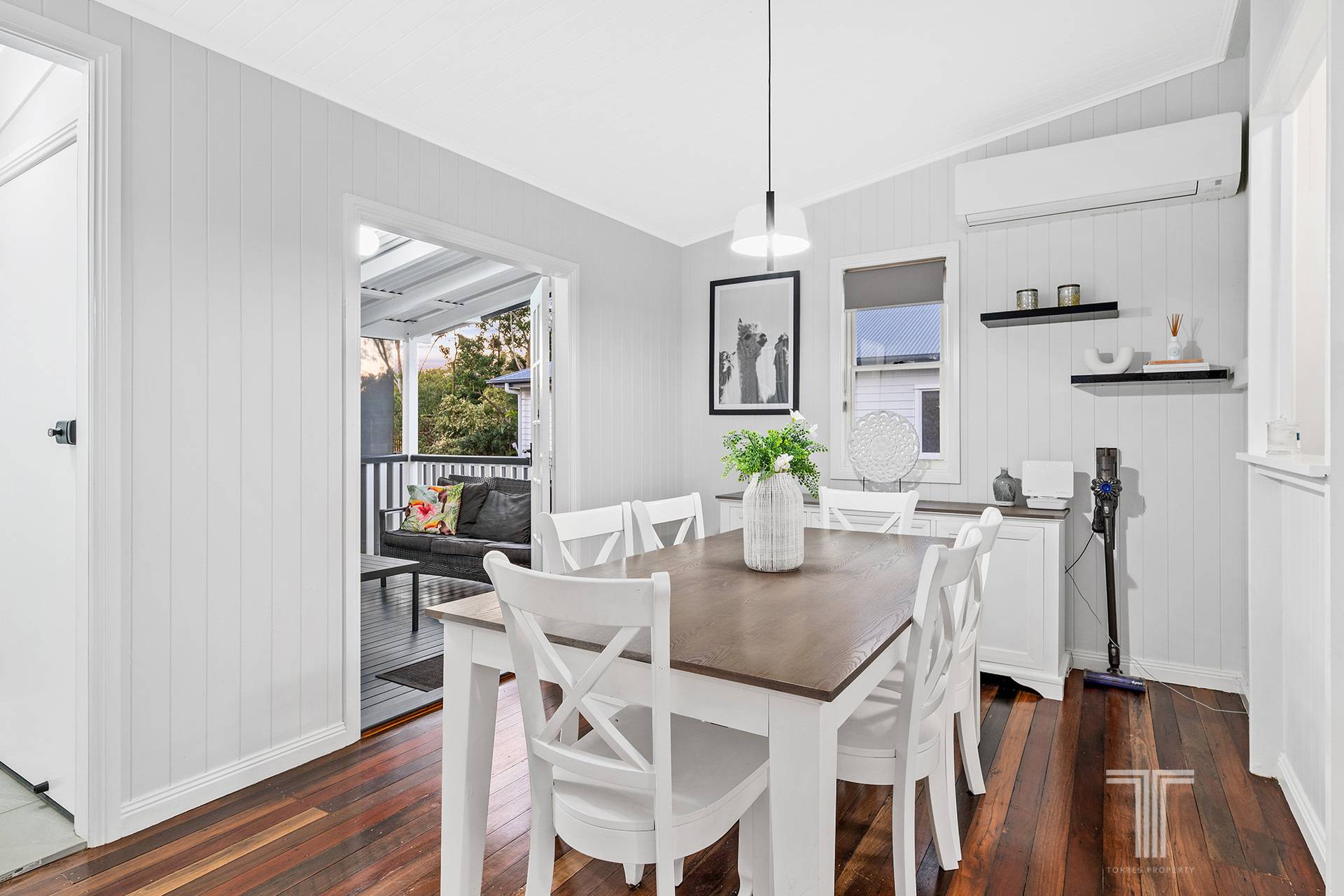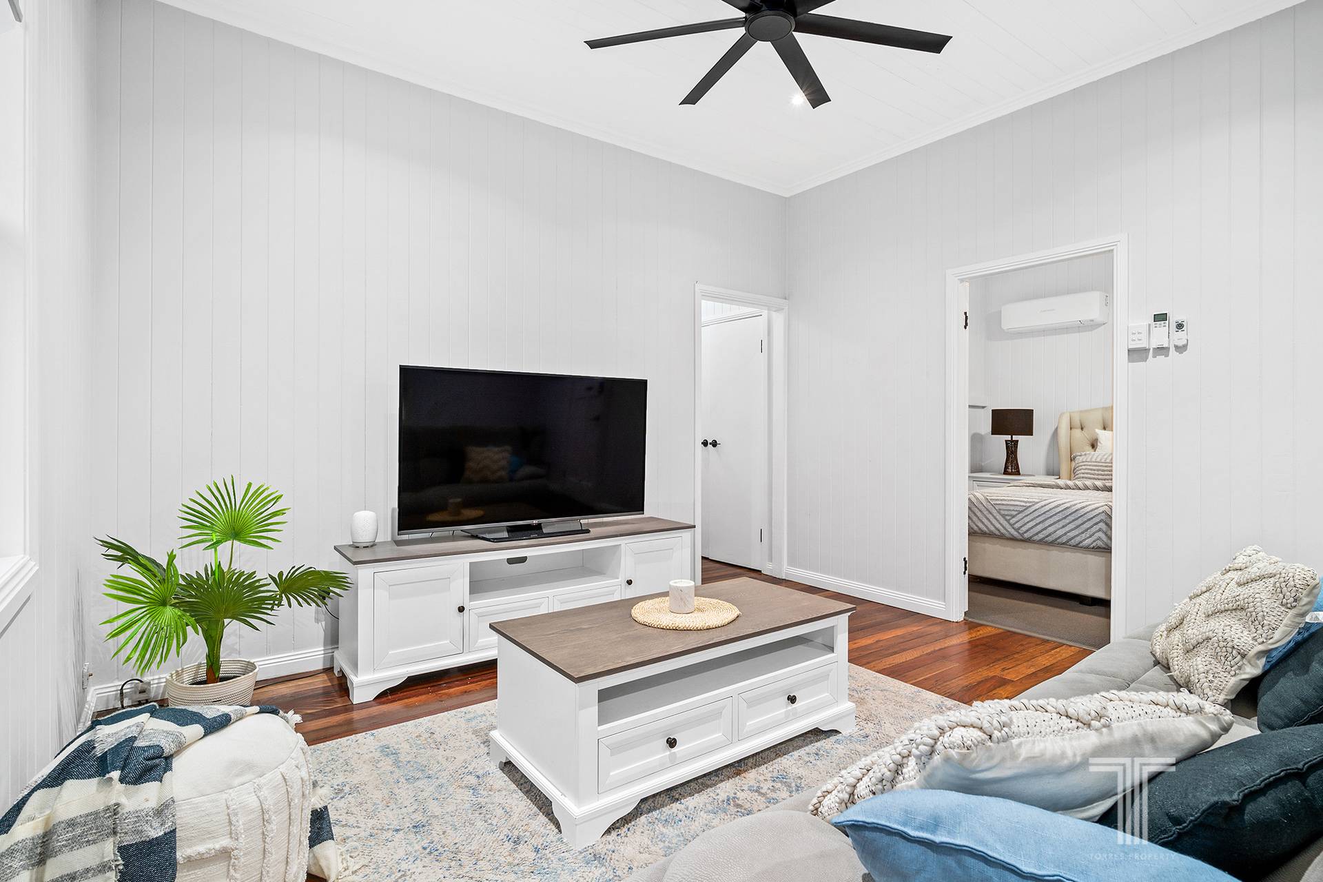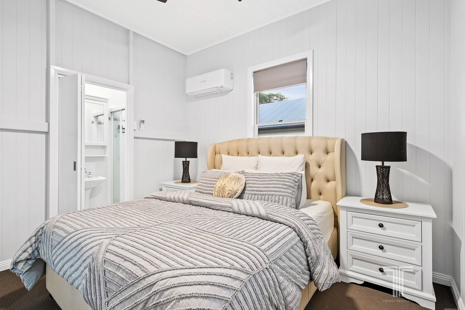 Presenting quintessential character with a contemporary twist, the classic picket fence, timber floors, high ceilings and VJ walls are complemented by the crisp white interiors, matte black ceiling fans and split system air-conditioning.