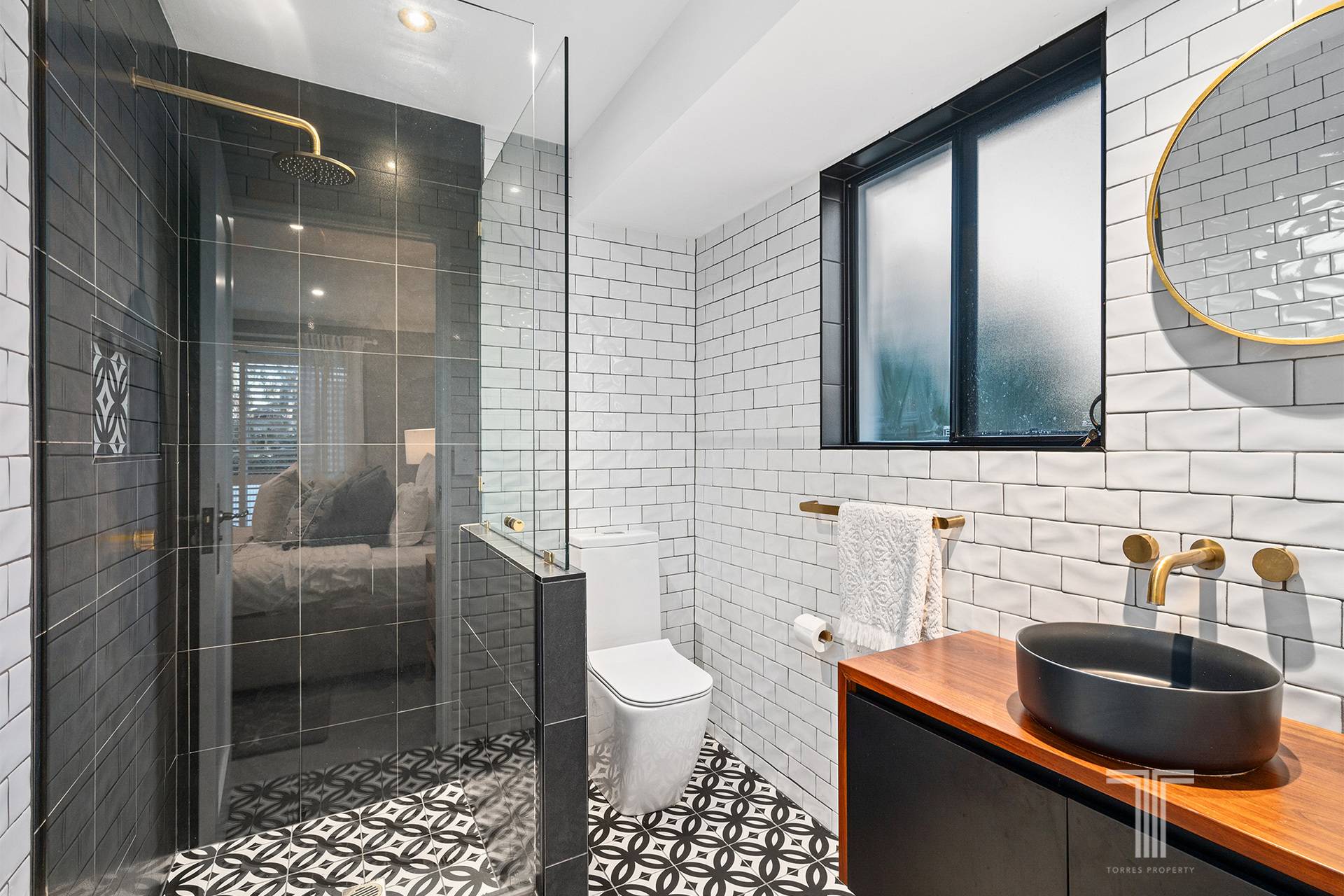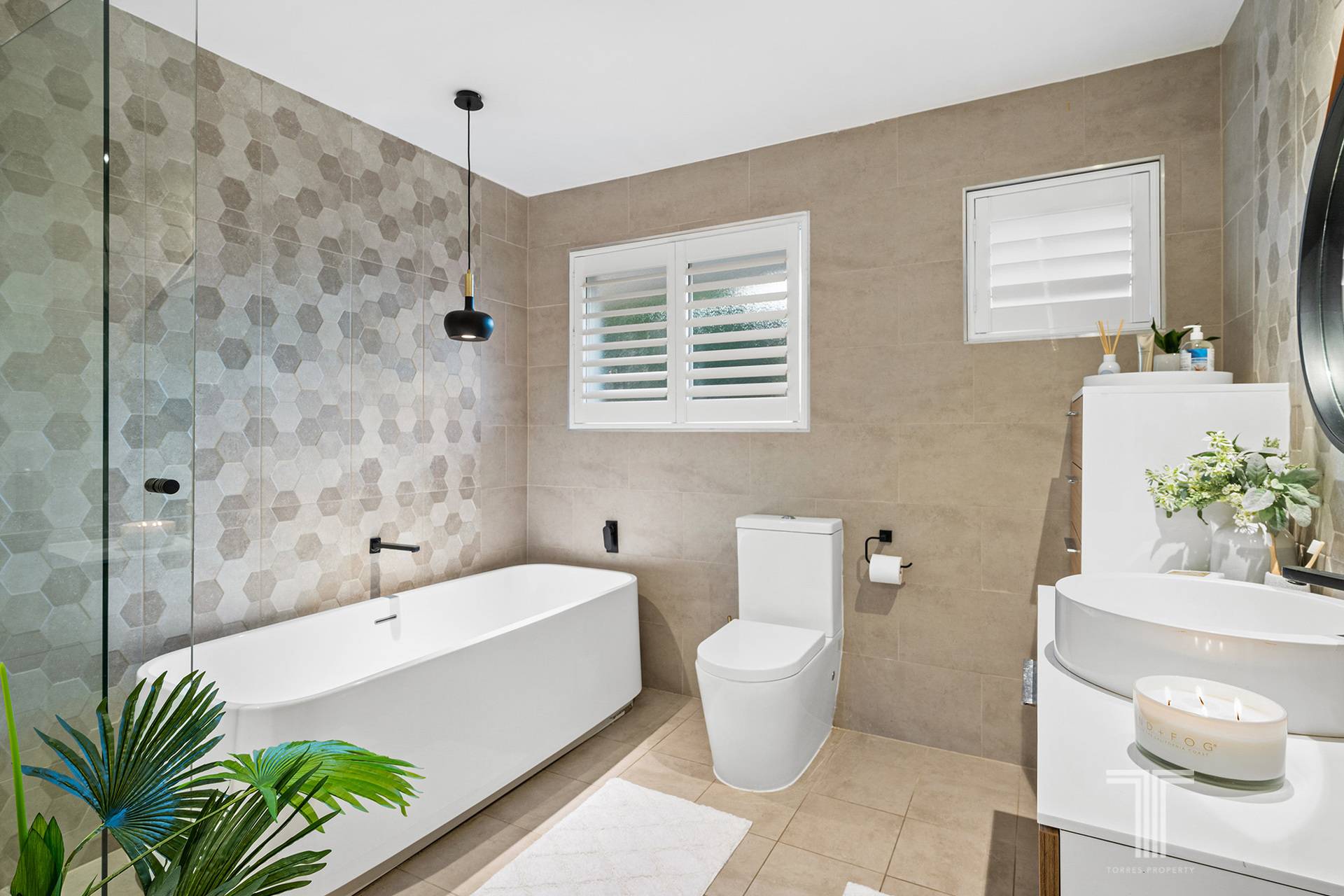 Four bedrooms with built-in robes are serviced by two chic bathrooms. The master reveals a walk-in robe with ample shelving and an exquisite ensuite with beautiful gold fixtures, subway tiles and black and timber accents. The family bathroom includes a luxurious bathtub framed by hexagonal wall tiles.