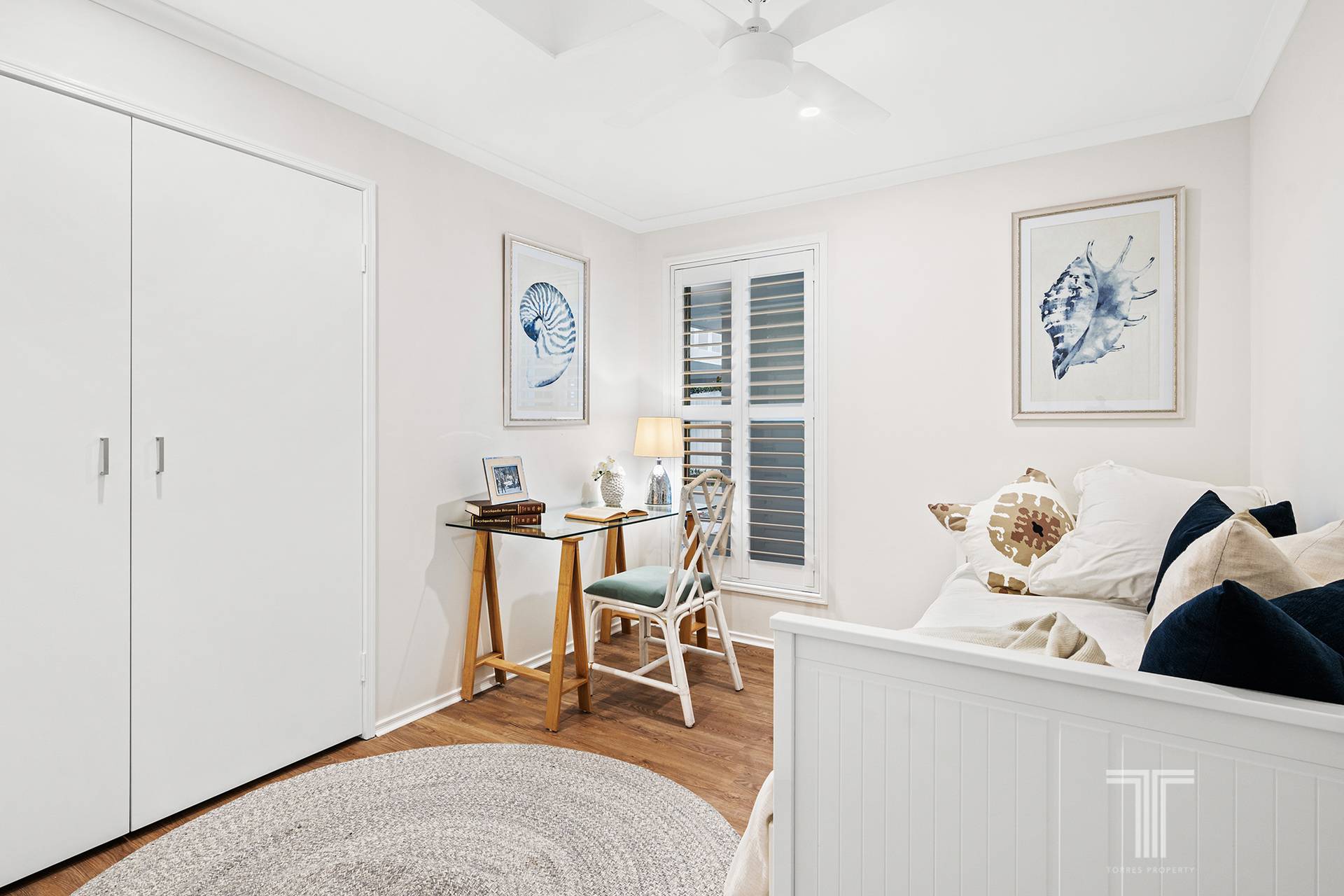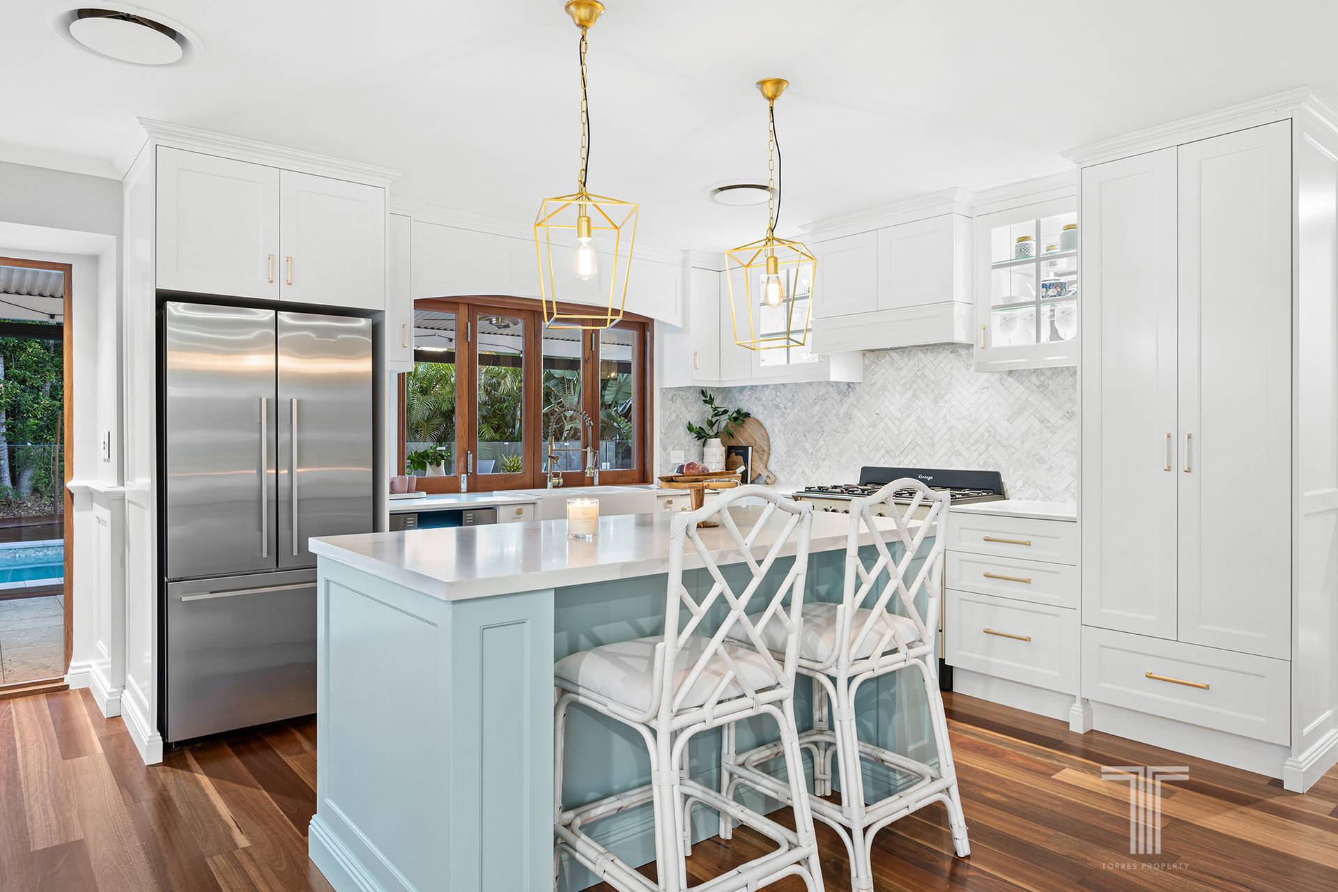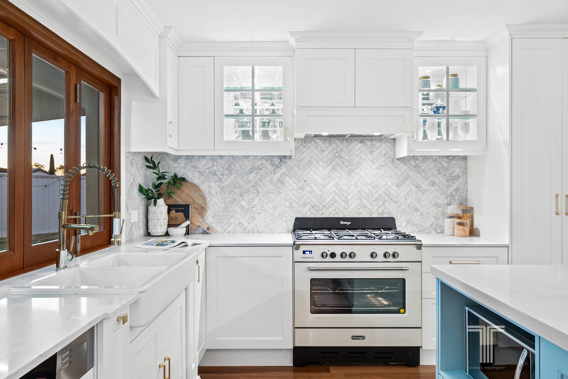Showcasing a low-set Hamptons design, the house is adorned with fresh white tones, brand new floorboards, feature lights and window shutters. Gold accents and pastel tones add a touch of coastal calm, including a baby blue front door and kitchen island bench.